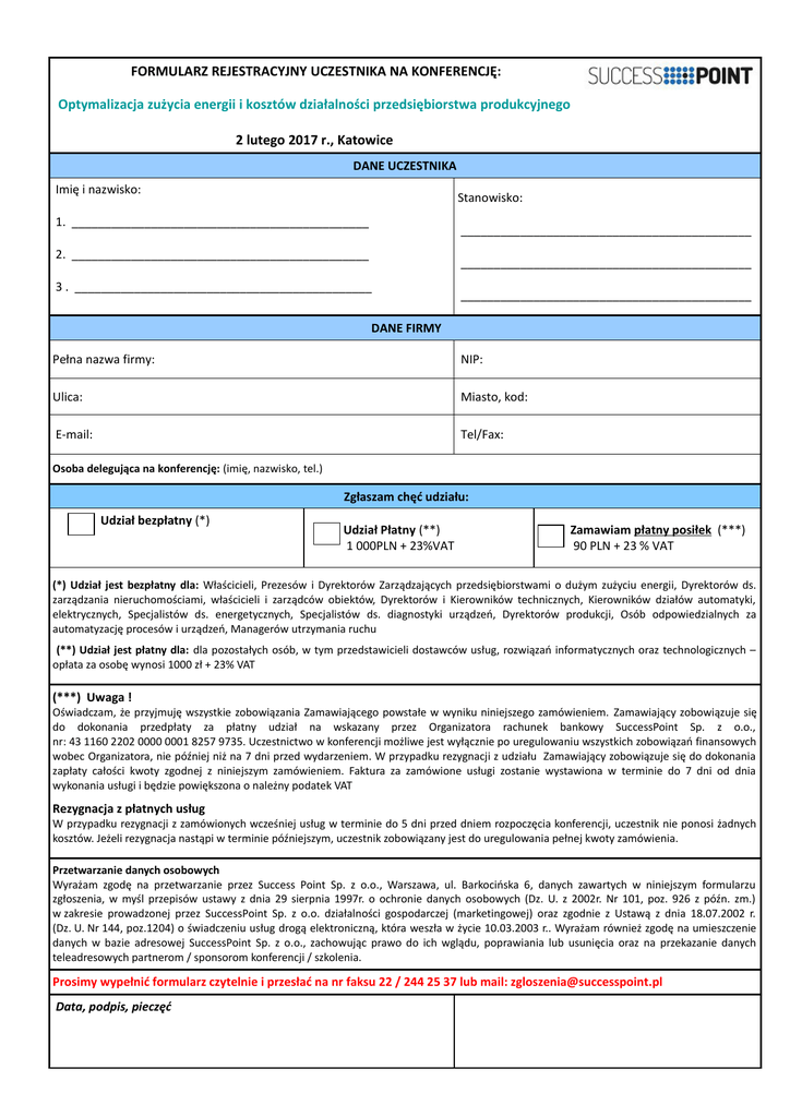 FORMULARZ REJESTRACYJNY UCZESTNIKA NA KONFERENCJĘ: Optymalizacja zużycia energii i kosztów działalności przedsiębiorstwa produkcyjnego 2 lutego 2017 r., Katowice DANE UCZESTNIKA Imię i nazwisko: Stanowisko: 1. _____________________________________________ ____________________________________________ 2. _____________________________________________ ____________________________________________ 3 . _____________________________________________ ____________________________________________ DANE FIRMY Pełna nazwa firmy: NIP: Ulica: Miasto, kod: E-mail: Tel/Fax: Osoba delegująca na konferencję: (imię, nazwisko, tel.) Zgłaszam chęć udziału: Udział bezpłatny (*) Udział Płatny (**) 1 000PLN + 23%VAT Zamawiam płatny posiłek (***) 90 PLN + 23 % VAT (*) Udział jest bezpłatny dla: Właścicieli, Prezesów i Dyrektorów Zarządzających przedsiębiorstwami o dużym zużyciu energii, Dyrektorów ds. zarządzania nieruchomościami, właścicieli i zarządców obiektów, Dyrektorów i Kierowników technicznych, Kierowników działów automatyki, elektrycznych, Specjalistów ds. energetycznych, Specjalistów ds. diagnostyki urządzeń, Dyrektorów produkcji, Osób odpowiedzialnych za automatyzację procesów i urządzeń, Managerów utrzymania ruchu (**) Udział jest płatny dla: dla pozostałych osób, w tym przedstawicieli dostawców usług, rozwiązań informatycznych oraz technologicznych – opłata za osobę wynosi 1000 zł + 23% VAT (***) Uwaga ! Oświadczam, że przyjmuję wszystkie zobowiązania Zamawiającego powstałe w wyniku niniejszego zamówieniem. Zamawiający zobowiązuje się do dokonania przedpłaty za płatny udział na wskazany przez Organizatora rachunek bankowy SuccessPoint Sp. z o.o., nr: 43 1160 2202 0000 0001 8257 9735. Uczestnictwo w konferencji możliwe jest wyłącznie po uregulowaniu wszystkich zobowiązań finansowych wobec Organizatora, nie później niż na 7 dni przed wydarzeniem. W przypadku rezygnacji z udziału Zamawiający zobowiązuje się do dokonania zapłaty całości kwoty zgodnej z niniejszym zamówieniem. Faktura za zamówione usługi zostanie wystawiona w terminie do 7 dni od dnia wykonania usługi i będzie powiększona o należny podatek VAT Rezygnacja z płatnych usług W przypadku rezygnacji z zamówionych wcześniej usług w terminie do 5 dni przed dniem rozpoczęcia konferencji, uczestnik nie ponosi żadnych kosztów. Jeżeli rezygnacja nastąpi w terminie późniejszym, uczestnik zobowiązany jest do uregulowania pełnej kwoty zamówienia. Przetwarzanie danych osobowych Wyrażam zgodę na przetwarzanie przez Success Point Sp. z o.o., Warszawa, ul. Barkocińska 6, danych zawartych w niniejszym formularzu zgłoszenia, w myśl przepisów ustawy z dnia 29 sierpnia 1997r. o ochronie danych osobowych (Dz. U. z 2002r. Nr 101, poz. 926 z późn. zm.) w zakresie prowadzonej przez SuccessPoint Sp. z o.o. działalności gospodarczej (marketingowej) oraz zgodnie z Ustawą z dnia 18.07.2002 r. (Dz. U. Nr 144, poz.1204) o świadczeniu usług drogą elektroniczną, która weszła w życie 10.03.2003 r.. Wyrażam również zgodę na umieszczenie danych w bazie adresowej SuccessPoint Sp. z o.o., zachowując prawo do ich wglądu, poprawiania lub usunięcia oraz na przekazanie danych teleadresowych partnerom / sponsorom konferencji / szkolenia. Prosimy wypełnić formularz czytelnie i przesłać na nr faksu 22 / 244 25 37 lub mail: [email protected] Data, podpis, pieczęć
