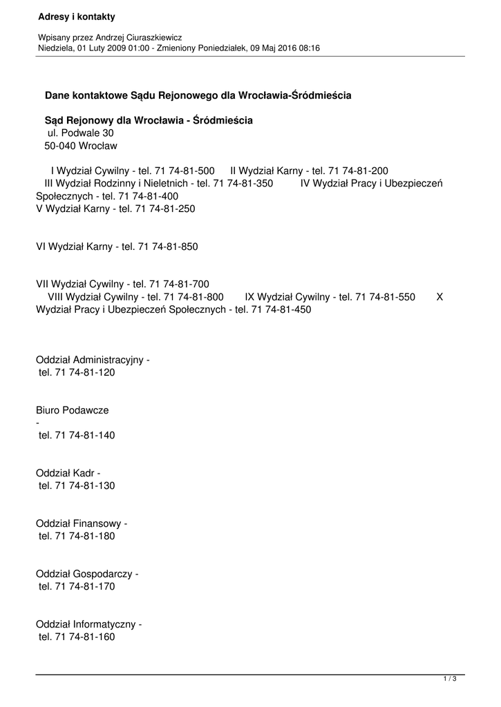 Adresy i kontakty Wpisany przez Andrzej Ciuraszkiewicz Niedziela, 01 Luty 2009 01:00 - Zmieniony Poniedziałek, 09 Maj 2016 08:16 Dane kontaktowe Sądu Rejonowego dla Wrocławia-Śródmieścia Sąd Rejonowy dla Wrocławia - Śródmieścia ul. Podwale 30 50-040 Wrocław I Wydział Cywilny - tel. 71 74-81-500 II Wydział Karny - tel. 71 74-81-200 III Wydział Rodzinny i Nieletnich - tel. 71 74-81-350 IV Wydział Pracy i Ubezpieczeń Społecznych - tel. 71 74-81-400 V Wydział Karny - tel. 71 74-81-250 VI Wydział Karny - tel. 71 74-81-850 VII Wydział Cywilny - tel. 71 74-81-700 VIII Wydział Cywilny - tel. 71 74-81-800 IX Wydział Cywilny - tel. 71 74-81-550 Wydział Pracy i Ubezpieczeń Społecznych - tel. 71 74-81-450 X Oddział Administracyjny tel. 71 74-81-120 Biuro Podawcze tel. 71 74-81-140 Oddział Kadr tel. 71 74-81-130 Oddział Finansowy tel. 71 74-81-180 Oddział Gospodarczy tel. 71 74-81-170 Oddział Informatyczny tel. 71 74-81-160 1/3 Adresy i kontakty Wpisany przez Andrzej Ciuraszkiewicz Niedziela, 01 Luty 2009 01:00 - Zmieniony Poniedziałek, 09 Maj 2016 08:16 I Zespół Kuratorskiej Służby Sądowej do Wykonywania Orzeczeń w Sprawach Rodzinnych - tel. 71 74-81-930 Sąd Rejonowy dla Wrocławia - Śródmieścia pl. Powstańców Śl. 14 53-314 Wrocław III Wydział Rodzinny i Nieletnich - tel. 71 74-81-350 Społecznych - tel. 71 74-81-400 IV Wydział Pracy i Ubezpieczeń X Wydział Pracy i Ubezpieczeń Społecznych - tel. 71 74-81-450 Biuro Podawcze 2 tel. 71 74-81-155 I Zespół Kuratorskiej Służby Sądowej do Wykonywania Orzeczeń w Sprawach Rodzinnych - tel. 71 74-81-930 Sąd Rejonowy dla Wrocławia - Śródmieścia ul. Tkacka 6-8 54-138 Wrocław 2/3 Adresy i kontakty Wpisany przez Andrzej Ciuraszkiewicz Niedziela, 01 Luty 2009 01:00 - Zmieniony Poniedziałek, 09 Maj 2016 08:16 II Zespół Kuratorskiej Służby Sądowej do Wykonywania Orzeczeń w Sprawach Karnych - tel. 71 74-81-900 III Zespół Kuratorskiej Służby Sądowej do Wykonywania Orzeczeń w Sprawach Karnych - tel . 71 74-81-900 NIP 896-10-03-972 3/3
