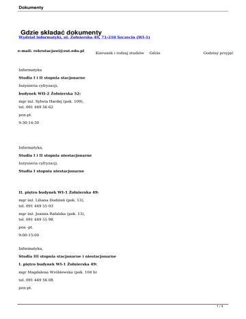 Dokumenty Gdzie składać dokumenty Wydział Informatyki, ul. Żołnierska 49, 71-210 Szczecin (WI-1) e-mail: [email protected] Kierunek i rodzaj studiów Gdzie Godziny przyjęć Informatyka Studia I i II stopnia stacjonarne Inżynieria cyfryzacji, budynek WII-2 Żołnierska 52: mgr inż. Sylwia Hardej (pok. 109), tel. 091 449 56 62 pon-pt. 9:30-14:30 Informatyka, Studia I i II stopnia niestacjonarne Inżynieria cyfryzacji, Studia I stopnia niestacjonarne II. piętro budynek WI-1 Żołnierska 49: mgr inż. Liliana Dudzień (pok. 13), tel. 091 449 55 03 mgr inż. Joanna Rafalska (pok. 13), tel. 091 449 55 98 pon -pt. 9:00-15:00 Informatyka, Studia III stopnia stacjonarne i niestacjonarne I. piętro budynek WI-1 Żołnierska 49: mgr Magdalena Wróblewska (pok. 104 b) tel. 091 449 56 08 pon-pt. 1/4 Dokumenty 10:00-13:00 Studia I stopnia Kandydat zakwalifikowany do przyjęcia na studia pierwszego stopnia zobowiązany jest złożyć następujący komplet dokumentów: 1. ankietę osobową wydruk elektronicznego formularza podania na studia z podpisem kandydata, 2. kopię świadectwa dojrzałości (oryginał dokumentu do wglądu Wydziałowej Komisji Rekrutacyjnej), z tym że: a) kandydat z „nową maturą”, który podwyższył wynik egzaminu maturalnego lub zdawał egzamin maturalny z przedmiotów dodatkowych – składa także aneks do świadectwa dojrzałości, b) kandydat ze statusem Matury Międzynarodowej (International Baccalaureate) – jeżeli w momencie składania dokumentów nie posiada jeszcze świadectwa dojrzałości, składa zaświadczenie ze szkoły o zdaniu egzaminu dojrzałości zawierające informację o uzyskanych wynikach, a także pisemne oświadczenie o zobowiązaniu się dostarczenie kopii świadectwa w późniejszym terminie, ustalonym przez komisję terminie 3. zaświadczenie od lekarza medycyny pracy, stwierdzające brak przeciwwskazań u kandydata do podjęcia studiów na obranym kierunku, zgodnie z obowiązującymi uregulowaniami Ministerstwa Zdrowia (o ile na danym kierunku wymagane, skierowanie na badania lekarskie będzie można pobrać w siedzibie wydziałowej komisji rekrutacyjnej odpowiedniej dla danego kierunku), 4. kserokopię dowodu osobistego lub innego dokumentu potwierdzającego tożsamość kandydata na studia, np. paszportu w przypadku kandydata będącego cudzoziemcem (oryginała dokumentu do wglądu Wydziałowej Komisji Rekrutacyjnej), 5. dwie fotografie o wymiarach 35 x 45 mm, na jasnym tle, bez nakrycia głowy (podpisane: imieniem, nazwiskiem i nr PESEL), 6. dowód wpłaty opłaty rekrutacyjnej, 7. oświadczenie o gotowości podjęcia studiów wraz z oświadczeniem kandydata o kontynuowaniu lub ukończeniu studiów na innych kierunkach studiów stacjonarnych w uczelni publicznej (wydruk z Internetowego Systemu Rekrutacyjnego), 8. zaświadczenie o złożenia kompletu dokumentów (wydruk z Internetowego Systemu Rekrutacyjnego), 9. zaświadczenie wydane przez komitet organizacyjny olimpiady, konkursu – laureaci, finaliści olimpiad szczebla centralnego, laureaci konkursów międzynarodowych oraz ogólnopolskich. UWAGA elektroniczny formularz (ankieta osobowa), oświadczenie o gotowości podjęcia studiów wraz z oświadczeniem kandydata o kontynuowaniu lub ukończeniu studiów na innych kierunkach studiów stacjonarnych w uczelni publicznej, zaświadczenie złożenia kompletu dokumentów można wydrukować z Internetowego Systemu Rekrutacji dopiero po ogłoszeniu list kandydatów zakwalifikowanych na studia. 2/4 Dokumenty Studia II stopnia Kandydat zakwalifikowany do przyjęcia na studia drugiego stopnia zobowiązany jest złożyć, oprócz dokumentów wymienionych w ust. 1, dodatkowo: 1. kopię dyplomu ukończenia studiów inżynierskich lub magisterskich – oryginał do wglądu wydziałowej komisji rekrutacyjnej oraz suplement lub wypis z przebiegu studiów (ewentualnie zaświadczenie z uczelni o złożeniu egzaminu dyplomowego), 2. zaświadczenie o średniej ocen z toku studiów, 3. suplement, kartę przebiegu studiów, indeks lub wyciąg z indeksu (potwierdzone przez macierzystą uczelnię) – w przypadku kandydatów nieposiadających suplementu. UWAGA elektroniczny formularz (ankieta osobowa), oświadczenie o gotowości podjęcia studiów wraz z oświadczeniem kandydata o kontynuowaniu lub ukończeniu studiów na innych kierunkach studiów stacjonarnych w uczelni publicznej, zaświadczenie złożenia kompletu dokumentów można wydrukować z Internetowego Systemu Rekrutacji dopiero po ogłoszeniu list kandydatów zakwalifikowanych na studia. Studia III stopnia Kandydaci na studia trzeciego stopnia powinni dostarczyć: 1. Podanie na studia III stopnia (pobierz), 2. odpis dyplomu ukończenia jednolitych studiów magisterskich lub studiów II stopnia, 3. suplement do dyplomu ukończenia studiów magisterskich lub studiów I i II stopnia albo wyciąg z indeksu (indeksów) potwierdzony przez macierzystą szkołę wyższą, 4. zaświadczenie potwierdzające oceny za pracę dyplomową magisterską i egzamin dyplomowy magisterski wydane przez dziekanat wydziału, na którym kandydat ukończył jednolite studia magisterskie lub studia II stopnia (zaświadczenie nie jest wymagane w przypadku, gdy oceny są zamieszczone w indeksie), 5. życiorys, 6. trzy fotografie o wymiarach 35 x 45 mm, na jasnym tle, bez nakrycia głowy (podpisane: imieniem, nazwiskiem i nr PESEL), 7. kwestionariusz osobowy (pobierz), 8. podanie o miejsce w domu studenckim (o ile kandydat się o nie ubiega), 9. orzeczenie lekarskie stwierdzające brak przeciwwskazań do podjęcia studiów, 10. informację o dotychczasowej pracy naukowej, dydaktycznej, zawodowej oraz ewentualny wykaz publikacji, 3/4 Dokumenty 11. propozycję zakresu tematycznego, w którym kandydat chce realizować pracę doktorską (zgodnego z dyscypliną nauki studiów doktoranckich). 4/4