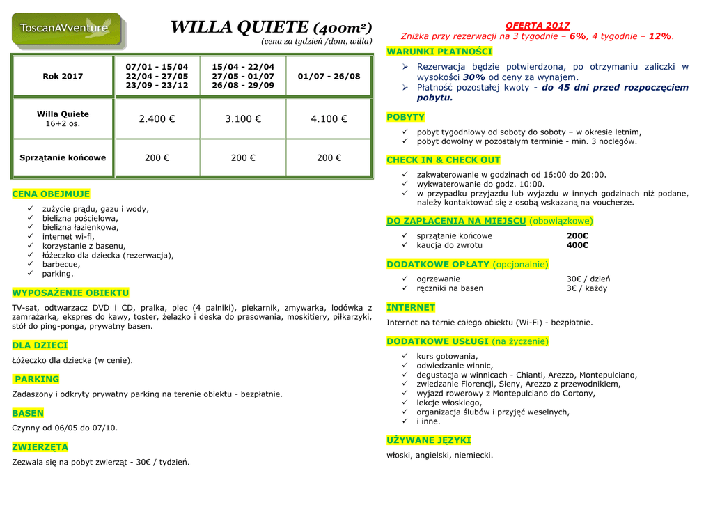 WILLA QUIETE (400m2) (cena za tydzień /dom, willa) OFERTA 2017 Zniżka przy rezerwacji na 3 tygodnie – 6%, 4 tygodnie – 12%. WARUNKI PŁATNOŚCI Rok 2017 07/01 - 15/04 22/04 - 27/05 23/09 - 23/12 15/04 - 22/04 27/05 - 01/07 26/08 - 29/09 01/07 - 26/08 2.400 € 3.100 € 4.100 € Willa Quiete 16+2 os. POBYTY Sprzątanie końcowe 200 € 200 € 200 € CENA OBEJMUJE zużycie prądu, gazu i wody, bielizna pościelowa, bielizna łazienkowa, internet wi-fi, korzystanie z basenu, łóżeczko dla dziecka (rezerwacja), barbecue, parking. WYPOSAŻENIE OBIEKTU TV-sat, odtwarzacz DVD i CD, pralka, piec (4 palniki), piekarnik, zmywarka, lodówka z zamrażarką, ekspres do kawy, toster, żelazko i deska do prasowania, moskitiery, piłkarzyki, stół do ping-ponga, prywatny basen. DLA DZIECI Łóżeczko dla dziecka (w cenie). PARKING Zadaszony i odkryty prywatny parking na terenie obiektu - bezpłatnie. BASEN Czynny od 06/05 do 07/10. ZWIERZĘTA Zezwala się na pobyt zwierząt - 30€ / tydzień. Rezerwacja będzie potwierdzona, po otrzymaniu zaliczki w wysokości 30% od ceny za wynajem. Płatność pozostałej kwoty - do 45 dni przed rozpoczęciem pobytu. pobyt tygodniowy od soboty do soboty – w okresie letnim, pobyt dowolny w pozostałym terminie - min. 3 noclegów. CHECK IN & CHECK OUT zakwaterowanie w godzinach od 16:00 do 20:00. wykwaterowanie do godz. 10:00. w przypadku przyjazdu lub wyjazdu w innych godzinach niż podane, należy kontaktować się z osobą wskazaną na voucherze. DO ZAPŁACENIA NA MIEJSCU (obowiązkowe) sprzątanie końcowe kaucja do zwrotu 200€ 400€ DODATKOWE OPŁATY (opcjonalnie) ogrzewanie ręczniki na basen 30€ / dzień 3€ / każdy INTERNET Internet na ternie całego obiektu (Wi-Fi) - bezpłatnie. DODATKOWE USŁUGI (na życzenie) kurs gotowania, odwiedzanie winnic, degustacja w winnicach - Chianti, Arezzo, Montepulciano, zwiedzanie Florencji, Sieny, Arezzo z przewodnikiem, wyjazd rowerowy z Montepulciano do Cortony, lekcje włoskiego, organizacja ślubów i przyjęć weselnych, i inne. UŻYWANE JĘZYKI włoski, angielski, niemiecki.
