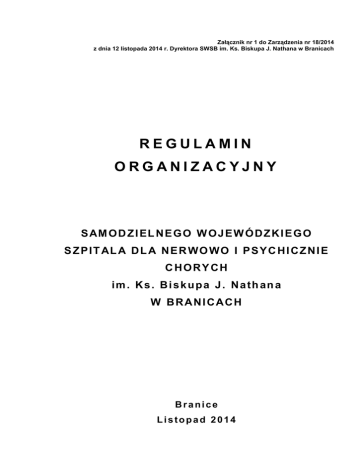 Załącznik nr 1 do Zarządzenia nr 18/2014 z dnia 12 listopada 2014 r. Dyrektora SWSB im. Ks. Biskupa J. Nathana w Branicach REGULAMIN ORGANIZACYJNY S AM O D Z I E L N E G O W O J E W Ó D Z K I E G O S Z P I T AL A D L A N E R W O W O I P S Y C H I C Z N I E CHORYCH im. Ks. Biskupa J. Nathana W B R AN I C AC H Branice Listopad 2014 ROZDZIAŁ I Postanowienia ogólne. §1 1. Regulamin określa przebieg procesu udzielania świadczeń zdrowotnych z zapewnieniem właściwej dostępności i jakości tych świadczeń, a także zasady funkcjonowania, szczegółową organizację i zakresy działania poszczególnych komórek organizacyjnych oraz tryb pracy Samodzielnego Wojewódzkiego Szpitala dla Nerwowo i Psychicznie Chorych im. Ks. Biskupa J. Nathana w Branicach. 2. Przez użyte w Regulaminie następujące określenia należy rozumieć: a) Szpital – Samodzielny Wojewódzki Szpital dla Nerwowo i Psychicznie Chorych im. Ks. Biskupa J. Nathana w Branicach, b) Rada Społeczna - Radę Społeczną Samodzielnego Wojewódzkiego Szpitala dla Nerwowo i Psychicznie Chorych im. Ks. Biskupa J. Nathana w Branicach, c) komórka organizacyjna – oddział szpitalny, poradnię, zakład diagnostyczny i rehabilitacyjny, dział, sekcję, samodzielne stanowisko, d) bezpośredni przełożony - Dyrektora Szpitala, kierownika komórki organizacyjnej lub koordynatora stanowiska pracy, e) statut – Statut Samodzielnego Wojewódzkiego Szpitala dla Nerwowo i Psychicznie Chorych im. Ks. Biskupa J. Nathana w Branicach, f) regulamin pracy - Regulamin Pracy Samodzielnego Wojewódzkiego Szpitala dla Nerwowo i Psychicznie Chorych im. Ks. Biskupa J. Nathana w Branicach. §2 1. Szpital działa na podstawie: 1. ustawy z dnia 15 kwietnia 2011r. o działalności leczniczej 2. ustawy z dnia 19 sierpnia 1994r. o ochronie zdrowia psychicznego. 3. ustawy z dnia 26 października 1982r. o wychowaniu w trzeźwości i przeciwdziałaniu 4. Rozporządzenia Ministra Zdrowia z dnia 21 grudnia 2010 r. w sprawie rodzaju i zakresu dokumentacji medycznej oraz sposobu jej przetwarzania 5. statutu, 6. regulaminu pracy, 7. niniejszego regulaminu, 8. Zarządzenia Wojewody Opolskiego Nr 147/97 z dn. 17.12.1997 roku. §3 1. Szpital również realizuje zadania na potrzeby obronne Państwa. 2. Szpital wpisany jest do rejestru podmiotów wykonujących działalność leczniczą prowadzonego przez Wojewodę Opolskiego pod numerem 000000009465. 3. Szpital posiada osobowość prawną i jest wpisany do rejestru Stowarzyszeń, Innych Organizacji Społecznych i Zawodowych, Fundacji i Publicznych Zakładów Opieki Zdrowotnej prowadzonego przez Sąd Rejonowy w Opolu, VIII Wydział Gospodarczy Krajowego Rejestru Sądowego pod numerem 0000001963. §4 1. Szpital prowadzi dokumentacje medyczną pacjentów korzystających ze świadczeń zdrowotnych, udzielanych przez medyczne komórki organizacyjne Szpitala zgodnie z obowiązującymi w tym zakresie przepisami. Za prawidłowe prowadzenie dokumentacji odpowiada kierujący daną komórka organizacyjną. 2. Szpital zapewnia ochronę danych zawartych w dokumentacji medycznej pacjentów. 3. Szpital udostępnia dokumentację medyczną na zewnątrz, organom i podmiotom uprawnionym, na podstawie odrębnych przepisów oraz zgodnie oraz zgodnie z zasadami Regulaminu. 4. Opłata za udostępnienie dokumentacji medycznej wynosi: a) jedną stronę wyciągu lub odpisu dokumentacji medycznej - 0,002 przeciętnego wynagrodzenia w poprzednim kwartale, począwszy od pierwszego dnia następnego miesiąca po ogłoszeniu przez Prezesa Głównego Urzędu Statystycznego w Dzienniku Urzędowym Rzeczypospolitej Polskiej "Monitor Polski" na podstawie art. 20 pkt 2 ustawy z dnia 17 grudnia 1998 r. o emeryturach i rentach z Funduszu Ubezpieczeń Społecznych, b) jedną stronę kopii dokumentacji medycznej - 0,0002 przeciętnego wynagrodzenia, o którym mowa w lit. a), c) sporządzenie wyciągu, odpisu lub kopii dokumentacji medycznej na elektronicznym nośniku danych- w wysokości 0,002 przeciętnego wynagrodzenia, o którym mowa w lit.a). 5. Należne opłaty, o których mowa w ust.1 zaokrągla się do pełnych dziesiątek groszy w ten sposób, że końcówki od 1 grosza wzwyż pomija się. 6. Aktualna wysokość opłaty w której mowa w ust. 4 stanowi kwotę określoną w załączniku nr 9 do Regulaminu. O każdorazowej zmianie przeciętnego wynagrodzenia oraz wysokości opłat, o których mowa wyżej, DAT zawiadamia zainteresowane komórki organizacyjne. 1. §5 Szpital ustala ciennik usług medycznych wykonywanych odpłatnie. 2. Cennik, o którym mowa w ust.1 stanowi załącznik numer 8 do niniejszego Regulaminu. 3. Do wystawienia rachunków osobom korzystającym z odpłatnych usług medycznych zobowiązani są uprawnieni pracownicy komórek organizacyjnych wykonujących świadczenia medyczne. ROZDZIAŁ II Zadania realizowane przez komórki organizacyjne i stanowiska samodzielne Szpitala. §6 1. Zadania komórek organizacyjnych Szpitala: a) organizują wykonywanie zadań określonych w powszechnie obowiązujących przepisach prawa, a także wewnętrznych aktach prawnych Szpitala, b) opracowują projekty zarządzeń i poleceń służbowych Dyrektora Szpitala i ponoszą odpowiedzialność za ich przygotowanie pod względem merytorycznym, c) rozpatrują skargi, wnioski i listy obywateli, badają zasadność skarg oraz źródła i przyczyny ich powstawania, opracowują niezbędne informacje o załatwieniu tych spraw, d) usprawniają organizację, metody i formy pracy komórek organizacyjnych Szpitala, e) podejmują niezbędne działania w celu ochrony tajemnicy państwowej, służbowej i zawodowej, f) opracowują projekty niezbędnych ocen, analiz, sprawozdań i informacji o realizacji zadań, g) współpracują ze stanowiskiem pracy do spraw obronnych w wykonywaniu przedsięwzięć obrony cywilnej, h) właściwe komórki organizacyjne Szpitala, którym powierzono gospodarowanie środkami finansowymi Szpitala, opracowują projekty odpowiedniej cz