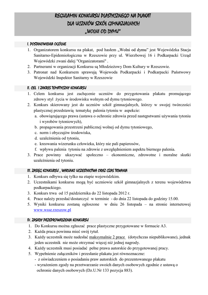 REGULAMIN REGULAMIN KONKURSU PLASTYCZNEGO NA PLAKAT PLAKAT DLA UCZNIÓW SZKÓŁ SZKÓŁ GIMNAZJALNYCH „WOLNI OD DYMU” I. POSTANOWIENIA OGÓLNE 1. Organizatorem konkursu na plakat, pod hasłem „Wolni od dymu” jest Wojewódzka Stacja Sanitarno-Epidemiologiczna w Rzeszowie przy ul. Wierzbowej 16 i Podkarpacki Urząd Wojewódzki zwani dalej "Organizatorami" . 2. Partnerami w organizacji Konkursu są MłodzieŜowy Dom Kultury w Rzeszowie. 3. Patronat nad Konkursem sprawują Wojewoda Podkarpacki i Podkarpacki Państwowy Wojewódzki Inspektor Sanitarny w Rzeszowie II. CEL I ZAKRES TEMATYCZNY KONKURSU 1. Celem konkursu jest zachęcenie uczniów do przygotowania plakatu promującego zdrowy styl Ŝycia w środowisku wolnym od dymu tytoniowego. 2. Konkurs skierowany jest do uczniów szkół gimnazjalnych, którzy w swojej twórczości plastycznej przedstawią tematykę palenia tytoniu w aspekcie: a. obowiązującego prawa (ustawa o ochronie zdrowia przed następstwami uŜywania tytoniu i wyrobów tytoniowych), b. propagowania przestrzeni publicznej wolnej od dymu tytoniowego, c. norm i obyczajów środowiska, d. uzaleŜnienia od tytoniu, e. kreowania wizerunku człowieka, który nie pali papierosów, f. wpływu palenia tytoniu na zdrowie z uwzględnieniem aspektu biernego palenia. 3. Prace powinny ukazywać społeczno – ekonomiczne, zdrowotne i moralne skutki uzaleŜnienia od tytoniu. III. ZASIĘG KONKURSU , WARUNKI UCZESTNICTWA ORAZ CZAS TRWANIA 1. Konkurs odbywa się tylko na etapie wojewódzkim. 2. Uczestnikami konkursu mogą być uczniowie szkół gimnazjalnych z terenu województwa podkarpackiego. 3. Konkurs trwa od 15 października do 22 listopada 2012 r. 4. Prace naleŜy przesłać/dostarczyć w terminie - do dnia 22 listopada do godziny 15.00. 5. Wyniki konkursu zostaną ogłoszone w dniu 26 listopada – na stronie internetowej www.wsse.rzeszow.pl IV. ZASADY PRZEPROWADZENIA KONKURSU 1. Do Konkursu moŜna zgłaszać prace plastyczne przygotowane w formacie A3. 2. KaŜda praca powinna mieć swój tytuł. 3. KaŜdy uczestnik moŜe nadesłać maksymalnie 2 prace (dotychczas niepublikowane), jednak jeden uczestnik nie moŜe otrzymać więcej niŜ jednej nagrody. 4. KaŜdy uczestnik musi posiadać pełne prawa autorskie do przygotowanej pracy. 5. Wypełnienie załączników i przesłanie plakatu jest równoznaczne: - z oświadczeniem o posiadaniu praw autorskich do prezentowanego plakatu - wyraŜeniem zgody na przetwarzanie swoich danych osobowych zgodnie z ustawą o ochronie danych osobowych (Dz.U.Nr 133 pozycja 883). 6. Przesłanie plakatów na konkurs jest jednoznaczne z nieodpłatnym udzieleniem prawa na wykorzystanie go na następujących polach eksploatacji: a. druku w dowolnej liczbie publikacji i w dowolnym nakładzie b. bezterminową prezentację na stronie www.wsse.rzeszow.pl c. rozpowszechnianie plakatu d. wprowadzanie do pamięci komputera e. prezentowanie plakatów na wystawach stanowiących kontynuację konkursu. 7. Plakaty nie mogą zawierać treści obraŜających i naruszających dobre imię innych osób. Organizatorzy zastrzegają sobie prawo usunięcia prac naruszających prawa osób trzecich, obscenicznych i pozbawionych walorów artystycznych. V. WARUNKI UCZESTNICTWA 1. Do konkursu zostaną dopuszczone wyłącznie prace, które są zgodne z regulaminem Konkursu i w sposób oczywisty nawiązywać będą do jego tematyki. 2. Prace konkursowe opisane na odwrocie naleŜy przesłać lub dostarczyć na adres: Wojewódzka Stacja Sanitarno-Epidemiologiczna w Rzeszowie; ul. Wierzbowa 16; 35-959 Rzeszów Oddziała Oświaty Zdrowotnej i Promocji Zdrowia (pokój 201). Do prac naleŜy dołączyć równieŜ zamkniętą podpisaną kopertę , w której powinno być wypełnione: Zgłoszenie (załącznik nr 1), Oświadczenie uczestnika niepełnoletniego (załącznik nr 2 do regulaminu). Nieprawidłowy format prac, brak opisu, pełnych danych oraz brak wypełnionych załączników – wyklucza pracę z konkursu. 3. Informacja o konkursie, regulamin oraz załączniki www.wsse.rzeszow.pl w zakładce promocja zdrowia. dostępne są na stronie VI. ROZSTRZYGNIĘ ROZSTRZYGNIĘCIE KONKURSU I NAGRODY 1. Oceny nadesłanych prac dokona jury powołane przez Organizatorów, w skład którego wejdą przedstawiciele Organizatorów, artysta plastyk, przedstawiciel mediów. Prace oceniane będą wg następujących kryteriów: o zgodność z tematem konkursu o wartość profilaktyczno-edukacyjna o jasność przekazu o wartość artystyczna o oryginalność pracy 2. Jury dokona oceny prac konkursowych oraz wyłoni 3 laureatów konkursu wskazując zwycięzcę konkursu (I miejsce) oraz odpowiednio laureatów, którzy zajęli II i III miejsce. Organizatorzy zastrzegają moŜliwość przyznania dwóch nagród dodatkowych – wyróŜnień. 3. Nagrody: I miejsce - nagroda dla ucznia, dyplom II miejsce - nagroda dla ucznia, dyplom III miejsce – nagroda dla ucznia, dyplom WyróŜnienia Jury zastrzega sobie prawo innego podziału nagród. Fundatorem nagród jest Podkarpacki Urząd Wojewódzki i Wojewódzka Stacja SanitarnoEpidemiologiczna w Rzeszowie. 4. Nazwiska osób, których prace zostaną wyróŜnione i nagrodzone, zamieszczone zostaną na liście zwycięzców konkursu. 5. Uroczyste wręczenie nagród nastąpi w terminie wyznaczonym przez Organizatorów 28 listopada (środa) w Wojewódzkiej Stacji Sanitarno-Epidemiologicznej w Rzeszowie, ul. Wierzbowa 16. Nadesłanie prac jest równoznaczne z przyjęciem warunków Konkursu. Załączniki do Regulaminu Konkursu: Załącznik nr 1 – Zgłoszenie Załącznik nr 2 – Zgoda przedstawiciela ustawowego dziecka, które nie ukończyło 18 roku Ŝycia, na udział w konkursie Więcej informacji moŜna uzyskać: Wojewódzka Stacja Sanitarno-Epidemiologiczna w Rzeszowie Oddział Oświaty Zdrowotnej i Promocji Zdrowia Dorota Gibała 17 85 22 111 wew. 311 / 602 112 208, [email protected]
