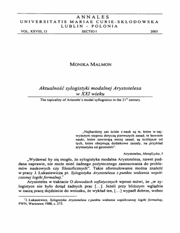 ANNALES UNI VE R S IT A T I S MA R IA E C U R I E - S K Ł O D O W S K A LUBLIN - POLONIA VOL. XXVIII, 13 SECTIOI M o n ik a M 2003 alm on Aktualność sylogistyki modalnej Arystotelesa w XXI wieku The topicality o f Aristotle’s modal syllogistics in the 21s1 century „Najbardziej zaś ścisłe z nauk są te, które w naj wyższym stopniu dotyczą pierwszych zasad; te bowiem nauki, które zawierają mniej zasad, są ściślejsze od tych, które obejmują dodatkowe zasady, na przykład arytmetyka od geometrii”. Arystoteles, Metafizyka, I „W ydawać by się mogło, że sylogistyka m odalna Arystotelesa, nawet pod dana naprawie, nie może mieć żadnego pożytecznego zastosow ania do proble m ów naukow ych czy filozoficznych” . Takie sform ułowanie m ożna znaleźć w pracy J. Łukasiew icza pt. Sylogistyka Arystotelesa z punktu widzenia współ czesnej logiki fo rm a ln ej.' Arystoteles w traktacie O dowodach sojistycznych w prost m ówi, że „w sylogistyce nie było dotąd żadnych prac [...]. Jeżeli przy bliższym wglądzie w naszą pracę dojdziecie do wniosku, że wykład ten, [...] w ypadł dobrze, wobec 'j. Lukasiewicz, Sylogistyka Arystotelesa z punktu widzenia współczesnej logiki formalnej, PWN, Warszawa 1988, s. 273. tego wam w szystkim względnie naszym słuchaczom w ypada pozostać w yrozu m iałymi w stosunku do braków tej teorii, a za nowe, które w niej tkwi, należy się szczera wdzięczność” .2 Praca nad sylogistyką była pionierska, więc nie m o gła być w olna od pewnych błędów autora, do których się przyznaje i to każdy powinien mieć na uwadze. Pom im o błędów, które zawiera, sylogistyką m odalna Stagiryty nadal inspi ruje filozofów i logików. Niektórzy w idzą w niej „broń” do walki z determinizmem. W tej walce m a być pom ocne sform ułowane przez Arystotelesa po jęcie „m ożliwości” (interpretowane przez niektórych logików jako m ożliwość obustronna czy kontyngencja). Jednakże to nie w yczerpuje pełnego bogactwa, które tkwi w tym systemie. J. Lukasiew icz przyznaje, że w dziełach Arystotelesa znalazł inspiracje do stworzenia system u logiki wielowartościowej (rachunku trójwartościowego). Przyczyną tego było badanie pojęcia m ożliwości, które występowało u Arystotelesa w przykładzie przyszłej bitwy morskiej. Nie będziem y zajmowali się zagadnieniam i determ inizm u i indeterminizmu, ale zw rócim y uw agę na pewne kwestie, które do tej pory nie znalazły pełnego rozwiązania: • wieloznaczność term inów m odalnych, które w ystępują w pism ach Ary stotelesa, • sposób traktowania modalności przez Arystotelesa (jako m odalności de dieto, czy jako de re) • czy sylogistyką m odalna wyrasta z czystego zainteresow ania logiką, czy z ontologii, jak ą uprawiał Arystoteles. Terminy m odalne nie tylko w ystępują w pism ach logicznych Arystotelesa tj. H ermeneutyka czy Analityki pierw sze, lecz także w M etafizyce. Są nimi: 6uvaxov - „m ożliw e”, evSeyopevov - „m ożliw e*”3, avayicaiov - „konieczne”, a8uvaxov „niem ożliw e”. Pierwsze dwa term iny są równoważne w Hermeneutyce, natom iast w Analitykach pierw szych termin evSeyopEvov ma „rozszerzone” znaczenie. Niektórzy autorzy pom ijają fragm enty z M etafizyki dotyczące konieczności i możliwości, argumentując, iż nie m ają nic wspólnego z rozważaniam i zaw ar tymi w pism ach logicznych A rystotelesa, które, ich zdaniem , są najciekawsze. Odm ienne stanowisko do tej pory było raczej mało popularne. A. Achmanow w Logice Arystotelesa twierdzi, iż znam iennym rysem logiki Arystotelesa jest „wyprowadzenie związków elem entów myśli i myśli sam ych ze związków ist niejących w bycie, co uprawnia do scharakteryzowania tej logiki jako ontologicznej. [...] W logice Arystotelesa dominuje obiektywizm wyrażający się w próbach 2Arystoteles, O dowodach soflstycznych, 184b 1-9. 3 J. Lukasiewicz za W. Rossem termin evSexopevov tłumaczy jako „kontyngentne”. Można spotkać termin ten tłumaczony jako możliwość obustronną. ujęcia form i praw m yślenia w ich zw iązku zb y tem i w ich zw iązku w zajem nym ”.4 M ożna się pow ołać na C. Prantla, który dopuszcza nazywanie logiki Arystotelesa m etafizyczną w tym znaczeniu, iż jest ona w sposób szczególny zw iązana z „pierw szą filozofią” Stagiryty, i to w dwojaki sposób: po pierwsze, jako narzędzie - środek uzasadniania twierdzeń, po drugie, jako nauka, której ogólne zasady należą do pierwszej filozofii.5 A naliza pojęć m ożliwości (ev8exópevov, Suvorov) A rystotelesa jest bardzo trudna z tego powodu, iż sam tw órca tego term inu używ a go wieloznacznie: „ [...] ponieważ »m ożliwy« je st wyrazem wieloznacznym (bo zarówno to, co jest konieczne, ja k i to, co niekonieczne, a także i to, co dopuszczalne nazywam m ożliwym ” .6 W in n y m miejscu autor A nalityk pierw szych (32a 18-20) w zupełnie odm ienny sposób charakteryzuje możliwość: „wyrazam i »być możliwym« i »m ożliwe« określam coś, co mimo iż nie je st konieczne, jeżeli zostanie uznane za prawdziwe, nie w yniknie z tego nic niem ożliwego” . Jeśli sięgniem y do M etafizyki (V, 1019b 34-35), to otrzym amy następujący obraz tego co m oż liwe: „ [...] m ożliwe w jednym znzczeniu, jak ju ż powiedziano, oznacza więc to, co nie jest koniecznie fałszywe; w innym znaczeniu to, co jest prawdziwe, albo wreszcie to, co m oże być praw dziw e”. N a podstawie analizy tekstów m ożna wyciągnąć wniosek, że Arystoteles rozróżnia m ożliwość logiczną, m ożliwość, którą m ożna nazwać dopuszczalno ścią lub kontyngencją (), i m ożliwość ontologiczną lub realną (Suvorov). M ożli wość logiczna w ystępuje wtedy, gdy myśl odpow iada lub nie odpowiada rze czywistości. Inaczej m ożem y j ą określić jako to, co m ożna przyjąć lub odrzucić nie popadając w sprzeczność. Kontyngencją jest to m o