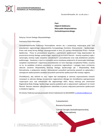 Szczecin/Koszalin, dn. 25.06.2015 r. Pani Olgierd Geblewicz Marszałek Województwa Zachodniopomorskiego Dotyczy: Forum Dialogu Obywatelskiego. Szanowny Panie Marszalku, Zachodniopomorska Federacja Pozarządowa zwraca się z propozycją rozpoczęcia prac nad powołaniem regionalnego odpowiednika Europejskiego Komitetu Ekonomiczno -‐ Społecznego. Prace nad nową formą dialogu zainaugurowało w dniu 25 czerwca Ministerstwo Pracy i Polityki Społecznej. Prace te prowadzone wspólnie z partnerami społecznymi mają doprowadzić do poszerzenia komisji dialogu społecznego i wparcia jej na trzech filarach – komisji wspólnej rządu i samorządu, komisji rządu związków zawodowych i pracodawców oraz rady działalności pożytku publicznego. Uważamy, iż jest to n iezwykle cenna inicjatywa p ołączenia sił samorządu lokalnego, związków zawodowych i organizacji pracodawców na rzecz lepszego zarządzania Polska. Liczymy na to, że podobne struktury powstaną na poziomie regionalnym i zastąpią nieco archaiczne obecnie zarówno Wojewódzką Komisję Dialogu Społecznego jak i Wojewódzką Radę Zatrudnienia, a połączenie wiedzy i doświadczeń wszystkich partnerów pozwoli na optymalne i synergiczne wykorzystanie zasobów wszystkich partnerów społecznych dla rozwoju regionu. Chcielibyśmy, aby właśnie to nasz region był awangardą w zakresie wypracowania nowych rozwiązań w zakresie dialogu na poziomie regionalnym dlatego też chcielibyśmy zaproponować rozpoczęcie prac nad założeniami dla regionalnego EKES. Naszą intencją jest stworzenie Regionalnej Rady Dialogu Społecznego opartej podobnie jak w załączeniach rządowych na trzech filarach. Naszym zdaniem zdecydowanie ułatwiłoby to proces włączania partnerów społecznych w działania regionu. W imieniu Federacji sprawę prowadzi Antoni Sobolewski tel 601504905 [email protected] Z poważaniem Romana Krzewicka Członek Zarządu Zachodniopomorskiej Federacji Pozarządowej