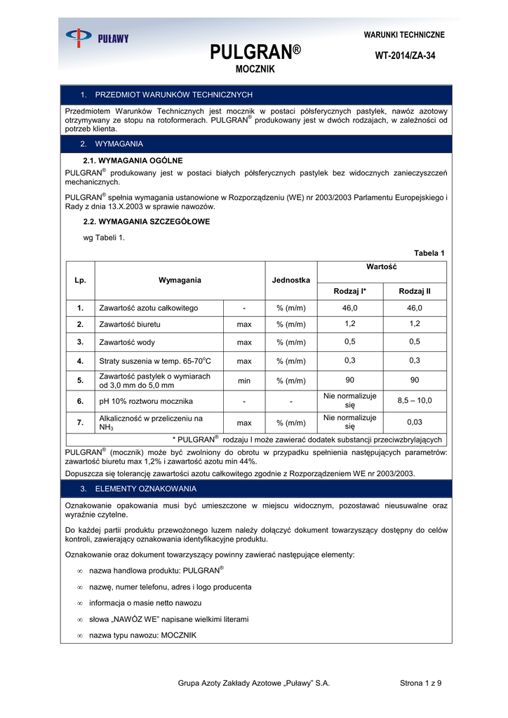 WARUNKI TECHNICZNE PULGRAN® WT-2014/ZA-34 MOCZNIK 1. PRZEDMIOT WARUNKÓW TECHNICZNYCH Przedmiotem Warunków Technicznych jest mocznik w postaci półsferycznych pastylek, nawóz azotowy ® otrzymywany ze stopu na rotoformerach. PULGRAN produkowany jest w dwóch rodzajach, w zaleŜności od potrzeb klienta. 2. WYMAGANIA 2.1. WYMAGANIA OGÓLNE ® PULGRAN produkowany jest w postaci białych półsferycznych pastylek bez widocznych zanieczyszczeń mechanicznych. ® PULGRAN spełnia wymagania ustanowione w Rozporządzeniu (WE) nr 2003/2003 Parlamentu Europejskiego i Rady z dnia 13.X.2003 w sprawie nawozów. 2.2. WYMAGANIA SZCZEGÓŁOWE wg Tabeli 1. Tabela 1 Wartość Lp. Wymagania 1. Zawartość azotu całkowitego 2. Jednostka Rodzaj I* Rodzaj II - % (m/m) 46,0 46,0 Zawartość biuretu max % (m/m) 1,2 1,2 3. Zawartość wody max % (m/m) 0,5 0,5 4. Straty suszenia w temp. 65-70 C max % (m/m) 0,3 0,3 5. Zawartość pastylek o wymiarach od 3,0 mm do 5,0 mm min % (m/m) 90 90 6. pH 10% roztworu mocznika - - Nie normalizuje się 8,5 – 10,0 7. Alkaliczność w przeliczeniu na NH3 max % (m/m) Nie normalizuje się 0,03 o ® * PULGRAN rodzaju I moŜe zawierać dodatek substancji przeciwzbrylających ® PULGRAN (mocznik) moŜe być zwolniony do obrotu w przypadku spełnienia następujących parametrów: zawartość biuretu max 1,2% i zawartość azotu min 44%. Dopuszcza się tolerancję zawartości azotu całkowitego zgodnie z Rozporządzeniem WE nr 2003/2003. 3. ELEMENTY OZNAKOWANIA Oznakowanie opakowania musi być umieszczone w miejscu widocznym, pozostawać nieusuwalne oraz wyraźnie czytelne. Do kaŜdej partii produktu przewoŜonego luzem naleŜy dołączyć dokument towarzyszący dostępny do celów kontroli, zawierający oznakowania identyfikacyjne produktu. Oznakowanie oraz dokument towarzyszący powinny zawierać następujące elementy: • nazwa handlowa produktu: PULGRAN • nazwę, numer telefonu, adres i logo producenta • informacja o masie netto nawozu • słowa „NAWÓZ WE” napisane wielkimi literami • nazwa typu nawozu: MOCZNIK ® Grupa Azoty Zakłady Azotowe „Puławy” S.A. Strona 1 z 9 WARUNKI TECHNICZNE PULGRAN® WT-2014/ZA-34 MOCZNIK • dane dotyczące formy i zawartości składników pokarmowych • instrukcję stosowania • informację o środkach ostroŜności dotyczących bezpiecznego postępowania • znaki manipulacyjne: „Chronić przed wilgocią”, „Chronić przed nagrzaniem(ciepłem)” oraz „Dopuszczalna liczba warstw piętrzenia” * • oznakowanie przydatności do recyklingu - w przypadku opakowań typu worki PE 25 kg • oznakowanie rodzaju materiału wykorzystanego do produkcji opakowania - w przypadku opakowań typu worki PE 25 kg. * dotyczy oznakowania opakowań jednostkowych 4. PAKOWANIE ® PULGRAN pakowany jest w: • worki polietylenowe o pojemności 25 kg netto • kontenery elastyczne typu big-bag z jednym uchem i wkładką polietylenową o pojemności 500 kg oraz 600 kg netto • kontenery elastyczne typu big-bag z czterema uszami o pojemności 500 kg, 600 kg netto • przewoŜony luzem w wagonach/samochodach • inny rodzaj opakowań po uzgodnieniu z odbiorcą i przewoźnikiem zabezpieczający produkt przed zmianą jakości i mający wymiary zgodne z PN-O-79021:1989. 5. PRZECHOWYWANIE Ze względu na higroskopijność produkt naleŜy przechowywać w czystych i suchych budynkach magazynowych lub pod wiatami w stosach do wysokości 12 warstw worków wg PN-C-87001:1998 p. 4.2.1., 4.2.2., 4.2.3. . Kontenery elastyczne typu big-bag o masie nie przekraczającej 500kg moŜna przechowywać w stosach złoŜonych z trzech warstw, powyŜej 500 kg naleŜy magazynować w stosach złoŜonych maksymalnie z dwóch warstw. ® PULGRAN luzem naleŜy przechowywać w pryzmach w zadaszonych magazynach. Nieprzestrzeganie powyŜszych zasad moŜe spowodować zbrylanie się produktu. 6. TRANSPORT ® PULGRAN naleŜy przewozić krytymi środkami transportowymi zgodnie z PN-C-87001:1998 p. 5.1., 5.2. oraz obowiązującymi przepisami transportowymi. W kaŜdym przypadku środki transportu powinny być czyste i suche. Produkt nie podlega przepisom RID i ADR. 7. BADANIA 7.1. PROGRAM BADAŃ wg Tabeli 2. Tabela 2 L.p. Opis badań wg Rodzaj badań 1. Sprawdzenie wymagań ogólnych 7.4. 2. Oznaczanie zawartości azotu całkowitego 7.5. 3. Oznaczanie zawartości biuretu 7.6. 4. Oznaczanie zawartości wody 7.7. o 5. Oznaczanie strat suszenia w temp 65-70 C 7.8. 6. Oznaczanie zawartości granulek o wymiarach 3,0-5,0 mm 7.9 7. Oznaczanie pH 10% roztworu mocznika Grupa Azoty Zakłady Azotowe „Puławy” S.A. 7.10. Strona 2 z 9 WARUNKI TECHNICZNE PULGRAN® WT-2014/ZA-34 MOCZNIK 8. Oznaczanie alkaliczności mocznika w przeliczeniu na NH3 7.11. 7.2. WIELKOŚĆ PARTII Partia nie powinna zawierać więcej niŜ 1000 t produktu. 7.3. POBÓR PRÓBEK Próbki naleŜy pobierać zgodnie z PN-EN 1482-1:2008. 7.4. SPRAWDZANIE WYMAGAŃ OGÓLNYCH Zgodność z wymaganiami ogólnymi sprawdzić wzrokowo. 7.5. OZNACZANIE ZAWARTOŚCI AZOTU CAŁKOWITEGO Metody oznaczania zawartości azotu: • Metoda destylacyjna – do bieŜącej kontroli • Metoda formalinowa 7.5.1 METODA DESTYLACYJNA 7.5.1.1. Zasada metody Metoda polega na redukcji mocznikowej formy azotu do siarczanu amonowego przez ogrzewanie ze stęŜonym kwasem siarkowym w obecności katalizatora a następnie oddestylowaniu amoniaku z alkalicznego roztworu i absorpcji w znanej objętości mianowanego kwasu siarkowego. Nadmiar kwasu siarkowego odmiareczkowuje się mianowanym r-rem wodorotlenku sodowego stosując jako wskaźnik czerwień metylową lub wskaźnik mieszany. 7.5.1.2. Odczynniki i roztwory a) mieszanina katalityczna do mineralizacji: tlenek glinu, tabletki Kjeldahla lub przygotować następująco: zmieszać 1000g siarczanu potasowego, 250g siarczanu miedziowego pięciowodnego i dobrze wymieszać b) kwas siarkowy o d = 1,84 g/ml c) wodorotlenek sodu – r-r 40% d) wodorotlenek sodu – r-r mianowany o stęŜeniu 0,5 N e) kwas siarkowy