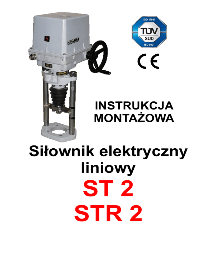 INSTRUKCJA MONTAŻOWA Siłownik elektryczny liniowy ST 2 STR 2 Instrukcja montażowa siłownika ST 2, STR 2 INSTRUKCJA MONTAŻOWA SIŁOWNIKÓW ELEKTRYCZNYCH LINIOWYCH ST 2, STR 2 Spis treści: 1. 1.1 1.2 2. 3. 3.1 3.2 4. 4.1 4.2 5. 5.1 5.2 5.3 5.3.1 5.3.2 5.3.3 5.4 6. 6.1 6.2 6.3 6.4 6.5 6.6 7. 7.1 7.2 8. 9. 10. 11. 12. 13. Zastosowanie Montaż i położenie robocze Wpływ wyrobu na otoczenie Środowisko pracy Zalecenia eksploatacyjne Zasilanie i warunki użytkowania Magazynowanie Opis i parametry techniczne Opis Parametry techniczne Montaż i demontaż siłownika Montaż Mechaniczne podłączenie siłownika do armatury Podłączenie elektryczne i kontrola działania Podłączenie do systemu sterowniczego Podłączenie na listwę zaciskową Podłączenie przez złącze konektorowe Demontaż Ustawianie Ustawienie jednostki siłowej Ustawianie jednostki położeniowo-sygnalizacyjnej Ustawianie nadajnika potencjometrycznego Ustawianie elektronicznego nadajnika położenia EPV Ustawianie nadajnika pojemnościowego CPT 1/A Ustawianie regulatora położenia Sterowanie ręczne i sterowanie lokalne Sterowanie ręczne Sterowanie lokalne Obsługa Eksploatacja Awarie i ich usuwanie Części zamienne Schematy elektryczne Rysunki wymiarowe Wydanie 02/2013 Producent zastrzega sobie prawo do zmian - 2 2 2 2 3 3 4 4 4 5 9 9 9 10 10 10 10 11 12 12 12 12 13 14 16 18 18 18 18 18 19 19 20 26 Numer ewidencyjny dokumentu: 74 0919 06 1 ST 2, STR 2 Instrukcja montażowa siłownika 1. Zastosowanie Siłownikiy elektryczne (dalej ES) liniowe typu ST 2 (dalej ST) lub STR 2 z regulatorem położenia (dalej STR) są produktem nowej generacji konstruowane dla prostego montażu do sterowania armaturami zamykającymi lub regulacyjnymi. ;Przystosowane są do zdalnego sterowania organów zamykających a ES ST z regulatorem położenia do automatycznej regulacji, w obydwóch kierunkach. Mogą być wyposażone w elementy sterowania procesów technologicznych analogowym sygnałem prądowym lub napięciowym z odwzorowaniem położenia zunifikowanym sygnałem analogowym. Siłowniki elektryczne ST stosowane są w ciepłownictwie, klimatyzacji, energetyce, gazownictwie, wodociągach, kanalizacji, przemyśle spożywczym i innych. Przyłącza do armatur są zgodne z normą DIN/ISO. 1.1 Montaż i położenie robocze 1. Siłowniki można instalować na obiektach przemysłowych, bez regulacji temperatury i wilgotności powietrza z ochroną przed bezpośrednim działaniem warunków atmosferycznych takich jak opady deszczu i śniegu oraz promieniami słonecznymi. 2. Siłowniki zamontowane w atmosferze o wilgotności ponad 8 powinny mieć na stałe 0% podłączoną grzałkę. Siłownik musi być umiejscowiony tak, aby był dostęp do sterowania ręcznego oraz możliwość zdjęcia obudowy siłownika i dostęp do przepustów przewodów. Siłowniki można montować w dowolnej pozycji. Zaleca się montaż SE w pozycji pionowej nad armaturą. ! 1.2 Wpływ wyrobu na otoczenie Kompatybilność elektromagnetyczna (EMC): wyrób spełnia wymagania Uni Europejskiej dotyczących kompatybilności elektromagnetycznej 2004/108/EC z zastosowaniem norm EN 61000-6-4:2007+A1:2011, EN 61000-6-2:2005, EN 61000-3-2:2014 and EN 61000-3-3:2013 Wibracje wywoływane przez wyrób: wpływ wyrobu na środowisko jest znikomy. Poziom hałasu: poziom hałasu A - max. 78 dB (A). 2. Środowisko robocze (zgodnie z normą IEC 60 721-2-1) siłowniki elektryczne są produkowane w niżej podanych wersjach: 1. “Standard” - dla grupy klimatycznej wąskiej (R) + obowiązuje dla typu klimatu umiarkowanego (WT), gorącego suchego (MWDr) i bardzo gorącego i suchego (EWDr) o temperaturach -25°C do +55°C. 2. “Chłodne” - dla grupy klimatycznej średniej (M) obowiązuje dla typu klimatu chłodnego (CT), umiarkowanego (WT), ciepłego suchego (WDr), gorącego suchego (MWDr) o temperaturach -40°C do +40°C. 3. “Uniwersalna” - dla grupy klimatycznej szerokiej (G) obowiązuje dla grupy klimatycznej zimnej (C), chłodnej (CT), umiarkowanej (WT), ciepłej suchej (WDr), gorącej suchej (MWDr), bardzo gorącej i suchej (EWDr), gorącej i wilgotnej (WDa) i gorąca wilgotna stała (WDaE) o temperaturach -50°C do +40°C. 4. “Morska” - dla grupy klimatycznej ogólnoświatowej (WW) obowiązuje dla grupy klimatycznej zimnej (C), chłodnej (CT), umiarkowanej (WT), ciepłej suchej (WDr), gorącej suchej (MWDr), bardzo gorącej i suchej (EWDr), gorącej i wilgotnej (WDa) i gorąca wilgotna stała (WDaE) z wyjątkiem grupy bardzo zimnej (EC) o temperaturach -50°C do +40°C. 5.”tropikalna” - obowiązuje dla suchego i bardzo wilgotnego dla grupy klimatycznej umiarkowanej (WT), ciepłej suchej (WDr), gorącej suchej (MWDr), bardzo gorącej i suchej (EWDr), gorącej i wilgotnej (WDa) i gorąca wilgotna stała (WDaE) o temperaturach -25°C do +55°C. Kategoria umiejscowienia - wersja “standard”, “chłodna”, “uniwersalna” i “tropikalna” są przeznaczone do pracy w pomieszczeniach zadaszonych(kat. 2) - wersja “morska” jest przeznaczona do pracy na otwartych przestrzeniach Typ atmosfery - wersja “standard”, “chłodna”, “uniwersalna” i “tropikalna” są przeznaczone do pracy w atmosferze typu II - przemysłowa 2 Instrukcja montażowa siłownika ST 2, STR 2 - wersja “morska” jest przeznaczona do pracy w atmosferze typu III - morskaub typu IV nadmorska-przemysłowa Środowisko robocze (zgodnie z normą IEC 60 364-3:1993) Siłowniki SP muszą wytrzymywać warunki zewnętrzne i sprawnie funkcjonować w warunkach zewnętrznych określonych jako: - umiarkowane do gorącego z temperaturą od -25°C do +55°C..............................................................AA 7* - chłodne do umiarkowane ciepłe, suche z temperaturą od -50°C do+40°C ...................................AA 8* - z wilgotność względna od 10 do 100% , z kondensacją, z maksymalną zawartością wody 0,029 kg/kg wody w 1 kg suchego powietrza w temperaturze -25°C do +55°C...