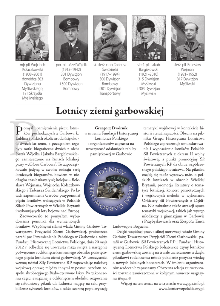 mjr pil. Wojciech Kołaczkowski (1908–2001) dowódca 303 Dywizjonu Myśliwskiego, I i II Skrzydła Myśliwskiego P P por. pil. Józef Wójcik (1915–1942) 301 Dywizjon Bombowy i 300 Dywizjon Bombowy st. sierż. r-op. Tadeusz Świdziński (1917–1994) 300 Dywizjon Bombowy i 301 Dywizjon Transportowy sierż. pil. Jakub Bargiełowski (1921–2010) 315 Dywizjon Myśliwski i 303 Dywizjon Myśliwski sierż. pil. Bolesław Wejman (1921–1952) 317 Dywizjon Myśliwski Lotnicy ziemi garbowskiej Grzegorz Dwórnik omysł upamiętnienia pięciu lotnitematyki wojskowej w kontekście hików pochodzących z Garbowa k. w imieniu Fundacji Historycznej storii i teraźniejszości. Obecna na pikLotnictwa Polskiego Lublina i bliskich okolic zrodził się okoniku Grupa Historyczna Lotnictwa i organizatorów zaprasza na ło dwóch lat temu, a początkiem tego Polskiego zaprezentuje umundurowauroczystość odsłonięcia tablicy były notki biograficzne dwóch z nich: nie i wyposażenie lotników Polskich pamiątkowej w Garbowie Józefa Wójcika i Jakuba BargiełowskieSił Powietrznych z okresu II wojny go zamieszczone na łamach lokalnej światowej, a punkt promocyjny Sił prasy – „Głosu Garbowa”. To zapoczątPowietrznych RP da obraz współczekowało jedyną w swoim rodzaju serię snego polskiego lotnictwa. Na pikniku lotniczych biogramów, bowiem w nieznajdą się także wystawy, m.in. o poldługim czasie ukazały się kolejne – Boleskich lotnikach w obronie Wielkiej sława Wejmana, Wojciecha KołaczkowBrytanii, promocja literatury o temaskiego i Tadeusza Świdzińskiego. Po latyce lotniczej, koncert patriotycznych tach zapomnienia Garbów przypomniał i wojskowych melodii w wykonaniu pięciu lotników, walczących w Polskich Orkiestry Sił Powietrznych z DębliSiłach Powietrznych w Wielkiej Brytanii na. Nie zabraknie także atrakcji spoza i wykonujących loty bojowe nad Europą. tematyki wojskowej, takich jak występ Zaowocowało to pomysłem wybumłodzieży z gimnazjum w Garbowie dowania pomnika dla wymienionych i Przybysławicach oraz Zespołu Tańca lotników. Wspólnymi siłami władz Gminy Garbów, To- Ludowego z Bogucina. warzystwa Przyjaciół Ziemi Garbowskiej, proboszcza Dzięki wspólnej pracy i silnej motywacji władz Gminy parafii pw. Przemienienia Pańskiego w Garbowie a także Garbów, Towarzystwa Przyjaciół Ziemi Garbowskiej, paFundacji Historycznej Lotnictwa Polskiego, dnia 20 maja rafii w Garbowie, Sił Powietrznych RP i Fundacji Histo2012 r. odbędzie się uroczysta msza święta a następnie rycznej Lotnictwa Polskiego bohaterskie czyny lotników poświęcenie i odsłonięcie kamiennego obelisku poświęco- ziemi garbowskiej zostaną na trwale uwiecznione, a dzięki nego pięciu lotnikom ziemi garbowskiej. W uroczystości piknikowi rodzinnemu młode pokolenie pozyska wiedzę wezmą udział Siły Powietrzne RP zapewniając należytą o nowych lokalnych bohaterach. W imieniu organizatowojskową oprawę między innymi w postaci przelotu ze- rów serdecznie zapraszamy. Obszerna relacja z uroczystospołu akrobacyjnego Biało-czerwone Iskry. Po zakończe- ści zostanie zamieszczona w kolejnym numerze magazy. niu części związanej z odsłonięciem obelisku rozpocznie nu Więcej na ten temat na witrynach: www.gapa.info.pl się całodniowy piknik dla ludności mający na celu przywww.lotnictwopolskie.org.pl bliżenie sylwetek lotników, a także szerszą popularyzację