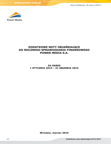 Data publikacji: 18 marca 2016 r. DODATKOWE NOTY OBJAŚNIAJĄCE DO ROCZNEGO SPRAWOZDANIA FINANSOWEGO POWER MEDIA S.A. ZA OKRES 1 STYCZNIA 2015 – 31 GRUDNIA 2015 Wrocław, marzec 2016 1/7 Dodatkowe noty objaśniające SA-R/2015 Data publikacji: 18 marca 2016 r. 1. Informacja o instrumentach finansowych W całym okresie spółka posiadała następujące instrumenty finansowe: − środki pieniężne – prezentowane w sprawozdaniu finansowym jako krótkoterminowe aktywa finansowe, wyceniane w wartości godziwej, − lokaty terminowe powyżej 3 miesięcy – prezentowane w sprawozdaniu finansowym jako krótkoterminowe aktywa finansowe w jednostkach pozostałych, wyceniane w wartości godziwej. 1.1. Zobowiązania z tytułu kredytów bankowych (w tys. zł) Wyszczególnienie 31.12.2015 Stan na BO a) zwiększenia, z tytułu: - zaciągnięcia kredytu b) b) zmniejszenia, z tytułu: - spłaty Stan na BZ z - terminem realizacji do 12 m-cy - z terminem realizacji powyżej 12 miesięcy 31.12.2014 0,0 0,0 0,0 0,0 0,0 0,0 0,0 0,0 0,0 0,0 0,0 0,0 0,0 0,0 0,0 0,0 1.2. Zobowiązania z tytułu leasingu finansowego (w tys. zł) Wyszczególnienie Stan na BO a) a) zwiększenia, z tytułu - podpisania umów leasingowych b) zmniejszenia z tytułu - spłaty Stan na BZ - z terminem realizacji do 12 m-cy - z terminem realizacji powyżej miesięcy 31.12.2015 31.12.2014 0,0 0,0 0,0 0,0 0,0 0,0 0,0 0,0 0,0 0,0 0,0 0,0 0,0 0,0 0,0 0,0 12 1.3. Koszty z tytułu odsetek od zobowiązań finansowych (w tys. zł) Wyszczególnienie Koszty z tytułu odsetek od zobowiązań finansowych: a) a) przeznaczonych do obrotu, w tym: - odsetki niezrealizowane b) pozostałych krótkoterminowych, w tym: - pożyczki - kredyty - leasing 2/7 31.12.2015 31.12.2014 0,0 0,0 0,0 0,0 0,0 0,0 0,0 0,0 0,0 0,0 0,0 0,0 0,0 0,0 Dodatkowe noty objaśniające SA-R/2015 Data publikacji: 18 marca 2016 r. Odsetki niezrealizowane, razem, w tym: - z terminem zapłaty do 3 miesięcy - z terminem zapłaty powyżej 3 do 12 m-cy - z terminem zapłaty powyżej 12 miesięcy 2. 0,0 0,0 0,0 0,0 0,0 0,0 0,0 0,0 Dane o pozycjach pozabilansowych, w szczególności zobowiązaniach warunkowych, w tym również udzielonych przez Emitenta gwarancjach i poręczeniach (także wekslowych) Nie występują. 3. Dane dotyczące zobowiązań wobec budżetu państwa lub jednostek samorządu terytorialnego z tytułu uzyskania praw własności budynków i budowli Nie dotyczy. 4. Przychody, koszty i wyniki działalności zaniechanej w okresie sprawozdawczym lub przewidzianej do zaniechania w okresie następnym Nie dotyczy. 5. Koszt wytworzenia środków trwałych w budowie, środków trwałych na własne potrzeby Nie wystąpiły. 6. Poniesione nakłady inwestycyjne oraz planowane w okresie 12 miesięcy od 31 grudnia 2015 roku, w tym na niefinansowe aktywa trwałe. Odrębnie będą wykazane poniesione i planowane nakłady na ochronę środowiska naturalnego Poniesione nakłady inwestycyjne (w tys. zł) Wyszczególnienie Nakłady inwestycyjne w wartości niematerialne i prawne Nakłady inwestycyjne w rzeczowe aktywa trwałe: - zakup - przyjęcie ze środków trwałych w budowie - leasing finansowy 31.12.2015 31.12.2014 98,6 567,6 299,3 344,9 299,3 344,9 0 0 0 0 Poniesione nakłady w rzeczowe aktywa trwałe dotyczyły przede wszystkim zakupu sprzętu komputerowego, serwerów oraz rozbudowy istniejących urządzeń biurowych ,klimatyzacji oraz 3/7 Dodatkowe noty objaśniające SA-R/2015 Data publikacji: 18 marca 2016 r. systemu alarmowego. Inwestycje w wartości niematerialne i prawne były związane z nabyciem licencji dla serwisu ifirma oraz oprogramowania finansowo-księgowego, którego wdrożenie zostało zakończone w 2015 roku. Pozostałe wydatki związane z inwestycjami będą dotyczyły wyposażenia i będą miały charakter odtworzeniowy. W okresie objętym niniejszym sprawozdaniem Spółka nie poniosła nakładów na ochronę środowiska naturalnego. Spółka nie planuje ponosić w okresie najbliższych 12 miesięcy nakładów na ochronę środowiska naturalnego. 7. Informacje o transakcjach z podmiotami powiązanymi W okresie od 1 stycznia 2015 do 31 grudnia 2015 roku, transakcje z podmiotami powiązanymi nie występowały. 8. Informacje o wspólnych przedsięwzięciach, które nie podlegają konsolidacji Nie dotyczy 9. Informacje o przeciętnym zatrudnieniu, z podziałem na grupy zawodowe Grupy zawodowe 01.01.201431.12.2014 01.01.201531.12.2015 Stan na dzień publikacji SA-R/2015 71 76 85 0 0 0 71 76 85 Pracownicy umysłowi Pracownicy na stanowisku robotniczym Razem 10. Łączna wartość wynagrodzeń i nagród (w pieniądzu i w naturze), wypłaconych lub należnych, odrębnie dla osób zarządzających i nadzorujących Emitenta w przedsiębiorstwie Emitenta i z tytułu pełnienia funkcji we władzach jednostek zależnych, współzależnych i stowarzyszonych (dla każdej grupy osobno) Wynagrodzenie brutto Członków Zarządu Power Media S.A. w okresie od 1 stycznia 2015 roku do 31 grudnia 2015 roku Imię i nazwisko Wojciech Narczyński Marta Przewłocka Agnieszka Kozłowska 4/7 Pełniona funkcja Prezes Zarządu Wiceprezes Zarządu Wiceprezes Zarządu Wartość innych świadczeń Umowa o powołanie Razem 197 000,00 0,00 197 000,00 197 000,00 0,00 197 000,00 167 000,00 0,00 167 000,00 Dodatkowe noty objaśniające SA-R/2015 Data publikacji: 18 marca 2016 r. Razem 561 000,00 0,00 561 000,00 Wynagrodzenie brutto Rady Nadzorczej Power Media S.A. w okresie od 1 stycznia 2014 roku do 31 grudnia 2014 roku Imię i nazwisko Łukasz Kocur Wartość innych świadczeń Razem 0,00 0,00 0,00 Michał Masłowski 500,00 0,00 500,00 Tomasz Stanko 500,00 0,00 500,00 Ireneusz Werner 500,00 0,00 500,00 Monika Wysocka 0,00 0,00 0,00 1 500,00 0,00 1 500,00 Razem 11. Wynagrodzenie Informacje o wartości niespłaconych zaliczek, kredytów, pożyczek, gwarancji, poręczeń lub innych umów zobowiązujących do świadczeń na rzecz Emitenta, udzielonych przez Emitenta osobom zarządzającym i nadzoruj