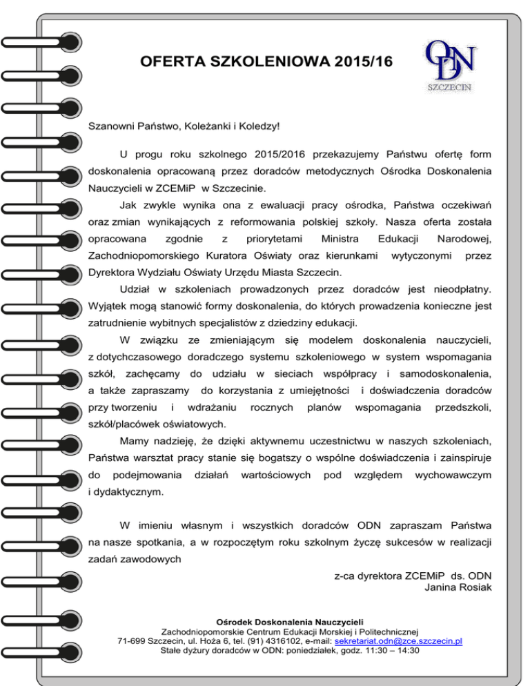 OFERTA SZKOLENIOWA 2015/16 Szanowni Państwo, Koleżanki i Koledzy! U progu roku szkolnego 2015/2016 przekazujemy Państwu ofertę form doskonalenia opracowaną przez doradców metodycznych Ośrodka Doskonalenia Nauczycieli w ZCEMiP w Szczecinie. Jak zwykle wynika ona z ewaluacji pracy ośrodka, Państwa oczekiwań oraz zmian wynikających z reformowania polskiej szkoły. Nasza oferta została opracowana zgodnie z priorytetami Ministra Edukacji Zachodniopomorskiego Kuratora Oświaty oraz kierunkami Narodowej, wytyczonymi przez Dyrektora Wydziału Oświaty Urzędu Miasta Szczecin. Udział w szkoleniach prowadzonych przez doradców jest nieodpłatny. Wyjątek mogą stanowić formy doskonalenia, do których prowadzenia konieczne jest zatrudnienie wybitnych specjalistów z dziedziny edukacji. W związku ze zmieniającym się modelem doskonalenia nauczycieli, z dotychczasowego doradczego systemu szkoleniowego w system wspomagania szkół, zachęcamy do udziału w sieciach współpracy i samodoskonalenia, a także zapraszamy przy tworzeniu i do korzystania z umiejętności wdrażaniu rocznych planów i doświadczenia doradców wspomagania przedszkoli, szkół/placówek oświatowych. Mamy nadzieję, że dzięki aktywnemu uczestnictwu w naszych szkoleniach, Państwa warsztat pracy stanie się bogatszy o wspólne doświadczenia i zainspiruje do podejmowania działań wartościowych pod względem wychowawczym i dydaktycznym. W imieniu własnym i wszystkich doradców ODN zapraszam Państwa na nasze spotkania, a w rozpoczętym roku szkolnym życzę sukcesów w realizacji zadań zawodowych z-ca dyrektora ZCEMiP ds. ODN Janina Rosiak Ośrodek Doskonalenia Nauczycieli Zachodniopomorskie Centrum Edukacji Morskiej i Politechnicznej 71-699 Szczecin, ul. Hoża 6, tel. (91) 4316102, e-mail: [email protected] Stałe dyżury doradców w ODN: poniedziałek, godz. 11:30 – 14:30 OFERTA SZKOLENIOWA 2015/16 Tytuł szkolenia: STORYLINE - INSPIRUJĄCA METODA AKTYWNA Obszar edukacji: wychowanie przedszkolne Adresaci szkolenia: nauczyciele wychowania przedszkolnego , edukacji wczesnoszkolnej Cele szkolenia: po zakończeniu szkolenia nauczyciel: wymieni idee i opisze historię powstania metody Storyline rozwinie umiejętności formułowania prawidłowych pytań kluczowych rozwinie umiejętności planowania epizodów zawierających różnorodne aktywności edukacyjne rozwinie umiejętności planowania epizodów zawierających różnorodne obszary podstawy programowej wdroży do podejmowania skutecznej pracy metodą Storyline Liczba godzin: 2 Proponowane terminy szkoleń: październik, listopad, luty, marzec, kwiecień Miejsce przeprowadzenia szkolenia: do uzgodnienia Doradca ODN odpowiedzialny za organizację: Agnieszka Czeglik Osoba prowadząca szkolenie: Zgłoszenia indywidualne i grupowe, wyłącznie w formie elektronicznej, na formularzach pobranych ze strony ODN http://odn.zce.szczecin.pl/oferta.htm, należy przesyłać na adres e-mail: [email protected] Udział w szkoleniu jest bezpłatny. Szkolenie zostanie zrealizowane, jeśli zbierze się minimum 10 osób. Ośrodek Doskonalenia Nauczycieli Zachodniopomorskie Centrum Edukacji Morskiej i Politechnicznej 71-699 Szczecin, ul. Hoża 6, tel. (91) 4316102, e-mail: [email protected] Stałe dyżury doradców w ODN: poniedziałek, godz. 11:30 – 14:30 OFERTA SZKOLENIOWA 2015/16 Tytuł szkolenia: KLUB DYREKTORA PRZEDSZKOLA W RAMACH SIECI WSPÓŁPRACY I SAMOKSZTAŁCENIA Obszar edukacji: wychowanie przedszkolne Adresaci szkolenia: dyrektorzy przedszkoli Cele szkolenia: po zakończeniu szkolenia nauczyciel: podzieli sie swoją wiedzą i doświadczeniem z innymi wypracowuje narzędzia potrzebne do pracy dyrektora przedszkola systematycznie rozwinie nowe praktyczne umiejętności potrzebne w codziennej pracy dyrektora Liczba godzin: 2 Proponowane terminy szkoleń: październik, listopad, luty, marzec, kwiecień Miejsce przeprowadzenia szkolenia: ODN ZCEMiP ul.Hoża 6 Szczecin Doradca ODN odpowiedzialny za organizację: Agnieszka Czeglik Osoba prowadząca szkolenie: Zgłoszenia indywidualne i grupowe, wyłącznie w formie elektronicznej, na formularzach pobranych ze strony ODN http://odn.zce.szczecin.pl/oferta.htm, należy przesyłać na adres e-mail: [email protected] Udział w szkoleniu jest bezpłatny. Szkolenie zostanie zrealizowane, jeśli zbierze się minimum 10 osób. Ośrodek Doskonalenia Nauczycieli Zachodniopomorskie Centrum Edukacji Morskiej i Politechnicznej 71-699 Szczecin, ul. Hoża 6, tel. (91) 4316102, e-mail: [email protected] Stałe dyżury doradców w ODN: poniedziałek, godz. 11:30 – 14:30 OFERTA SZKOLENIOWA 2015/16 Tytuł szkolenia: PLANOWANIE I DOKUMENTACJA NAUCZYCIELA PRZEDSZKOLA Obszar edukacji: wychowanie przedszkolne Adresaci szkolenia: nauczyciele wychowania przedszkolnego Cele szkolenia: po zakończeniu szkolenia nauczyciel: poszerzy wiedzę na temat obowiązującej dokumentacji w przedszkolu nabędzie umiejętności planowania procesu opiekuńczo-wychowawczo-dydaktycznego wymieni możliwości dokumentowania pracy nauczyciela przedszkola Liczba godzin: 3 Proponowane terminy szkoleń: październik, listopad, luty, marzec, kwiecień Miejsce przeprowadzenia szkolenia: do uzgodnienia Doradca ODN odpowiedzialny za organizację: Agnieszka Czeglik Osoba prowadząca szkolenie: Zgłoszenia indywidualne i grupowe, wyłącznie w formie elektronicznej, na formularzach pobranych ze strony ODN http://odn.zce.szczecin.pl/oferta.htm, należy przesyłać na adres e-mail: [email protected] Udział w szkoleniu jest bezpłatny. Szkolenie zostanie zrealizowane, jeśli zbierze się minimum 10 osób. Ośrodek Doskonalenia Nauczycieli Zachodniopomorskie Centrum Edukacji Morskiej i Politechnicznej 71-699 Szczecin, ul. Hoża 6, tel. (91) 4316102, e-mail: [email protected] Stałe dyżury doradców w ODN: poniedziałek, godz. 11:30 – 14:30 OFERTA SZKOLENIOWA 2015/16 Tytuł szkolenia: W ZGODZIE ZE SOBĄ - EFEKTYWNA PRACA NAUCZYCIELA Obszar edukacji: wychowanie przedszkoln