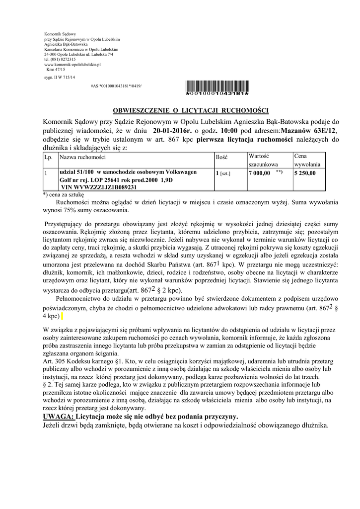 Komornik Sądowy przy Sądzie Rejonowym w Opolu Lubelskim Agnieszka Bąk-Batowska Kancelaria Komornicza w Opolu Lubelskim 24-300 Opole Lubelskie ul. Lubelska 7/4 tel. (081) 8272315 www.komornik-opolelubelskie.pl Kms 47/15 sygn. II W 715/14 #AS *0010001043181*/0419/ *0010001043181* OBWIESZCZENIE O LICYTACJI RUCHOMOŚCI Komornik Sądowy przy Sądzie Rejonowym w Opolu Lubelskim Agnieszka Bąk-Batowska podaje do publicznej wiadomości, że w dniu 20-01-2016r. o godz. 10:00 pod adresem:Mazanów 63E/12, odbędzie się w trybie ustalonym w art. 867 kpc pierwsza licytacja ruchomości należących do dłużnika i składających się z: Lp. Nazwa ruchomości udział 51/100 w samochodzie osobowym Volkswagen Golf nr rej. LOP 25641 rok prod.2000 1,9D VIN WVWZZZ1JZ1B089231 *) cena za sztukę 1 Ilość 1 [szt.] Wartość szacunkowa 7 000,00 **) Cena wywołania 5 250,00 Ruchomości można oglądać w dzień licytacji w miejscu i czasie oznaczonym wyżej. Suma wywołania wynosi 75% sumy oszacowania. Przystępujący do przetargu obowiązany jest złożyć rękojmię w wysokości jednej dziesiątej części sumy oszacowania. Rękojmię złożoną przez licytanta, któremu udzielono przybicia, zatrzymuje się; pozostałym licytantom rękojmię zwraca się niezwłocznie. Jeżeli nabywca nie wykonał w terminie warunków licytacji co do zapłaty ceny, traci rękojmię, a skutki przybicia wygasają. Z utraconej rękojmi pokrywa się koszty egzekucji związanej ze sprzedażą, a reszta wchodzi w skład sumy uzyskanej w egzekucji albo jeżeli egzekucja została umorzona jest przelewana na dochód Skarbu Państwa (art. 8671 kpc). W przetargu nie mogą uczestniczyć: dłużnik, komornik, ich małżonkowie, dzieci, rodzice i rodzeństwo, osoby obecne na licytacji w charakterze urzędowym oraz licytant, który nie wykonał warunków poprzedniej licytacji. Stawienie się jednego licytanta wystarcza do odbycia przetargu(art. 8672 § 2 kpc). Pełnomocnictwo do udziału w przetargu powinno być stwierdzone dokumentem z podpisem urzędowo poświadczonym, chyba że chodzi o pełnomocnictwo udzielone adwokatowi lub radcy prawnemu (art. 8672 § 4 kpc) W związku z pojawiającymi się próbami wpływania na licytantów do odstąpienia od udziału w licytacji przez osoby zainteresowane zakupem ruchomości po cenach wywołania, komornik informuje, że każda zgłoszona próba zastraszenia innego licytanta lub próba przekupstwa w zamian za odstąpienie od licytacji będzie zgłaszana organom ścigania. Art. 305 Kodeksu karnego §1. Kto, w celu osiągnięcia korzyści majątkowej, udaremnia lub utrudnia przetarg publiczny albo wchodzi w porozumienie z inną osobą działając na szkodę właściciela mienia albo osoby lub instytucji, na rzecz której przetarg jest dokonywany, podlega karze pozbawienia wolności do lat trzech. § 2. Tej samej karze podlega, kto w związku z publicznym przetargiem rozpowszechania informacje lub przemilcza istotne okoliczności mające znaczenie dla zawarcia umowy będącej przedmiotem przetargu albo wchodzi w porozumienie z inną osobą, działając na szkodę właściciela mienia albo osoby lub instytucji, na rzecz której przetarg jest dokonywany. UWAGA: Licytacja może się nie odbyć bez podania przyczyny. Jeżeli drzwi będą zamknięte, będą otwierane na koszt i odpowiedzialność obowiązanego dłużnika.