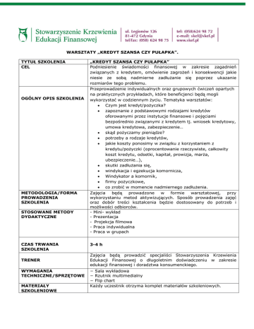 WARSZTATY „KREDYT SZANSA CZY PUŁAPKA”. TYTUŁ SZKOLENIA CEL OGÓLNY OPIS SZKOLENIA METODOLOGIA/FORMA PROWADZENIA SZKOLENIA STOSOWANE METODY DYDAKTYCZNE CZAS TRWANIA SZKOLENIA TRENER WYMAGANIA TECHNICZNE/SPRZĘTOWE MATERIAŁY SZKOLENIOWE „KREDYT SZANSA CZY PUŁAPKA” Podniesienie świadomości finansowej w zakresie zagadnień związanych z kredytem, omówienie zagrożeń i konsekwencji jakie niesie ze sobą nadmierne zadłużanie się poprzez ukazanie rozmiarów tego problemu. Przeprowadzenie indywidualnych oraz grupowych ćwiczeń opartych na praktycznych przykładach, które beneficjenci będą mogli wykorzystać w codziennym życiu. Tematyka warsztatów: Czym jest kredyt/pożyczka? zapoznanie z podstawowymi rodzajami kredytów oferowanymi przez instytucje finansowe i pojęciami bezpośrednio związanymi z kredytem tj. wniosek kredytowy, umowa kredytowa, zabezpieczenie… skąd pożyczamy pieniądze? potrzeby a rodzaje kredytów, jakie koszty ponosimy w związku z korzystaniem z kredytu/pożyczki (oprocentowanie rzeczywiste, całkowity koszt kredytu, odsetki, kapitał, prowizja, marża, ubezpieczenie…), skutki zadłużania się, windykacja i egzekucja komornicza, Windykator a komornik, firmy pożyczkowe, co zrobić w momencie nadmiernego zadłużenia. Zajęcia będą prowadzone w formie warsztatowej, przy wykorzystaniu metod aktywizujących. Sposób prowadzenia zajęć oraz dobór treści kształcenia będzie dostosowany do potrzeb i możliwości odbiorców. - Mini- wykład - Prezentacja - Projekcja filmowa - Praca indywidualna - Praca w grupach 3-4 h Zajęcia będą prowadzić specjaliści Stowarzyszenia Krzewienia Edukacji Finansowej o długoletnim doświadczeniu w zakresie edukacji finansowej i doradztwa konsumenckiego. − Sala wykładowa − Rzutnik multimedialny − Flip chart Każdy uczestnik otrzyma komplet materiałów szkoleniowych.