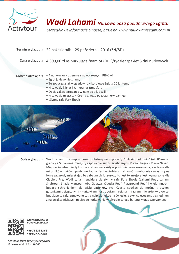 Wadi Lahami Nurkowa oaza południowego Egiptu Szczegółowe informacje o naszej bazie na www.nurkowanieegipt.com.pl Termin wyjazdu » 22 październik – 29 październik 2016 (7N/8D) Cena wyjazdu » 4.399,00 zł os nurkująca /namiot (DBL)/tydzień/pakiet 5 dni nurkowych Główne atrakcje » v 4 nurkowania dziennie z nowoczesnych RIB-ów! v Egipt jakiego nie znamy v Tu zobaczysz jak wyglądały rafy koralowe Egiptu 20 lat temu! v Niezwykły klimat i kameralna atmosfera v Opcja zakwaterowania w namiocie lub willi v Niezwykłe miejsce, które na zawsze pozostanie w pamięci v Słynne rafy Fury Shoals Opis wyjazdu » Wadi Lahami to camp nurkowy położony na naprawdę "dalekim południu" (ok. 80km od granicy z Sudanem), mniejszy i spokojniejszy od siostrzanych Marsa Shagra i Marsa Nakari. Miejsce świetne nie tylko dla nurków na każdym poziomie zaawansowania, ale także dla miłośników ptaków i pustynnej fauny. Jeśli uwielbiasz nurkować i swobodnie czujesz się na łonie przyrody mieszkając bez zbędnych luksusów, to jest to miejsce jest wymarzone dla Ciebie… Przy Wadi Lahami znajdują się słynne rafy Fury Shoals (Lahami Reef, Lahami Shabrour, Shaab Mansour, Abu Galawa, Claudia Reef, Playground Reef i wiele innych), będące schronieniem dla wielu gatunków ryb. Często spotkać się można z dużymi gatunkami pelagicznymi - tuńczykami, ostrobokami, rekinami i rajami. Twarde koralowce, budujące te rafy, uznawane są za najpiękniejsze na świecie, a okolice ecocampu są jednymi z najatrakcyjniejszych miejsc do nurkowania w obrębie całego basenu Morza Czerwonego. RAMOWY PROGRAM IMPREZY w opcji z 5 dniami nurkowymi* Dzień 1 » Zbiórka na lotniku na 2 godziny przed wylotem na lotnisku w Katowicach/Warszawie, Odprawa paszportowo-bagażowa, Wylot do Marsa Alam, Przylot do Egiptu, Transfer z lotniska do campu (ok. 2,5h z lotniska w Marsa Alam), Zakwaterowanie w namiotach/willach, Lunch, Zapoznanie z bazą, omówienie szczegółów, przygotowanie sprzętu nurkowego, Kolacja i czas wolny. Dzień 2-6 ** Śniadanie ok. godziny 06:00, (5 dni nurkowych) » Przygotowanie do wypłynięcia na 2 nurkowania (nurkowanie z RIB – u), Dwa nurkowania na rafach Fury Shoals (w przerwie można napić się kawy/herbaty i zjeść ciasto), Powrót do campu na lunch, Sjesta, Trzecie nurkowanie na pobliskich rafach (nurkowanie z RIB – u), Powrót do bazy, Przygotowanie do nurkowania nocnego (nurkowanie z RIB – u), Czwarte nurkowanie nocne, Powrót na kolację, czas wolny, nocleg. Dzień 7 » Śniadanie, Czas wolny – możliwość skorzystania z wycieczek fakultatywnych – informacje szczegółowe na stronie www.nurkowanieegipt.com.pl, Lunch, Czas wolny, kolacja, przygotowanie do wyjazdu, czas wolny, nocleg. Dzień 8 » Śniadanie, Wykwaterowanie z campu, Transfer na lotnisko w Marsa Alam, Odprawa paszportowo-bagażowa, Przelot do Polski, Zakończenie imprezy. * - dokładny program imprezy uzależniony jest od aktualnych godzin przelotu. Doba pobytowa zaczyna się o godz. 14.00, a kończy o godz. 12.00. Za skorzystanie z zakwaterowania w ciągu dnia (do zachodu słońca), pobierana jest na miejscu dopłata w wysokości połowy stawki dziennej. Późny checkout (do godz. 14:00) bezpłatnie - w miarę dostępności! Prosimy zabrać na wyjazd: ręcznik oraz kosmetyki: szampon, żel pod prysznic, pastę do zębów itp... OPIS ECOCAMPU NURKOWEGO WADI LAHAMI Opis główny campu» Do miejsc nurkowych dociera się pontonami typu RIB. Przewodnicy opracowali program podwodnych wycieczek, trwających z reguły 60 minut każda. Wymagane jest minimum 20 zalogowanych nurkowań i obowiązkowe posiadanie komputera nurkowego (można go wypożyczyć na miejscu za 10 EUR/dzień). Jedynie dwa pierwsze nurkowania w ciągu dnia odbywają się w asyście przewodnika. Trzecie nurkowanie wykonywane jest samodzielnie (w parach), podobnie jak nocne. Zaplecze nurkowe wyposażone jest w zbiorniki ze słodką wodą do płukania sprzętu i wieszaki na sprzęt, a także w dostęp do elektryczności 220 V do ładowania akumulatorów latarek i sprzętu fotograficznego. Zaleca się, by korzystający z elektryczności goście posiadali szybkie ładowarki (max. 6 godzin). Butle nurkowe, znajdujące się na wyposażeniu campu są aluminiowe o pojemności 12l. Po każdym nurkowaniu można skorzystać z pryszniców. Podczas pobytu w Wadi Lahami zapewniane jest pełne wyżywienie - 3 posiłki w ciągu dnia oraz słodka przekąska na podwieczorek. Ci z gości, którzy wymagają specjalnej diety, proszeni są o zgłoszenie tego faktu w momencie dokonywania rezerwacji. W przypadku wykonywania nurkowań nocnych, nurkowie proszeni są o zgłaszanie, czy kolacja ma być podana przed czy po nurkowaniu. Do posiłków przewidziane są zimne napoje, woda, kawa i herbata, piwo dostępne za opłatą. Wszystkie płatne napoje i usługi zostaną rozliczone zbiorczym rachunkiem pod koniec pobytu. Zaleca się, by goście mieli przy sobie gotówkę lub czeki podróżne, bowiem przy płatnością kartą doliczana jest dopłata transakcyjna w wysokości 3%. Rzeczy wartościowe można zamknąć w sejfie na cały okres pobytu w obozie. OPIS ECOCAMPU NURKOWEGO WADI LAHAMI Opis namiotów» Namioty w Wadi Lahami stoją tuż przy plaży, jest ich w sumie 30, powierzchnia każdego z nich wynosi 12m². W każdym z namiotów znajdują się dwa łóżka ustawione w odległości 2m od siebie. Na wyposażeniu są: dwa prześcieradła, koce i poduszki (dla każdego z gości). Obsługa w obozie zawsze służy pomocą, jeśli potrzebny jest dodatkowy materac lub pościel. Namioty mają dostęp do elektryczności, jednak przydaje się latarka czołowa, żeby bezpiecznie poruszać się po terenie campu w godzinach wieczornych. Prysznice i toalety zlokalizowane są w głównym budynku. Goście muszą zabrać ze sobą ręczniki (zarówno te do codziennego użycia, jak i plażowe), a także przybory toaletowe. Na terenie campu funkcjonują także namioty królewskie, dwa r