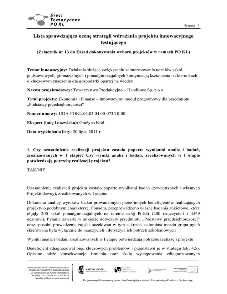 Strona 1 Lista sprawdzająca ocenę strategii wdrażania projektu innowacyjnego testującego (Załącznik nr 13 do Zasad dokonywania wyboru projektów w ramach PO KL) Temat innowacyjny: Działania służące zwiększeniu zainteresowania uczniów szkół podstawowych, gimnazjalnych i ponadgimnazjalnych kontynuacją kształcenia na kierunkach o kluczowym znaczeniu dla gospodarki opartej na wiedzy Nazwa projektodawcy: Towarzystwo Produkcyjno – Handlowe Sp. z o.o. Tytuł projektu: Ekonomia i Finanse – innowacyjny moduł programowy dla przedmiotu „Podstawy przedsiębiorczości” Numer umowy: UDA-POKL.03.03.04.00-073/10-00 Ekspert (imię i nazwisko): Grażyna Król Data wypełnienia listy: 20 lipca 2011 r. 1. Czy uzasadnienie realizacji projektu zostało poparte wynikami analiz i badań, zrealizowanych w I etapie? Czy wyniki analiz i badań, zrealizowanych w I etapie potwierdzają potrzebę realizacji projektu? TAK/NIE Uzasadnienie realizacji projektu zostało poparte wynikami badań (zewnętrznych i własnych Projektodawcy), zrealizowanych w I etapie. Dokonano analizy wyników badań prowadzonych przez innych beneficjentów realizujących projekty o podobnym charakterze. Ponadto, przeprowadzono własne badania ankietowe, które objęły 200 szkół ponadgimnazjalnych na terenie całej Polski (200 nauczycieli i 4569 uczniów). Pytania zawarte w ankiecie dotyczyły przedmiotu „Podstawy przędsiębiorczości” oraz sposobu prowadzenia zajęć i oczekiwań w tym zakresie, natomiast trzecia grupa pytań skierowana była wyłącznie do nauczycieli i dotyczyła ich potrzeb szkoleniowych Wyniki analiz i badań, zrealizowanych w I etapie potwierdzają potrzebę realizacji projektu. Beneficjent zdiagnozował pięć kluczowych problemów i przedstawił je w strategii (str. 4,5). Opisano także konsekwencje istnienia oraz skalę występowania zdiagnozowanych Strona 2 problemów. Wnioskodawca podaje również receptę/odpowiedź na zdiagnozowane problemy, którą ma być: - unowocześnienie programów nauczania poprzez wprowadzenie do nich elementów zaktualizowanej wiedzy ekonomiczno-finansowej i dostosowanie ich do realiów gospodarczych - wdrożenie do procesu kształcenia nowoczesnych i efektywnych narzędzi nauczania wykorzystujących zaawansowane technologie i motywujących uczniów do poszerzania swojej wiedzy w tym obszarze. 2. Czy cel projektu jest taki sam, jak zadeklarowane przez beneficjenta w strategii brzmienie celu cytowanego z wniosku o dofinansowanie? TAK/NIE Cel wdrożenia innowacji jest tożsamy z celem zapisanym we wniosku o dofinansowanie projektu. Jest nim zwiększenie motywacji uczniów do kształcenia w dziedzinach o kluczowym znaczeniu dla gospodarki (ekonomia, finanse, przedsiębiorczość) oraz kształtowanie postaw przedsiębiorczych poprzez opracowanie i wdrożenie innowacyjnego programu nauczania wykorzystującego nowoczesne techniki kształcenia. Opis celu w strategii został poszerzony o uwagi dotyczące m.in. metodologii i narzędzi pomiaru efektów jakościowych osiągniętych w czasie realizacji projektu. Wskazano na ankiety ewaluacyjne wartościujące wykorzystujące do oceny rezultatów wskaźniki jakościowe wartościujące (źle, dostatecznie, dobrze, bardzo dobrze) lub skalę ocen (1-5). 3. Czy wskaźniki są właściwie zdefiniowane? TAK/NIE Wskaźniki zostały właściwie zdefiniowane w kontekście celów szczegółowych 1,2,3,5. Wątpliwości budzą wskaźniki w odniesieniu do celu numer 4. Cel opisano jako: „Wdrożenie do programu nauczania przedmiotu Podstawy przedsiębiorczości innowacyjnego modułu programowego uwzględniającego w treściach realia współczesnej gospodarki i ekonomii oraz znajomość nowoczesnych instrumentów finansowych”. Jeżeli przez „wdrożenie do programu nauczania” rozumieć innowację prowadzoną zgodnie z obowiązującym w tym zakresie Rozporządzeniem Ministra Edukacji Narodowej i Sportu Strona 3 z dnia 9 kwietnia 2002 r. w sprawie warunków prowadzenia działalności innowacyjnej i eksperymentalnej przez publiczne szkoły i placówki (Dz. U.z 2002 r., nr 56, poz. 506) – to weryfikacja rezultatu na podstawie ilości szkół uczestniczących w projekcie, raportów statystycznych z panelu administratora nie jest wystarczająca. Kwestię tę należałoby doprecyzować. 4. Czy wartości docelowe wskaźników celu i sposób ich pomiaru oraz źródła weryfikacji zostały określone prawidłowo (odpowiednio do celu)? TAK/NIE Wartości docelowe wskaźników celu i sposób ich pomiaru oraz źródła weryfikacji zostały na ogół określone prawidłowo, wskazane są jednakże pewne doprecyzowania w zapisach. W przypadku celu szczegółowego 4: (komentarz zamieszczono już powyżej) – wyjaśnienia wymagałaby kwestia co rozumiane jest jako „wdrożenie do programu nauczania”. Jeżeli przez „wdrożenie do programu nauczania” rozumieć innowację prowadzoną zgodnie z obowiązującym w tym zakresie Rozporządzeniem Ministra Edukacji Narodowej i Sportu z dnia 9 kwietnia 2002 r. w sprawie warunków prowadzenia działalności innowacyjnej i eksperymentalnej przez publiczne szkoły i placówki (Dz. U.z 2002 r., nr 56, poz. 506) – to weryfikacja rezultatu na podstawie ilości szkół uczestniczących w projekcie czy raportów statystycznych z panelu administratora nie jest adekwatna. W przypadku pozostałych celów szczegółowych - brak zastrzeżeń. 5. Czy przedstawiona innowacja została opisana kompleksowo, z uwzględnieniem wszystkich wymaganych elementów? TAK/NIE Prezentowana innowacja została opisana w sposób prawidłowy i wyczerpujący. Projektodawca wskazał na rodzaj innowacji (programowa, metodyczna), opisał elementy innowacji (innowacyjny moduł programowy, platforma internetowa dla nauczycieli, symulacyjna gra internetowa dla uczniów umożliwiająca uruchomienie i prowadzenie działalności gospodarczej w warunkach bardzo zbliżonych do realiów gospodarczych), uzasadnił innowacyjność proponowa