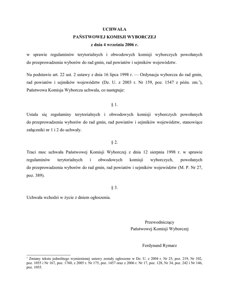 UCHWAŁA PAŃSTWOWEJ KOMISJI WYBORCZEJ z dnia 4 września 2006 r. w sprawie regulaminów terytorialnych i obwodowych komisji wyborczych powołanych do przeprowadzenia wyborów do rad gmin, rad powiatów i sejmików województw. Na podstawie art. 22 ust. 2 ustawy z dnia 16 lipca 1998 r. — Ordynacja wyborcza do rad gmin, rad powiatów i sejmików województw (Dz. U. z 2003 r. Nr 159, poz. 1547 z późn. zm.1), Państwowa Komisja Wyborcza uchwala, co następuje: § 1. Ustala się regulaminy terytorialnych i obwodowych komisji wyborczych powołanych do przeprowadzenia wyborów do rad gmin, rad powiatów i sejmików województw, stanowiące załączniki nr 1 i 2 do uchwały. § 2. Traci moc uchwała Państwowej Komisji Wyborczej z dnia 12 sierpnia 1998 r. w sprawie regulaminów terytorialnych i obwodowych komisji wyborczych, powołanych do przeprowadzenia wyborów do rad gmin, rad powiatów i sejmików województw (M. P. Nr 27, poz. 389). § 3. Uchwała wchodzi w życie z dniem ogłoszenia. Przewodniczący Państwowej Komisji Wyborczej Ferdynand Rymarz 1 Zmiany tekstu jednolitego wymienionej ustawy zostały ogłoszone w Dz. U. z 2004 r. Nr 25, poz. 219, Nr 102, poz. 1055 i Nr 167, poz. 1760, z 2005 r. Nr 175, poz. 1457 oraz z 2006 r. Nr 17, poz. 128, Nr 34, poz. 242 i Nr 146, poz. 1055. Załącznik nr 2 do uchwały Państwowej Komisji Wyborczej z dnia 4 września 2006 r. (poz. …) REGULAMIN OBWODOWYCH KOMISJI WYBORCZYCH § 1. Obwodowa komisja wyborcza, zwana dalej „komisją”, wykonuje swoje zadania określone w ustawie — Ordynacja wyborcza do rad gmin, rad powiatów i sejmików województw, zwanej dalej „Ordynacją wyborczą” i w ustawie o bezpośrednim wyborze wójta, burmistrza i prezydenta miasta, zwanej dalej „ustawą”, stosując się do wytycznych i innych uchwał oraz wyjaśnień Państwowej Komisji Wyborczej, a także wyjaśnień komisarza wyborczego. W razie wątpliwości komisja może się zwracać o dodatkowe wyjaśnienia do komisarza wyborczego. § 2. 1. Komisja rozstrzyga w sprawach należących do jej właściwości w obecności co najmniej połowy swojego składu, w tym przewodniczącego komisji lub jego zastępcy. 2. Rozstrzygnięcia komisji zapadają większością głosów w głosowaniu jawnym. W razie równej liczby głosów, rozstrzyga głos przewodniczącego posiedzenia. § 3. 1. Komisja zbiera się na pierwszym posiedzeniu nie później niż w 5. dniu od dnia jej powołania. 2. Na pierwszym posiedzeniu komisja: 1) wybiera przewodniczącego komisji oraz jego zastępcę, z zastrzeżeniem art. 18 ust. 4a Ordynacji wyborczej; 2) omawia zadania i ustala tryb swojej pracy oraz obowiązki i uprawnienia osób wchodzących w jej skład; 3) ustala zadania do dnia wyborów, w tym związane z udziałem członków komisji w szkoleniach, przygotowaniem lokalu wyborczego, odbiorem i zabezpieczeniem kart do głosowania, formularzy wyborczych, spisu wyborców, pieczęci komisji, urzędowych obwieszczeń wyborczych i innych materiałów. 3. Wybory przewodniczącego komisji i oddzielnie jego zastępcy odbywają się w głosowaniu jawnym, chyba że komisja postanowi inaczej. W razie równej liczby głosów ponawia się głosowanie. 4. Do czasu wyboru przewodniczącego pierwszemu posiedzeniu komisji przewodniczy najstarszy wiekiem członek komisji. 5. Komisja zapoznaje się z wytycznymi i innymi uchwałami oraz wyjaśnieniami Państwowej Komisji Wyborczej dotyczącymi przeprowadzenia głosowania i ustalenia jego wyników oraz na tej podstawie sporządza plan pracy. § 4. 1. Pracami komisji kieruje, zwołuje jej posiedzenia i im przewodniczy przewodniczący komisji. 2. W razie nieobecności przewodniczącego jego obowiązki pełni zastępca przewodniczącego komisji. § 5. 1. Członkowie komisji uczestniczą w posiedzeniach i innych pracach komisji. 2. W razie niemożności wzięcia udziału w pracach komisji, jej członek jest obowiązany powiadomić o tym, w miarę możliwości jeszcze przed posiedzeniem, przewodniczącego lub jego zastępcę. § 6. 1. Rozstrzygnięcia komisji mogą mieć formę odrębnych uchwał bądź wpisanych do protokołu. 2. Uchwały podpisuje przewodniczący posiedzenia. § 7. 1. Z posiedzenia komisji sporządza się protokół, w którym podaje się: 1) porządek obrad; 2) imiona i nazwiska uczestników; 3) przebieg posiedzenia i podjęte rozstrzygnięcia. 2. Do protokołu dołącza się podjęte uchwały oraz inne dokumenty. 3. Protokół podpisuje przewodniczący posiedzenia. § 8. 1. Protokół głosowania w obwodzie podpisują wszystkie osoby wchodzące w skład komisji, obecne przy jego sporządzaniu. 2. Uchwały komisji lub zarządzenia jej przewodniczącego, dotyczące przebiegu głosowania bądź ustalenia jego wyników, wpisuje się do protokołu głosowania. 3. Uchwały, protokoły głosowania i inne dokumenty komisji oraz wydawane karty do głosowania opatrywane są pieczęcią komisji. § 9. Komisja współdziała w wykonywaniu swoich zadań wyborczych z wójtem, burmistrzem, prezydentem miasta, w szczególności w zakresie: 1)przygotowania i wyposażenia lokalu wyborczego; 2)odbioru i zabezpieczenia kart do głosowania, formularzy, spisu wyborców, pieczęci komisji, urzędowych obwieszczeń wyborczych i innych materiałów wyborczych; 3)przekazania protokołów głosowania do właściwej terytorialnej komisji wyborczej; 4)zapewnienia środków łączności i transportu oraz pomocy niezbędnej do pracy komisji. § 10. Na żądanie Państwowej Komisji Wyborczej lub komisarza wyborczego oraz osób upoważnionych przez te organy wyborcze komisja udziela informacji o wykonywaniu swoich zadań i udostępnia dokumenty oraz materiały w tym zakresie. § 11. Przewodniczący wydaje członkom komisji dokument potwierdzający członkostwo i pełnione w komisji funkcje. § 12. W wypadku konieczności dokonania zmiany w składzie komisji, jej przewodniczący niezwłocznie powiadamia o tym gminną (miejską) komisję wyborczą za pośrednictwem wójt