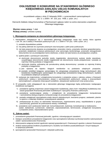 OGŁOSZENIE O KONKURSIE NA STANOWISKO GŁÓWNEGO KSIĘGOWEGO ZAKŁADU USŁUG KOMUNALNYCH W PIECHOWICACH na podstawie ustawy z dnia 21 listopada 2008 r. o pracownikach samorządowych (Dz. U. z 2008 r. Nr 223, poz. 1458, z późn. zm.) Kierownik Zakładu Usług Komunalnej w Piechowicach ogłasza nabór na wolne stanowisko urzędnicze: Głównego księgowego. Wymiar czasu pracy: 1 etat Rodzaj umowy: umowa o pracę I. Wymagania związane ze stanowiskiem głównego księgowego. 1. Kandydatem ubiegającym się o stanowisko głównego księgowego może być osoba, która zgodnie z art. 54, ust.2 ustawy o finansach publicznych (Dz. U. z 2009 nr 157 poz. 1240 z późn. zm.): 1) posiada obywatelstwo polskie 2) ma pełną zdolność do czynności prawnych oraz korzystać z pełni praw publicznych; 3) nie była prawomocnie skazana za przestępstwa: przeciwko mieniu, przeciwko obrotowi gospodarczemu, przeciwko działalności instytucji państwowych oraz samorządu terytorialnego, przeciwko wiarygodności dokumentów lub za przestępstwo karne skarbowe, a także nie była karana za przestępstwo umyślne; 4) spełnia jeden z poniższych warunków: a) ukończyła ekonomiczne jednolite studia magisterskie, ekonomiczne wyższe studia zawodowe, uzupełniające ekonomiczne studia magisterskie lub ekonomiczne studia podyplomowe i posiada co najmniej 3-letnią praktykę w księgowości, b) ukończyła średnią, policealną lub pomaturalną szkołę ekonomiczną i posiada co najmniej 6-letnią praktykę w księgowości, c) jest wpisana do rejestru biegłych rewidentów na podstawie odrębnych przepisów, d) posiada certyfikat księgowy uprawniający do usługowego prowadzenia ksiąg rachunkowych albo świadectwo kwalifikacyjne uprawniające do usługowego prowadzenia ksiąg rachunkowych, wydane na podstawie odrębnych przepisów. 5) wykazuje się znajomością i umiejętnością korzystania z przepisów prawa z zakresu ustawy o finansach publicznych, ustawy o rachunkowości, prawa o zamówieniach publicznych, ustawy o pracownikach samorządowych, przepisów dotyczących podatków, ubezpieczeń społecznych oraz prawa pracy. 2. W przypadku osób ubiegających się o stanowisko głównego księgowego będą preferowane następujące dodatkowe wymagania: 1) posiadanie ogólnej znajomości zasad księgowości budżetowej, planu kont i klasyfikacji budżetowej oraz zasad gospodarki finansowej jednostek budżetowych i dyscypliny finansów publicznych; 2) posiadanie wystarczającej wiedzy i umiejętności do prowadzenia księgowości komputerowej i samodzielnej obsługi programu komputerowego do prowadzenia księgowości; 3) posiada umiejętność sporządzania analiz danych statystycznych, tworzenia prognoz, zestawień, planów w oparciu o materiały źródłowe i przewidywane założenia; 4) predyspozycje do pracy na stanowisku kierowniczym, organizowania pracy, współdziałania w grupie pracowniczej, gotowość do podnoszenia wiedzy i kwalifikacji, 5) posiadanie cech osobowości takich jak: komunikatywność, dyskrecja, konsekwencja w realizowaniu zadań, dokładność, sumienność, rzetelność, odpowiedzialność, terminowość, umiejętność korzystania z przepisów prawa, nieposzlakowana opinia. II. Zakres zadań: 1. prowadzenie gospodarki finansowej jednostki, zgodnie z obowiązującymi zasadami; 2. bieżące i prawidłowe prowadzenie księgowości oraz sporządzanie kalkulacji wynikowej kosztów wykonywanych zadań i sprawozdawczości finansowej; 3. dokonywanie wstępnej kontroli zgodności operacji gospodarczych i finansowych zgodnie z planem finansowym 4. analiza wykorzystania środków przydzielonych z budżetu lub środków pozabudżetowych i innych będących w dyspozycji jednostki; 5. sporządzanie sprawozdań finansowych i statystyki publicznej; 6. zapewnienie pod względem finansowym prawidłowości umów zawieranych przez jednostkę, w tym przestrzeganie ustawy o zamówieniach publicznych; 7. opracowywanie projektów przepisów wewnętrznych wydawanych przez dyrektora jednostki, dotyczących prowadzenia rachunkowości, a w szczególności zakładowego planu kont, obiegu dokumentów (dowodów księgowych) zasad przeprowadzania i rozliczania inwentaryzacji; 8. sporządzanie, przyjmowanie, obieg, archiwizowanie i kontrola dokumentów; 9. naliczanie wynagrodzeń w programie płacowym GRATYFIKANT oraz rozliczanie składek ZUS; 10. przestrzeganie dyscypliny finansów publicznych. III. Wymagane dokumenty: 1. CV oraz list motywacyjny *) 2. Kserokopia dowodu osobistego potwierdzająca obywatelstwo polskie, 3. Kserokopie dokumentów potwierdzających posiadane wykształcenie (uwierzytelnione) 4. Kserokopie dokumentów potwierdzających staż pracy (świadectwa pracy lub w razie pozostawania w zatrudnieniu - zaświadczenie) oraz dokumentów o posiadanym doświadczeniu zawodowym (np. opinie i referencje), 5. Dokumenty potwierdzające wymagane kwalifikacje i umiejętności 6. Zaświadczenie kandydata o niekaralności z Krajowego Rejestru Karnego, wystawione nie wcześniej niż 3 miesiące przed datą ukazania się ogłodzenia o naborze, 7. Oświadczenie o pełnej zdolności do czynności prawnej i korzystanie z pełni praw publicznych. 8. Aktualne zaświadczenie o stanie zdrowia, pozwalające na zatrudnienie. 9. Kwestionariusz osobowy, *) Dokumenty: CV, list motywacyjny powinny być opatrzone klauzulą: Wyrażam zgodę na przetwarzanie moich danych osobowych zawartych w ofercie pracy dla potrzeb niezbędnych do realizacji procesu rekrutacji zgodnie z ustawą z 29.08.1997r.o ochronie danych osobowych ( Dz.U. z 2002r. Nr 101, poz. 926) oraz ustawą z 21.11.2008r. o pracownikach samorządowych (Dz.U. z 2008 r. Nr 223,poz. 1458). IV. Sposób, miejsce i termin składania dokumentów: Kandydaci są zobowiązani do: a) złożenia dokumentów w zamkniętej kopercie, na której należy umieścić tytuł postępowania: „Konkurs na stanowisko głównego księgowego ZUK". b) złożenia dokumentów w terminie do dnia 