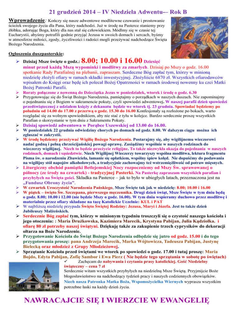 21 grudzień 2014 – IV Niedziela Adwentu-– Rok B Wprowadzenie: Kończy się nasze adwentowe modlitewne czuwanie i prostowanie ścieżek swojego życia dla Pana, który nadchodzi. Już w środę na Pasterce staniemy przy żłóbku, adorując Boga, który dla nas stał się człowiekiem. Módlmy się w czasie tej Eucharystii, abyśmy potrafili godnie przyjąć Jezusa w swoich domach i sercach, byśmy w atmosferze miłości, zgody, życzliwości i radości mogli przeżywać nadchodzące Święta Bożego Narodzenia. Ogłoszenia duszpasterskie: 8.00; 10.00 i 16.00 Dzisiaj Msze święte o godz.: Dziesięć minut przed każdą Mszą wypominki i modlitwy za zmarłych. Dzisiaj po Mszy o godz. 16.00 spotkanie Rady Parafialnej na plebanii, zapraszam. Serdeczne Bóg zapłać tym, którzy w minioną niedzielę złożyli ofiary w ramach składki inwestycyjnej. Złożyliście 6870 zł. Wszystkich ofiarodawców wpisałem do Księgi oraz będę ich polecał Bożej Opatrzności w ramach środowej nowenny ku czci Matki Bożej Patronki Parafii. Roraty połączone z nowenną do Dzieciątka Jezus w poniedziałek, wtorek i środę o godz. 6.30 Przygotowując się do Świąt Bożego Narodzenia, pamiętajmy o porządkach w naszych duszach. Nie zapominajmy o pojednaniu się z Bogiem w sakramencie pokuty, czyli spowiedzi adwentowej. W naszej parafii dzień spowiedzi przedświątecznej z udziałem księży z dekanatu będzie we wtorek tj. 23 grudnia. Spowiadać będziemy po południu od 14.00 do 17.00 z przerwą o godz. 15.30 do 16.00 Konfesjonały są rozłożone po bokach, warto rozglądać się za wolnym spowiednikiem, aby nie stać z tyłu w kolejce. Bardzo serdecznie proszę wszystkich Parafian o skorzystanie w tym dniu z Sakramentu Pokuty. Dzisiaj spowiedź adwentowa w Porąbce Uszewskiej od 13.00 do 16.00. W poniedziałek 22 grudnia odwiedziny chorych po domach od godz. 8.00. W dalszym ciągu można ich zgłaszać w zakrystii. W środę będziemy przeżywać Wigilię Bożego Narodzenia. Postarajmy się, aby wigilijnemu wieczorowi nadać godną i pełną chrześcijańskiej powagi oprawę. Zasiądźmy wspólnie w naszych rodzinach do wieczerzy wigilijnej. Niech to będzie przeżycie religijne. To także niezwykła okazja do pojednania w naszych rodzinach, domach i sąsiedztwie. Niech Wigilijnej Wieczerzy towarzyszy wspólna modlitwa, lektura fragmentu Pisma św. o narodzeniu Zbawiciela, łamanie się opłatkiem, wspólny śpiew kolęd. Nie dopuśćmy do podawania na wigilijny stół napojów alkoholowych, a tradycyjnie zachowajmy też wstrzemięźliwość od potraw mięsnych. Liturgiczny obchód pamiątki Betlejemskiej Nocy rozpoczniemy od Mszy Św. sprawowanej o północy (ze środy na czwartek) - tradycyjnej Pasterki. Na Pasterkę zapraszam wszystkich parafian i przybyłych na Święta gości. Składka na Pasterce – jak to było w ubiegłych latach, przeznaczona jest na „Fundusz Obrony życia”. W czwartek Uroczystość Narodzenia Pańskiego, Msze Święte tak jak w niedzielę: 8.00; 10.00 i 16.00 W piątek – święto Św. Szczepana, pierwszego męczennika. Drugi dzień świąt, Msze Święte w tym dniu będą o godz. 8.00; 10.00 i 12.00 (nie będzie Mszy o godz. 16.00). W tym dniu wspieramy duchowo przez modlitwę i materialnie przez ofiary składane na tacę Katolickie Uczelnie: KUL i PAT W najbliższą niedzielę przypada Święto Świętej Rodziny: Jezusa, Maryi i Józefa. Jest to także dzień Jubileuszy Małżeńskich. Serdecznie Bóg zapłać tym, którzy w minionym tygodniu troszczyli się o czystość naszego kościoła i jego otoczenia: : Maria Drużkowska, Kazimiera Marecik, Krystyna Pabijan, Julia Kądziołka. i ofiarę 80 zł potrzeby naszej świątyni. Dziękuję także za zakupienie trzech cyprysików do dekoracji ołtarza na Boże Narodzenie. Przygotowanie Kościoła do Świąt Bożego Narodzenia odbędzie się jutro od godz. 15.00 i do tego przygotowania proszę: pana Andrzeja Marecik, Marka Wójtowicza, Tadeusza Pabijan, Justynę Bielecką oraz młodzież z Grupy Młodzieżowej. Sprzątanie Kościoła przed świętami we wtorek po spowiedzi o godz. 17.00 i tutaj proszę: Maria Bojdo, Edyta Pabijan, Zofię Sambor i Ewa Pierz ( Nie będzie tego sprzątania w sobotę po świętach) Zachęcam do nabywania i czytania prasy katolickiej. Gość Niedzielny świąteczny – cena 7 zł Serdecznie witam wszystkich przybyłych na niedzielną Msze Świętą. Przyjmijcie Boże błogosławieństwo na nadchodzący tydzień pracy i naszych codziennych obowiązków. Niech nasza Patronka Matka Boża, Wspomożycielka Wiernych wyprasza wszystkim potrzebne łaski na każdy dzień życia. NAWRACAJCIE SIĘ I WIERZCIE W EWANGELIĘ