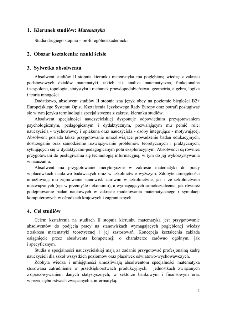 1. Kierunek studiów: Matematyka Studia drugiego stopnia – profil ogólnoakademicki 2. Obszar kształcenia: nauki ścisłe 3. Sylwetka absolwenta Absolwent studiów II stopnia kierunku matematyka ma pogłębioną wiedzę z zakresu podstawowych działów matematyki, takich jak analiza matematyczna, funkcjonalna i zespolona, topologia, statystyka i rachunek prawdopodobieństwa, geometria, algebra, logika i teoria mnogości. Dodatkowo, absolwent studiów II stopnia zna język obcy na poziomie biegłości B2+ Europejskiego Systemu Opisu Kształcenia Językowego Rady Europy oraz potrafi posługiwać się w tym języku terminologią specjalistyczną z zakresu kierunku studiów. Absolwent specjalności nauczycielskiej dysponuje odpowiednim przygotowaniem psychologicznym, pedagogicznym i dydaktycznym, pozwalającym mu pełnić role: nauczyciela - wychowawcy i opiekuna oraz nauczyciela - osoby integrująco - motywującej. Absolwent posiada także przygotowanie umożliwiające prowadzenie badań edukacyjnych, dostrzeganie oraz samodzielne rozwiązywanie problemów teoretycznych i praktycznych, sytuujących się w dydaktyczno-pedagogicznym polu eksploracyjnym. Absolwenci są również przygotowani do posługiwania się technologią informacyjną, w tym do jej wykorzystywania w nauczaniu. Absolwent ma przygotowanie merytoryczne w zakresie matematyki do pracy w placówkach naukowo-badawczych oraz w szkolnictwie wyższym. Zdobyte umiejętności umożliwiają mu zajmowanie stanowisk zarówno w szkolnictwie, jak i ze szkolnictwem niezwiązanych (np. w przemyśle i ekonomii), a wymagających samokształcenia, jak również podejmowanie badań naukowych w zakresie modelowania matematycznego i symulacji komputerowych w ośrodkach krajowych i zagranicznych. 4. Cel studiów Celem kształcenia na studiach II stopnia kierunku matematyka jest przygotowanie absolwentów do podjęcia pracy na stanowiskach wymagających pogłębionej wiedzy z zakresu matematyki teoretycznej i jej zastosowań. Koncepcja kształcenia zakłada osiągnięcie przez absolwenta kompetencji o charakterze zarówno ogólnym, jak i specyficznym. Studia o specjalności nauczycielskiej mają za zadanie przygotować profesjonalną kadrę nauczycieli dla szkół wszystkich poziomów oraz placówek oświatowo-wychowawczych. Zdobyta wiedza i umiejętności umożliwiają absolwentom specjalności matematyka stosowana zatrudnienie w przedsiębiorstwach produkcyjnych, jednostkach związanych z opracowywaniem danych statystycznych, w sektorze bankowym i finansowym oraz w przedsiębiorstwach związanych z informatyką. 1 Studia na tym kierunku przygotowują absolwenta do samodzielnego poszerzania zdobytej wiedzy i umożliwiają podjęcie dalszego kształcenia na studiach III stopnia oraz podnoszenie kwalifikacji na studiach podyplomowych. 5. Kierunkowe efekty kształcenia i ich odniesienie do kształcenia w obszarze kształcenia w zakresie nauk ścisłych Objaśnienie oznaczeń: K (przed podkreślnikiem) – kierunkowe efekty kształcenia W – kategoria wiedzy U – kategoria umiejętności K (po podkreślniku) – kategoria kompetencji społecznych X2A – efekty kształcenia w obszarze kształcenia w zakresie nauk ścisłych dla studiów drugiego stopnia 01, 02, 03 i kolejne – numer efektu kształcenia Nazwa kierunku: matematyka Stopień studiów: drugi Profil: ogólnoakademicki Kierunkowe efekty kształcenia Symbol Po ukończeniu studiów drugiego stopnia na kierunku studiów matematyka absolwent: Odniesienie do efektów kształcenia w obszarze kształcenia w zakresie nauk ścisłych WIEDZA K_W01 posiada pogłębioną wiedzę z zakresu podstawowych działów matematyki K_W02 rozumie rolę i znaczenie rozumowań matematycznych K_W03 K_W04 K_W05 K_W06 K_W07 zna najważniejsze twierdzenia i hipotezy z głównych działów matematyki ma pogłębioną wiedzę w wybranej dziedzinie matematyki teoretycznej lub stosowanej zna większość klasycznych definicji i twierdzeń oraz ich dowody w wybranej dziedzinie matematyki potrafi zrozumieć sformułowania zagadnień pozostających na etapie badań w wybranej dziedzinie matematyki zna powiązania zagadnień wybranej dziedziny matematyki z innymi działami matematyki teoretycznej i stosowanej X2A_W01 X2A_W01 X2A_W03 X2A_W01 X2A_W06 X2A_W02 X2A_W02 X2A_W02 X2A_W06 X2A_W02 X2A_U04 2 K_W08 K_W09 K_W10 K_W11 K_W12 K_W13 K_W14 zna zaawansowane techniki obliczeniowe, wspomagające pracę matematyka i rozumie ich ograniczenia zna podstawy modelowania stochastycznego w matematyce finansowej i aktuarialnej lub w naukach przyrodniczych, w szczególności fizyce, chemii i biologii zna metody numeryczne stosowane do znajdowania przybliżonych rozwiązań zagadnień matematycznych (na przykład równań różniczkowych), stawianych przez dziedziny stosowane (np. technologie przemysłowe, zarządzanie) zna matematyczne podstawy teorii informacji, teorii algorytmów oraz ich praktyczne zastosowania m.in. w programowaniu i szeroko rozumianych technikach informatycznych zna dobrze co najmniej jeden pakiet oprogramowania, służący do obliczeń symbolicznych i jeden pakiet do statystycznej obróbki danych zna język obcy na poziomie średniozaawansowanym (B2+) w stopniu wystarczającym do studiowania literatury fachowej zna obowiązujące zasady bezpieczeństwa i higieny pracy X2A_W03 X2A_W04 X2A_W05 X2A_U02 X2A_W03 X2A_W04 X2A_W03 X2A_W04 X2A_U04 X2A_W03 X2A_W04 X2A_U04 X2A_W04 X2A_W05 X2A_W06 X2A_U10 X2A_W07 UMIEJĘTNOŚCI K_U01 K_U02 K_U03 K_U04 K_U05 K_U06 K_U07 posiada umiejętność prowadzenia rozumowań matematycznych: dowodzenia twierdzeń, obalania fałszywych hipotez ( poprzez konstrukcje i dobór kontrprzykładów) posiada umiejętności wyrażania treści matematycznych w mowie i na piśmie, w tekstach matematycznych o różnym charakterze posiada umiejętność sprawdzania poprawności wnioskowań w budowaniu dowodów formalnych w zagadnieniach matematycznych dostrzega związki z podstawowymi działami matem