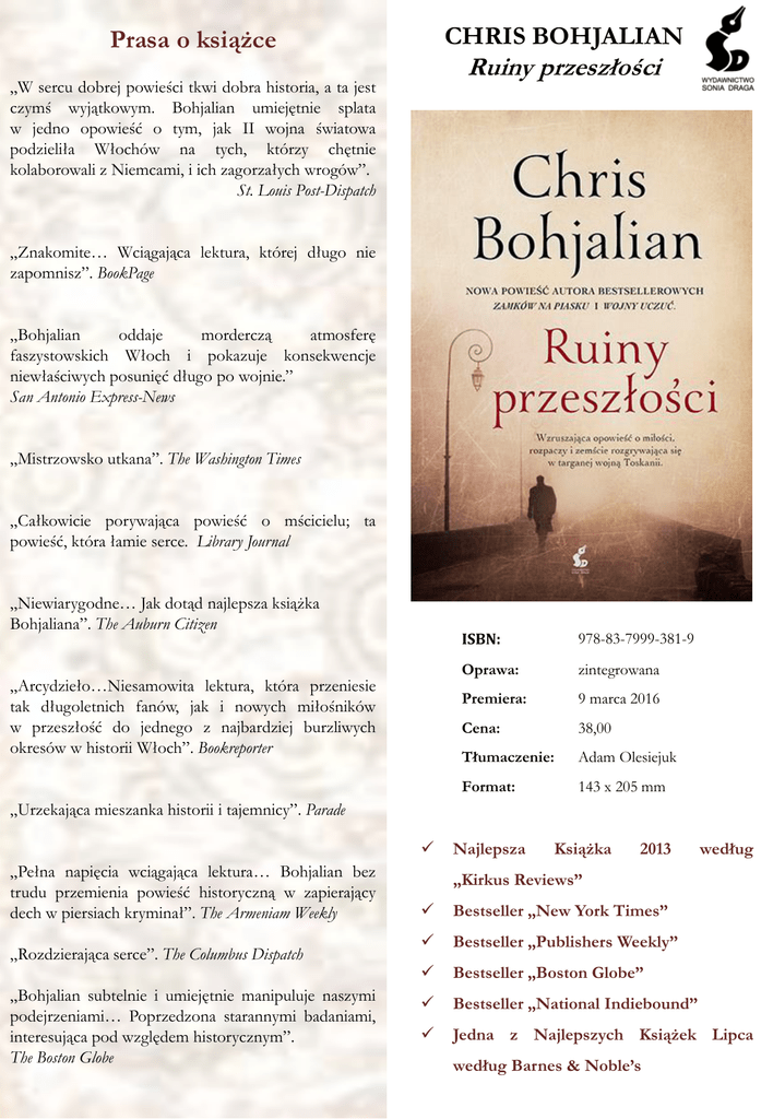 CHRIS BOHJALIAN Prasa o książce Ruiny przeszłości „W sercu dobrej powieści tkwi dobra historia, a ta jest czymś wyjątkowym. Bohjalian umiejętnie splata w jedno opowieść o tym, jak II wojna światowa podzieliła Włochów na tych, którzy chętnie kolaborowali z Niemcami, i ich zagorzałych wrogów”. St. Louis Post-Dispatch „Znakomite… Wciągająca lektura, której długo nie zapomnisz”. BookPage „Bohjalian oddaje morderczą atmosferę faszystowskich Włoch i pokazuje konsekwencje niewłaściwych posunięć długo po wojnie.” San Antonio Express-News „Mistrzowsko utkana”. The Washington Times „Całkowicie porywająca powieść o mścicielu; ta powieść, która łamie serce. Library Journal „Niewiarygodne… Jak dotąd najlepsza książka Bohjaliana”. The Auburn Citizen „Arcydzieło…Niesamowita lektura, która przeniesie tak długoletnich fanów, jak i nowych miłośników w przeszłość do jednego z najbardziej burzliwych okresów w historii Włoch”. Bookreporter ISBN: 978-83-7999-381-9 Oprawa: zintegrowana Premiera: 9 marca 2016 Cena: 38,00 Tłumaczenie: Adam Olesiejuk Format: 143 x 205 mm „Urzekająca mieszanka historii i tajemnicy”. Parade „Pełna napięcia wciągająca lektura… Bohjalian bez trudu przemienia powieść historyczną w zapierający dech w piersiach kryminał”. The Armeniam Weekly „Rozdzierająca serce”. The Columbus Dispatch „Bohjalian subtelnie i umiejętnie manipuluje naszymi podejrzeniami… Poprzedzona starannymi badaniami, interesująca pod względem historycznym”. The Boston Globe Najlepsza Książka 2013 według „Kirkus Reviews” Bestseller „New York Times” Bestseller „Publishers Weekly” Bestseller „Boston Globe” Bestseller „National Indiebound” Jedna z Najlepszych Książek Lipca według Barnes & Noble’s CHRIS BOHJALIAN Fragment wywiadu z autorem Niektórzy autorzy piszą jedną książkę na rok, a inni kilka przez całe życie. Czy kiedy zaczynałeś, wybrałeś świadomie jedną z tych ścieżek, i czy jesteś dziś zadowolony z tego wyboru? Nie. Po prostu miałem nadzieję napisać powieść, jak tylko (nareszcie) sprzedam opowiadanie. Zgromadziłem 250 świstków z odmową, zanim sprzedałem jedno słowo. To pierwsze opowiadanie było zatytułowane Sparks i pojawiło się w magazynie Cosmopolitan w 1988 roku. Kariera pisarska ma swoje wzloty i upadki – jednego dnia jesteś pięciogwiazdkowym autorem Amazona, następnego – na drodze do wylądowania na stole z tanią książką. Zawsze, każdego dnia, tak czy inaczej pozostajesz artystą. Jak – o ile w ogóle – odcinasz się od opinii na swój temat, by pozwolić swojej wyobraźni pracować kolejnego dnia? Nie mam odwagi czytać recenzji na Goodreads, Amazonie czy BN.com. Już nie. Napisałem raz esej dla Washington Post o moim starym przyzwyczajeniu do czytania, jak anonimowi ludzie patroszą moją pracę. Ale teraz, w trosce o moje zdrowie psychiczne, trzymam się od recenzji najdalej, jak mogę. One naprawdę potrafią popsuć piękny słoneczny dzień. Chris Bohjalian. Autor 18 książek, z których większość trafiła do zestawienia bestsellerów „The New York Times”. Jego powieści przetłumaczono na 30 języków, a trzy z nich zekranizowano. W Polsce nakładem wydawnictwa Sonia Draga ukazały się do tej pory powieści Sekrety Edenu, Wojna uczuć, Bez wyjścia i Zamki na piasku. Chris Bohjalan jest także autorem tekstów m.in. dla „The Washington Post”, „Cosmopolitan” czy „Reader’s Digest”. Wielokrotnie nagradzany nie tylko za osiągnięcia literackie, ale również za działalność edukacyjną związaną z dziedzictwem kulturowym Ormian. O książce 1943: Wśród idyllicznych wzgórz na południe od Florencji mieszka rodzina Rosatich, włoski ród szlachecki, którego członkowie wierzą, że mury wiekowej rezydencji ochronią ich przed wojną pustoszącą całą Europę. Życie osiemnastoletniej Cristiny upływa więc w spokoju i radości. Jednak wraz z przybyciem dwóch żołnierzy, Włocha i Niemca, sielankowy nastrój zostaje zburzony na zawsze. Cristiną zaczyna się interesować młody niemiecki porucznik, naziści coraz śmielej nadużywają gościnności gospodarzy, a niegdysiejsze sanktuarium Rosatich powoli staje się ich więzieniem. 1955: Serafina Bettini, piękna funkcjonariuszka wydziału dochodzeniowego florenckiej policji, zmaga się z własnymi demonami – wspomnieniami wojennymi. Ale gdy zostaje jej przydzielone makabryczne śledztwo w sprawie seryjnego zabójcy, który z zimną krwią morduje ostatnich pozostałych przy życiu członków rodziny Rosatich, musi jeszcze raz spojrzeć w przeszłość i zagłębić się w tragiczną historię ofiar, jak również stawić czoło swoim własnym traumatycznym przeżyciom. Inne powieści Chrisa Bohjaliana Jeśli jutro byłby pierwszy dzień twojej kariery, jakiej rady byś sobie udzielił? Pisz to, co kochasz; pisz to, co cię porusza, i sprawia, że jesteś dumny. Pisarze debatują nad tym, czy pisząc korzystać ze szczegółowego konspektu, czy po prostu zaufać intuicji. Co wolisz? Jaką rolę odgrywa natchnienie podczas planowania i pisania? Nigdy nie miałem zarysu fabuły. To zależy od bohaterów, którzy biorą mnie za rękę i prowadzą przez mroki historii. Zaczynam od mglistych przesłanek, o czym to będzie opowieść. Czy jest coś bez czego nie wyobrażasz sobie dnia pracy, procesu twórczego?? Red Bull bez cukru. http://www.novelmatters.com/2013/07/the-carpe-annum-interviews-chris.html Sonia Draga Sp. z o.o., Pl. Grunwaldzki 8-10, 40-127 Katowice, Tel.: 32 7826477, 7826037, Fax: 032 2537728 Dział handlowy: Danuta Czarnowska, 693420384 [email protected] Promocja: Agnieszka Jedlińska, 695672067, [email protected] Redakcja: [email protected]