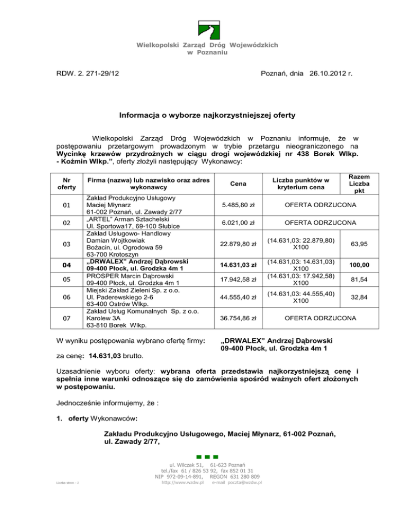 Wielkopolski Zarząd Dróg Wojewódzkich w Poznaniu RDW. 2. 271-29/12 Poznań, dnia 26.10.2012 r. Informacja o wyborze najkorzystniejszej oferty Wielkopolski Zarząd Dróg Wojewódzkich w Poznaniu informuje, Ŝe w postępowaniu przetargowym prowadzonym w trybie przetargu nieograniczonego na Wycinkę krzewów przydroŜnych w ciągu drogi wojewódzkiej nr 438 Borek Wlkp. - Koźmin Wlkp.”, oferty złoŜyli następujący Wykonawcy: Nr oferty 01 02 03 04 05 06 07 Firma (nazwa) lub nazwisko oraz adres wykonawcy Cena Zakład Produkcyjno Usługowy Maciej Młynarz 61-002 Poznań, ul. Zawady 2/77 „ARTEL” Arman Sztachelski Ul. Sportowa17, 69-100 Słubice Zakład Usługowo- Handlowy Damian Wojtkowiak BoŜacin, ul. Ogrodowa 59 63-700 Krotoszyn „DRWALEX” Andrzej Dąbrowski 09-400 Płock, ul. Grodzka 4m 1 PROSPER Marcin Dąbrowski 09-400 Płock, ul. Grodzka 4m 1 Miejski Zakład Zieleni Sp. z o.o. Ul. Paderewskiego 2-6 63-400 Ostrów Wlkp. Zakład Usług Komunalnych Sp. z o.o. Karolew 3A 63-810 Borek Wlkp. Razem Liczba pkt 5.485,80 zł OFERTA ODRZUCONA 6.021,00 zł OFERTA ODRZUCONA 22.879,80 zł 14.631,03 zł 17.942,58 zł 44.555,40 zł 36.754,86 zł W wyniku postępowania wybrano ofertę firmy: Liczba punktów w kryterium cena (14.631,03: 22.879,80) X100 (14.631,03: 14.631,03) X100 (14.631,03: 17.942,58) X100 (14.631,03: 44.555,40) X100 63,95 100,00 81,54 32,84 OFERTA ODRZUCONA „DRWALEX” Andrzej Dąbrowski 09-400 Płock, ul. Grodzka 4m 1 za cenę: 14.631,03 brutto. Uzasadnienie wyboru oferty: wybrana oferta przedstawia najkorzystniejszą cenę i spełnia inne warunki odnoszące się do zamówienia spośród waŜnych ofert złoŜonych w postępowaniu. Jednocześnie informujemy, Ŝe : 1. oferty Wykonawców: Zakładu Produkcyjno Usługowego, Maciej Młynarz, 61-002 Poznań, ul. Zawady 2/77, ▀ ▀ ▀ ul. Wilczak 51, 61-623 Poznań tel./fax 61 / 826 53 92, fax 852 01 31 NIP 972-09-14-891, REGON 631 280 809 Liczba stron - 2 http://www.wzdw.pl e-mail [email protected] - 2 - Zakładu Usług Komunalnych Sp. z o.o., Karolew 3A, 63-810 Borek Wlkp. zostają odrzucone na podstawie art.89 ust. 1 pkt 6. ustawy z dnia 29.01.04 r. Prawo zamówień publicznych: „Zamawiający odrzuca ofertę , jeŜeli: zawiera błędy w obliczeniu ceny” Wykonawcy obliczając cenę oferty zastosowali błędną stawkę podatku VAT. 2. Wykonawca: „ARTEL” Arman Sztachelski, Ul. Sportowa17, 69-100 Słubice, zostaje wykluczony z postępowania na podstawie art.24 ust. 2 pkt 4. ustawy z dnia 29.01.04 r. Prawo zamówień publicznych: Z postępowania o udzielenie zamówienia wyklucza się równieŜ wykonawców, którzy: „nie wykazali spełniania warunków udziału w postępowaniu” Wykonawca miał wykazać, Ŝe dysponuje osobami, którym powierzone zostanie wykonanie zamówienia na stanowiskach wymienionych poniŜej lub przedstawić pisemne zobowiązanie innych podmiotów do udostępnienia osób zdolnych do wykonania zamówienia. Osoby wskazane przez Wykonawcę miały posiadać kwalifikacje i doświadczenie zawodowe nie mniejsze niŜ określone poniŜej: Operator piły do cięcia drewna – 1 os. z uprawnieniami do obsługi piły Do oferty nie dołączono dokumentów potwierdzających spełnienie w/w warunku: informacji o osobach, odpowiedzialnych za wykonanie zamówienia („Potencjał kadrowy”), na formularzu zgodnym z treścią Formularza 3.3. zawierającej dane na temat kwalifikacji wskazanych osób potwierdzające spełnianie warunku, o którym mowa w pkt.6.3.2.2 SIWZ . oświadczenia, Ŝe osoby te posiadają wymagane uprawnienia oraz pisemną informację o podstawie dysponowania tymi osobami. Do oferty nie dołączono równieŜ: oświadczenia o spełnianiu warunków udziału w postępowaniu . . Wykonawca nie uzupełnił dokumentów równieŜ w terminie podanym w wezwaniu. Na podstawie art.24 ust.4 ustawy z dnia 29.01.2004 r.-Prawo zamówień publicznych; ofertę Wykonawcy wykluczonego uznaje się za odrzuconą i odrzuca się ją. ▀ ▀ ▀ ul. Wilczak 51, 61-623 Poznań tel./fax 61 / 826 53 92, fax 852 01 31 NIP 972-09-14-891, REGON 631 280 809 Liczba stron - 2 http://www.wzdw.pl e-mail [email protected]