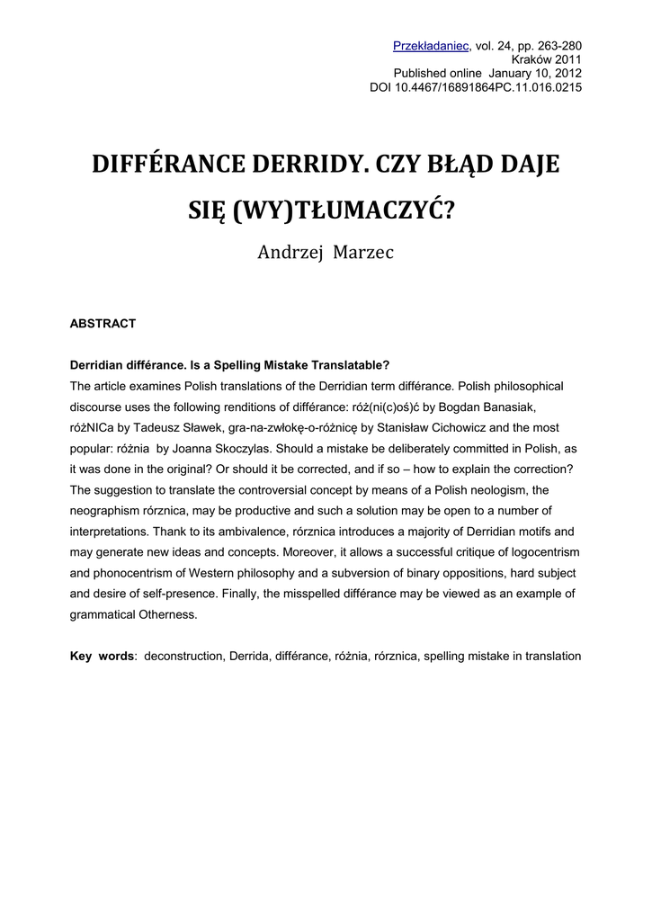 Przekładaniec, vol. 24, pp. 263-280 Kraków 2011 Published online January 10, 2012 DOI 10.4467/16891864PC.11.016.0215 DIFFÉRANCE DERRIDY. CZY BŁĄD DAJE SIĘ (WY)TŁUMACZYĆ? Andrzej Marzec ABSTRACT Derridian différance. Is a Spelling Mistake Translatable? The article examines Polish translations of the Derridian term différance. Polish philosophical discourse uses the following renditions of différance: róż(ni(c)oś)ć by Bogdan Banasiak, różNICa by Tadeusz Sławek, gra-na-zwłokę-o-różnicę by Stanisław Cichowicz and the most popular: różnia by Joanna Skoczylas. Should a mistake be deliberately committed in Polish, as it was done in the original? Or should it be corrected, and if so – how to explain the correction? The suggestion to translate the controversial concept by means of a Polish neologism, the neographism rórznica, may be productive and such a solution may be open to a number of interpretations. Thank to its ambivalence, rórznica introduces a majority of Derridian motifs and may generate new ideas and concepts. Moreover, it allows a successful critique of logocentrism and phonocentrism of Western philosophy and a subversion of binary oppositions, hard subject and desire of self-presence. Finally, the misspelled différance may be viewed as an example of grammatical Otherness. Key words: deconstruction, Derrida, différance, różnia, rórznica, spelling mistake in translation ANDRZEJ MARZEC DIFFÉRANCE DERRIDY. CZY BŁĄD DAJE SIĘ (WY)TŁUMACZYĆ? Wydaje się, że dyskusja dotycząca polskiego przekładu Derridiańskiej différance, tocząca się burzliwie w latach dziewięćdziesiątych XX wieku przy okazji sukcesywnego pojawiania się w Polsce tłumaczeń dzieł Derridy, straciła już właściwy sobie impet oraz zdążyła ostygnąć. Jednak prawdopodobnie dopiero teraz, gdy już nie trzeba się obawiać odrzucenia i zmarginalizowania samego zjawiska dekonstrukcji, można zastanowić się nad tym, czy poszczególne tłumaczenia, próbując odsłonić, przybliżyć francuskie pojęcie, nie zasłoniły jego właściwego znaczenia, a co najważniejsze, subwersywnego i dynamicznego potencjału. Rozpoczynając od analizy powstałych dotychczas propozycji translatorskich (Bogdana Banasiaka, Tadeusza Sławka, Stanisława Cichowicza oraz Joanny Skoczylas), staram się podjąć namysł nad próbą oddania différance w języku polskim z właściwym jej błędem ortograficznym: „rórznica/rużnica”. W tym celu spoglądam na Derridiańską différance/différence przez pryzmat iterowalności, czyli podobieństwa z wkradającym się w nie przemieszczeniem – Innością. Pragnę ukazać, jakie konsekwencje oraz perspektywy interpretacyjne mogłoby nieść ze sobą tłumaczenie wysuwające na pierwszy plan iterację. Następnie zastanawiam się, czy należy na gruncie rodzimej myśli poprawiać błąd celowo popełniony przez filozofa, a także czy jego korekta w tym przypadku jest w ogóle uzasadniona. Jednocześnie dociekam, czy ten nietypowy, inny przekład współgra z takimi pojęciami Derridy jak „suplement”, „farmakon”, „odwleczenie”, „rozsunięcie”, „ślad”, „rozplenianie”. Jestem przekonany, że na przykładzie błędnego zapisu différance można doskonale ukazać sposób, w jaki gramatyczna Inność ma szansę wkroczyć w porządek językowy. ■ 264 ANDRZEJ MARZEC Pierwotna wielość i płodna pomysłowość propozycji translatorskich, eksponujących zazwyczaj jedną lub kilka charakterystycznych cech tego kontrowersyjnego pojęcia, została współcześnie wydatnie ograniczona i ujednolicona. Wybór dokonał się poprzez filozoficzny usus, obecnie faworyzujący propozycję Joanny Skoczylas („różnia”) bądź przychylający się do pozornie neutralnej, a przez to dość atrakcyjnej, oryginalnej pisowni francuskiej. Jest bardzo prawdopodobne, że ten kluczowy dla dekonstrukcji termin podzieli losy Heideggerowskiego Dasein, które po wielu próbach wpisania go w język polski zostało przyjęte w praktyce naukowej jako nieprzetłumaczalne, lecz podlegające wyjaśnianiu i omawianiu1. Bogdan Banasiak, dokonując przekładu O gramatologii, proponował w napisanym przez siebie wstępie, by différance tłumaczyć jako „różnicość”, która funkcjonując w dwojakim zapisie „róż(nic)ość” bądź „różni(coś)ć”, zawierałaby w sobie zarówno „nic” jak i „coś”. Propozycja ta zdaje się bardzo dobrze oddawać nierozstrzygalny ruch nicościowania, a jednocześnie stawania się czymś, przy czym współistniejąc ze sobą, żadna z tych antagonistycznych tendencji nie byłaby w stanie przejąć kontroli nad drugą. Ten dwoisty termin za każdym odczytaniem jawi się jako odnoszący się do zupełnie innego zakresu znaczeniowego (nic/coś), przez co pozwala wejść w przestrzeń ambiwalencji, migotliwej ruchliwości. Skomplikowana „róż(ni(c)oś)ć”, będąc i nie będąc zarazem, jest więc niewątpliwie ciekawym oraz oddającym derridiańskiego ducha projektem translatorskim, próbującym uniknąć sprowadzenia go jedynie do obecności lub nieobecności. Niestety nie wydaje się jednak konstrukcją na tyle otwartą i (przede wszystkim) nośną, aby bez trudu wyeksponować wszystkie charakterystyczne dla dekonstrukcji wątki filozoficzne, jakie według Derridy powinny zostać niejako wywołane przez samo to pojęcie. Innym, dość intrygującym pomysłem, stała się „różNICa”2 Tadeusza Sławka, który jako pierwszy z tłumaczy zwrócił uwagę na zupełnie inne cechy tego pojęcia. Zdawał sobie doskonale sprawę z tego, że différance nie jest zupełnie nowym słowem o nieznanym do tej pory znaczeniu, lecz rodzajem neografizmu. Różnica tkwi w samej graficznej tkance słowa, 1 Warto wymienić w tym kontekście chociażby „jestestwo” – propozycję Bogdana Barana oraz „byt przytomny”, jakim posługiwał się Krzysztof Michalski. 2 Koncepcja Sławka została między innymi zinterior