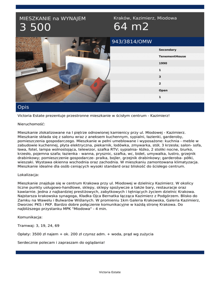 Kraków, Kazimierz, Miodowa MIESZKANIE na WYNAJEM 64 m2 3 500 943/3814/OMW Secondary TenementHouse 1990 1 3 2 Open 1 Opis Victoria Estate prezentuje przestronne mieszkanie w ścisłym centrum - Kazimierz! Nieruchomość: Mieszkanie zlokalizowane na I piętrze odnowionej kamienicy przy ul. Miodowej - Kazimierz. Mieszkanie składa się z salonu wraz z aneksem kuchennym, sypialni, łazienki, garderoby, pomieszczenia gospodarczego. Mieszkanie w pełni umeblowane i wyposażone: kuchnia - meble w zabudowie kuchennej, płyta elektryczna, piekarnik, lodówka, zmywarka, stół, 3 krzesła; salon- sofa, ława, fotel, lampa wolnostojąca, telewizor, szafka RTV; sypialnia- łóżko, 2 stoliki nocne, biurko, krzesło, pojemna szafa; łazienka - wanna, prysznic, szafka, wc, bidet, umywalka, lustro, grzejnik drabinkowy; pomieszczenie gospodarcze- pralka, bojler, grzejnik drabinkowy; garderoba- półki, wieszaki. Wystawa okienna wschodnia oraz zachodnia. W mieszkaniu zamontowana klimatyzacja. Mieszkanie idealne dla osób ceniących wysoki standard oraz bliskość do ścisłego centrum. Lokalizacja: Mieszkanie znajduje się w centrum Krakowa przy ul. Miodowej w dzielnicy Kazimierz. W okolicy liczne punkty usługowo-handlowe, sklepy, sklepy spożywcze a także bary, restauracje oraz kawiarnie. Jedna z najbardziej prestiżowych, zabytkowych i tętniących życiem dzielnic Krakowa. Najstarsza krakowska synagoga, Kładka Ojca Bernatka łącząca Kazimierz z Podgórzem. Blisko do Zamku na Wawelu i Bulwarów Wiślanych. W promieniu 1km Galeria Krakowska, Galeria Kazimierz, Dworzec PKS i PKP. Bardzo dobre połączenie komunikacyjne w każdą stronę Krakowa. Do najbliższego przystanku MPK "Miodowa" - 4 min. Komunikacja: Tramwaj: 3, 19, 24, 69 Opłaty: 3500 zł najem + ok. 200 zł czynsz adm. + woda, prąd wg zużycia Serdecznie polecam i zapraszam do oglądania! Victoria Estate Emilia Sumińska tel. +48 512 704 621 email: [email protected] Victoria Estate Powered by TCPDF (www.tcpdf.org)