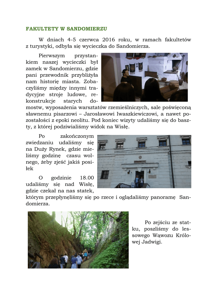 FAKULTETY W SANDOMIERZU W dniach 4-5 czerwca 2016 roku, w ramach fakultetów z turystyki, odbyła się wycieczka do Sandomierza. Pierwszym przystankiem naszej wycieczki był zamek w Sandomierzu, gdzie pani przewodnik przybliżyła nam historię miasta. Zobaczyliśmy między innymi tradycyjne stroje ludowe, rekonstrukcje starych domostw, wyposażenia warsztatów rzemieślniczych, sale poświęconą sławnemu pisarzowi – Jarosławowi Iwaszkiewiczowi, a nawet pozostałości z epoki neolitu. Pod koniec wizyty udaliśmy się do baszty, z której podziwialiśmy widok na Wisłę. Po zakończonym zwiedzaniu udaliśmy się na Duży Rynek, gdzie mieliśmy godzinę czasu wolnego, żeby zjeść jakiś posiłek O godzinie 18.00 udaliśmy się nad Wisłę, gdzie czekał na nas statek, którym przepłynęliśmy się po rzece i oglądaliśmy panoramę Sandomierza. Po zejściu ze statku, poszliśmy do lessowego Wąwozu Królowej Jadwigi. Następnie poszliśmy już do naszego domu wycieczkowego po drugiej stronie Wisły. Gdy przechodziliśmy przez most podziwialiśmy zachód słońca. Rano spotkaliśmy się z panią przewodnik. Najpierw zatrzymaliśmy się na tarasie widokowym, gdzie dowiedzieliśmy się dużo o historii Sandomierza oraz usłyszeliśmy wiele ciekawostek na temat jego mieszkańców. Po przejściu przez miasto znaleźliśmy się na rynku. Tam pani przybliżyła nieco historię ratusza. Bardzo miło spędziliśmy czas w zbrojowni. Pan, który interesuje się rycerstwem, w bardzo przystępny sposób podzielił się z nami informacjami na temat kodeksu rycerskiego i legendami dotyczącymi Sandomierza. Kolejnym przystankiem podróży była Brama Opatowska. Wspięliśmy się na nią. Stamtąd mogliśmy oglądać piękną panoramę Sandomierza. Równie ciekawym miejscem, jakie zobaczyliśmy, były sandomierskie podziemia. W dawnych czasach handlarze przetrzymywali tam różnorodne towary, jednak dziś jest to wyłącznie atrakcja turystyczna. Następnie, autokarem pojechaliśmy do Gór Pieprzowych. Wspięliśmy się na szczyt, gdzie usiedliśmy na trawie i w słońcu podziwialiśmy Wisłę i Sandomierz Około godziny 15.00 wyjechaliśmy w drogę powrotną do Warszawy. Wycieczkę uważam z bardzo udaną. Rafał Królik 3e