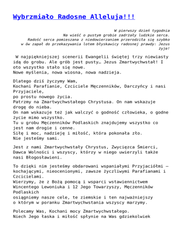 Wybrzmiało Radosne Alleluja!!! W pierwszy dzień tygodnia Na wieść o pustym grobie zadrżały ludzkie serca. Radość serca pomieszana z niedowierzaniem przerodziła się szybko w ów zapał do przekazywania lotem błyskawicy radosnej prawdy: Jezus żyje! W najpiękniejszej scenerii Ewangelii świętej trzy niewiasty idą do grobu. Ale grób jest pusty… Jezus Zmartwychwstał! I oto wszystko stało się nowe. Nowe myślenia, nowa wiosna, nowa nadzieja. Dlatego dziś życzymy Wam, Kochani Parafianie, Czciciele Męczenników, Darczyńcy i nasi Przyjaciele, po prostu nowego życia. Patrzmy na Zmartwychwstałego Chrystusa. On nam wskazuje drogę do nieba. On nam wskazuje też jak walczyć o godność człowieka, o godne życie mimo wszystko. Tu u grobu Męczenników Podlaskich znajdujemy wszystko co jest nam drogie i cenne. Siłę i moc, nadzieję i miłość, która pokonała zło. Nie jesteśmy sami. Jest z nami Zmartwychwstały Chrystus, Zwycięzca Śmierci, Dawca Wolności i wszyscy, którzy w niego uwierzyli także nasi Błogosławieni. To dzięki nim jesteśmy obdarowani wspaniałymi Przyjaciółmi – kochającymi, nieocenionymi, zawsze życzliwymi Parafianami i Czcicielami. Wierzymy, że z Bożą pomocą i wsparci wstawiennictwem Wincentego Lewoniuka i 12 Jego Towarzyszy, Męczenników Podlaskich osiągniemy nasze cele, te ziemskie i ten najważniejszy o którym w poranku Zmartwychwstania wszyscy marzymy. Polecamy Was, Kochani mocy Zmartwychwstałego. Niech Jego łaska i miłość spłynie na Was gdziekolwiek jesteście przez orędownictwo Błogosławionych. Ks. Jacek i Ks. Piotr