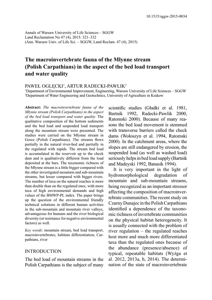 10.1515/sggw-2015-0034 Annals of Warsaw University of Life Sciences – SGGW Land Reclamation No 47 (4), 2015: 321–332 (Ann. Warsaw Univ. of Life Sci. – SGGW, Land Reclam. 47 (4), 2015) The macroinvertebrate fauna of the Młynne stream (Polish Carpathians) in the aspect of the bed load transport and water quality PAWEŁ OGLĘCKI1, ARTUR RADECKI-PAWLIK2 Department of Environmental Improvement, Engineering, Warsaw University of Life Sciences – SGGW Department of Water Engineering and Geotechnics, University of Agriculture in Krakow 1 2 Abstract: The macroinvertebrate fauna of the Młynne stream (Polish Carpathians) in the aspect of the bed load transport and water quality. The qualitative composition of the bottom sediments and the bed load and suspended load transport along the mountain stream were presented. The studies were carried on the Młynne stream in Gorce (Polish Carpathians). The streams flows partially in the natural river-bed and partially in the regulated with rapids. The stream bed load is accumulated in the reservoir up to the check dam and is qualitatively different from the load deposited at the bars. The taxonomic richness of the Młynne stream is a little bigger compared with the other investigated mountain and sub-mountain streams, but lesser compared with bigger rivers. The number of taxa on the natural reaches is more than double than on the regulated ones, with more taxa of high environmental demands and high values of the BMWP-PL index. The paper brings up the question of the environmental friendly technical solutions in different human activities in the sub-mountain and mountain river valleys, advantageous for humans and the river biological diversity (or resistance for negative environmental factors) as well. Key words: mountain stream, bed load transport, macroinvertebrates, habitats differentiation, Carpathians, river INTRODUCTION The bed load of mountain streams in the Polish Carpathians is the subject of many scientific studies (Gładki et al. 1981, Bartnik 1992, Radecki-Pawlik 2000, Ratomski 2000). Because of many reasons the bed load movement is stemmed with transverse barriers called the check dams (Wołoszyn et al. 1994, Ratomski 2000). In the catchment areas, where the slopes are still endangered by erosion, the suspended load (as well as washed load) seriously helps in bed load supply (Bartnik and Madeyski 1992, Banasik 1994). It is very important in the light of hydromorphological degradation of mountain and sub-mountain streams, being recognized as an important stressor affecting the composition of macroinvertebrate communities. The recent study on Czarny Dunajec in the Polish Carpathians identified a dependence of the taxonomic richness of invertebrate communities on the physical habitat heterogeneity. It is usually connected with the problem of river regulation – the regulated reaches host more and much more differentiated taxa than the regulated ones because of the abundance (presence/absence) of typical, repeatable habitats (Wyżga et al. 2012, 2013a, b, 2014). The determination of the state of macroinvertebrate 322 P. Oglęcki, A. Radecki-Pawlik fauna in the stream, eventuating from the bed load transport and water quality, was the aim of the study. STUDY AREA The Młynne catchment is the part of Western Carpathian Province, Outer Western Carpathians Subprovince, Outer Western Beskids Macroregion and Gorce Mezoregion. The Młynne stream is left tributary of the Ochotnica stream (right Dunajec river tributary). On the lower reach (from the check dam to the mouth) the terrain elevation gradient is equal to 90 m and the average slope is equal to 3.6%. The upper reach average slope is equal to 10.2% and the stream valley development (V) – figured out according to Horton (1945) – is equal to 0.364. The orographic index (λ) according to Kajetanowicz, equal to 777.48, classifies the Młynne stream as high-mountain watercourse and Łochtin stability parameter (f), equal to 0.913, defines the Młynne stream riverbed as vulnerable to erosion (Wołoszyn et al. 1994). The whole Młynne catchment area lays in the Gorce mountains, built in major part from Magura Set sedimentary rocks. The rocks of this set cover the largest area in Outer Western Flysch Carpathians and build the Żywiecki Beskid Mountains, a larger part of Medium Beskids, Insular Beskids, Sadecki Beskids and the part of Low Beskids. The Magura Set sedimentary rocks are classed as so-called flysch, consisted of alternating layers of sandstones, mud shales, pudding stones, mudstones and siltstones. The flysch is often accompanied by the carbonate rocks, such as limestones, marls and dolomites, also found in the Gorce mountains. The Magura Set was creating itself for relatively long time – about 63 million years. Its oldest link – motley shales – formed a deposits in turon (upper Cretaceous) and the youngest one – the Magura layers – in Oligocene (lower Tertiary). All the hilltops in Gorce and other mentioned ridges are built with Magura sandstones, which formed the deposits in the sea in upper Eocene (lower Tertiary). The Magura sandstones thickness reaches about 200 m. It is consisted of thick shoals with thick or middle-sized grains, in Gorce most often greyish with muscovite (Matuszczyk 1999). In the Młynne stream valley the ensembles of thickand thin-shoaled sandstones, shifted by greyish shales, are being exposed. In the Młynne stream riverbed, especially in its upper reach, abundant rock verges occur. The mica sandstones and shales of Magura layer dominate in that part. In the middle catchment area there are basically Tertiary (paleogene) shales and sub-Magura layer sandstones with the lens of Quaternary slide colluviums. In the mouth reach the Cretaceous sandstones and the shales of Ropa layer (Kulka et al. 1991). In the Młynne stream valley, in lower part of the catchment area, sparse alluvial settlements are also present. On the upper reach of the Młynne stream
