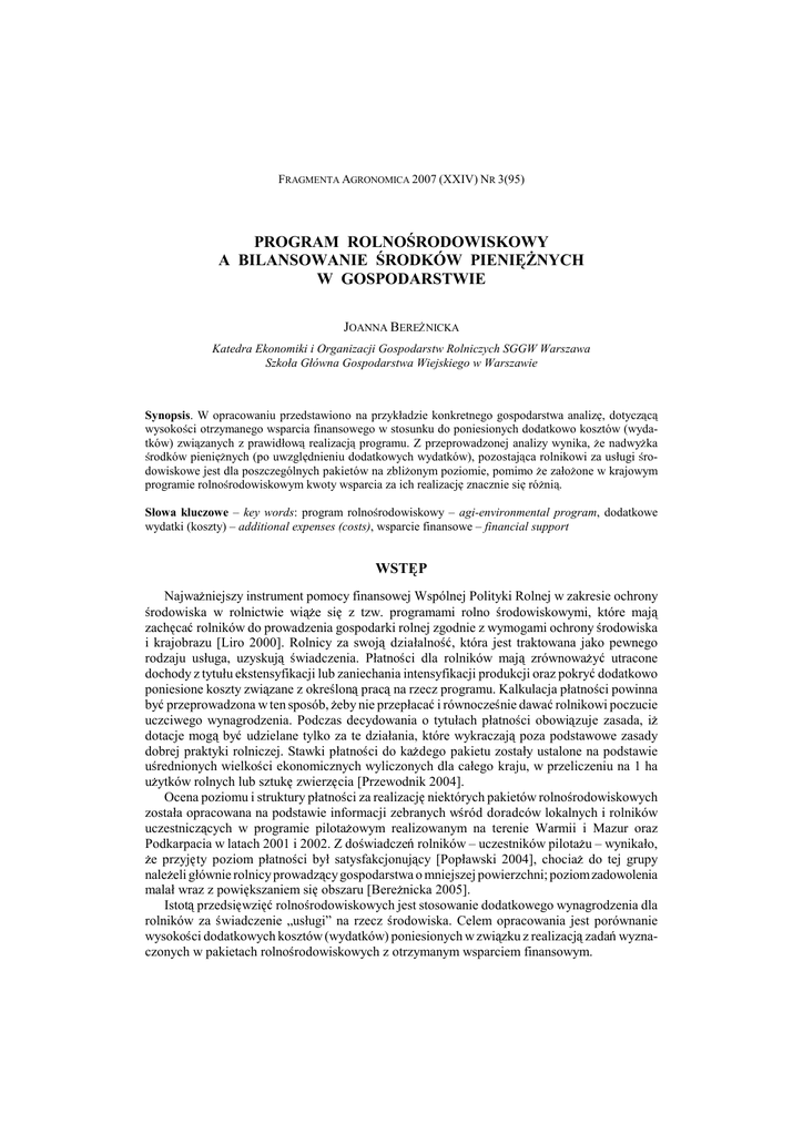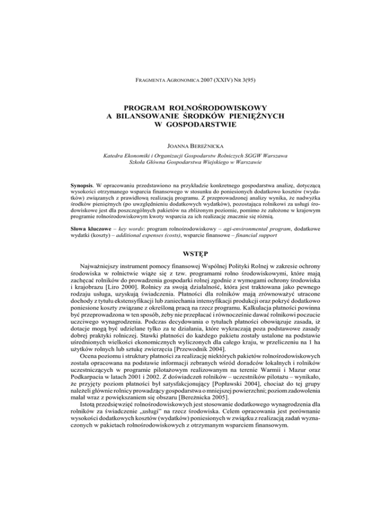 FRAGMENTA AGRONOMICA 2007 (XXIV) NR 3(95) PROGRAM ROLNOŚRODOWISKOWY A BILANSOWANIE ŚRODKÓW PIENIĘŻNYCH W GOSPODARSTWIE JOANNA BEREŻNICKA Katedra Ekonomiki i Organizacji Gospodarstw Rolniczych SGGW Warszawa Szkoła Główna Gospodarstwa Wiejskiego w Warszawie Synopsis. W opracowaniu przedstawiono na przykładzie konkretnego gospodarstwa analizę, dotyczącą wysokości otrzymanego wsparcia finansowego w stosunku do poniesionych dodatkowo kosztów (wydatków) związanych z prawidłową realizacją programu. Z przeprowadzonej analizy wynika, że nadwyżka środków pieniężnych (po uwzględnieniu dodatkowych wydatków), pozostająca rolnikowi za usługi środowiskowe jest dla poszczególnych pakietów na zbliżonym poziomie, pomimo że założone w krajowym programie rolnośrodowiskowym kwoty wsparcia za ich realizację znacznie się różnią. Słowa kluczowe – key words: program rolnośrodowiskowy – agi-environmental program, dodatkowe wydatki (koszty) – additional expenses (costs), wsparcie finansowe – financial support WSTĘP Najważniejszy instrument pomocy finansowej Wspólnej Polityki Rolnej w zakresie ochrony środowiska w rolnictwie wiąże się z tzw. programami rolno środowiskowymi, które mają zachęcać rolników do prowadzenia gospodarki rolnej zgodnie z wymogami ochrony środowiska i krajobrazu [Liro 2000]. Rolnicy za swoją działalność, która jest traktowana jako pewnego rodzaju usługa, uzyskują świadczenia. Płatności dla rolników mają zrównoważyć utracone dochody z tytułu ekstensyfikacji lub zaniechania intensyfikacji produkcji oraz pokryć dodatkowo poniesione koszty związane z określoną pracą na rzecz programu. Kalkulacja płatności powinna być przeprowadzona w ten sposób, żeby nie przepłacać i równocześnie dawać rolnikowi poczucie uczciwego wynagrodzenia. Podczas decydowania o tytułach płatności obowiązuje zasada, iż dotacje mogą być udzielane tylko za te działania, które wykraczają poza podstawowe zasady dobrej praktyki rolniczej. Stawki płatności do każdego pakietu zostały ustalone na podstawie uśrednionych wielkości ekonomicznych wyliczonych dla całego kraju, w przeliczeniu na 1 ha użytków rolnych lub sztukę zwierzęcia [Przewodnik 2004]. Ocena poziomu i struktury płatności za realizację niektórych pakietów rolnośrodowiskowych została opracowana na podstawie informacji zebranych wśród doradców lokalnych i rolników uczestniczących w programie pilotażowym realizowanym na terenie Warmii i Mazur oraz Podkarpacia w latach 2001 i 2002. Z doświadczeń rolników – uczestników pilotażu – wynikało, że przyjęty poziom płatności był satysfakcjonujący [Popławski 2004], chociaż do tej grupy należeli głównie rolnicy prowadzący gospodarstwa o mniejszej powierzchni; poziom zadowolenia malał wraz z powiększaniem się obszaru [Bereżnicka 2005]. Istotą przedsięwzięć rolnośrodowiskowych jest stosowanie dodatkowego wynagrodzenia dla rolników za świadczenie „usługi” na rzecz środowiska. Celem opracowania jest porównanie wysokości dodatkowych kosztów (wydatków) poniesionych w związku z realizacją zadań wyznaczonych w pakietach rolnośrodowiskowych z otrzymanym wsparciem finansowym. 12 J. Bereżnicka MATERIAŁ I METODY Do realizacji postawionego powyżej celu były wykorzystane przepływy pieniężne; są one bowiem dobrą metodą do oceny sytuacji finansowej gospodarstwa. Wynika to z faktu, że rolnicy mimo to, że posługują się kategorią dochodu, często mają na uwadze ilość środków pieniężnych, które pozostają po zrealizowaniu określonych działań w gospodarstwie. Bilans środków pieniężnych uznano za bardzo dobry miernik w ocenie wysokości poziomu wsparcia gospodarstwa. W opracowaniu będzie pominięta kategoria utraconych dochodów, ponieważ często nie mają one przełożenia na wysokość otrzymanych przez gospodarstwo środków pieniężnych (nieprzydatne z punktu widzenia przyjętej metody). Koszty natomiast znacznie łatwiej utożsamiać z zmniejszaniem się gotówki. Przyjęto założenie, że wszystkie dodatkowe koszty będą miały charakter wydatków. Przedmiotem badania jest konkretne gospodarstwo rolne położone w województwie mazowieckim, dla którego doradca rolnośrodowiskowy przygotował plan działalności rolnośrodowiskowej (PDR). Plan ten jest źródłem danych, które w opracowaniu będą stanowiły podstawę obliczeń. Rolnik zdecydował się na zrealizowanie dwóch pakietów, tj. rolnictwo zrównoważone (S01) oraz ochronę gleb i wód – wariant międzyplon ścierniskowy (K01c). Są to zatem dwa przeciwstawne, jeśli chodzi o popularność wśród rolników, pakiety [Bereżnicka 2006]. Analizą objęto cały, pięcioletni okres realizacji programu rolnośrodowiskowego. Przyjęto założenie, że w danym roku rolnik będzie ponosił wydatki i otrzymywał płatność (wsparcie). W ten sposób możliwe jest zbilansowanie środków pieniężnych. Aby zapewnić porównywalność otrzymanych danych punktem wyjścia do obliczenia wysokości wydatków była powierzchnia przeznaczona na wdrożenie konkretnego pakietu wynikająca z PDR. WYNIKI I DYSKUSJA Analizowane gospodarstwo funkcjonuje na terenie jednej z trzech stref priorytetowych i dysponuje powierzchnią większą niż średnia dla województwa mazowieckiego oraz wyższą niż średnia w kraju. W tabeli 1 przedstawiono dane dotyczące powierzchni i struktury użytkowanych gruntów. Jak wynika z liczb przedstawionych w tabeli 1, ponad 8% powierzchni gospodarstwa stanowią użytki, które nie są brane pod uwagę przy naliczaniu wsparcia w ramach programu rolsnośrodowiskowego. Dominują natomiast grunty orne, które stanowią ponad 70% powierzchni gospodarstwa. Działania prośrodowiskowe prowadzone będą na powierzchni 12,50 ha użytków rolnych. Z planu działalności rolnośrodowiskowej wynika, że gospodarstwo było prowadzone w sposób konwencjonalny, z produkcją rośl