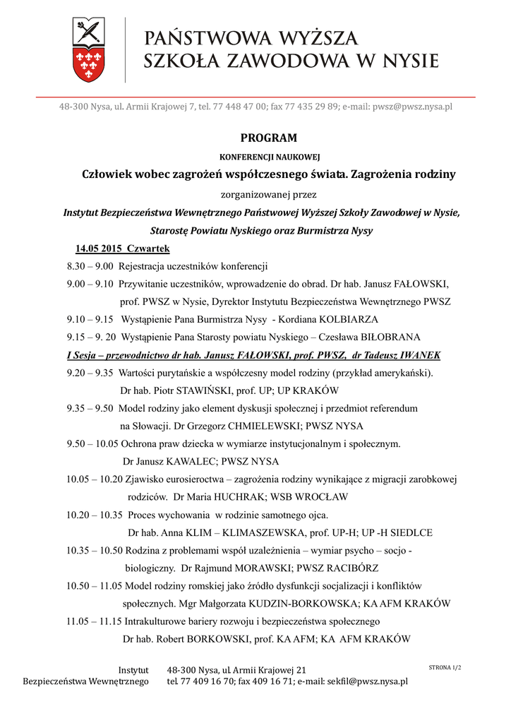 PROGRAM KONFERENCJI NAUKOWEJ Człowiek wobec zagrożeń współczesnego świata. Zagrożenia rodziny zorganizowanej przez Instytut Bezpieczeństwa Wewnętrznego Państwowej Wyższej Szkoły Zawodowej w Nysie, Starostę Powiatu Nyskiego oraz Burmistrza Nysy 14.05 2015 Czwartek 8.30 – 9.00 Rejestracja uczestników konferencji 9.00 – 9.10 Przywitanie uczestników, wprowadzenie do obrad. Dr hab. Janusz FAŁOWSKI, prof. PWSZ w Nysie, Dyrektor Instytutu Bezpieczeństwa Wewnętrznego PWSZ 9.10 – 9.15 Wystąpienie Pana Burmistrza Nysy - Kordiana KOLBIARZA 9.15 – 9. 20 Wystąpienie Pana Starosty powiatu Nyskiego – Czesława BIŁOBRANA I Sesja – przewodnictwo dr hab. Janusz FAŁOWSKI, prof. PWSZ, dr Tadeusz IWA#EK 9.20 – 9.35 Wartości purytańskie a współczesny model rodziny (przykład amerykański). Dr hab. Piotr STAWIŃSKI, prof. UP; UP KRAKÓW 9.35 – 9.50 Model rodziny jako element dyskusji społecznej i przedmiot referendum na Słowacji. Dr Grzegorz CHMIELEWSKI; PWSZ NYSA 9.50 – 10.05 Ochrona praw dziecka w wymiarze instytucjonalnym i społecznym. Dr Janusz KAWALEC; PWSZ NYSA 10.05 – 10.20 Zjawisko eurosieroctwa – zagrożenia rodziny wynikające z migracji zarobkowej rodziców. Dr Maria HUCHRAK; WSB WROCŁAW 10.20 – 10.35 Proces wychowania w rodzinie samotnego ojca. Dr hab. Anna KLIM – KLIMASZEWSKA, prof. UP-H; UP -H SIEDLCE 10.35 – 10.50 Rodzina z problemami współ uzależnienia – wymiar psycho – socjo biologiczny. Dr Rajmund MORAWSKI; PWSZ RACIBÓRZ 10.50 – 11.05 Model rodziny romskiej jako źródło dysfunkcji socjalizacji i konfliktów społecznych. Mgr Małgorzata KUDZIN-BORKOWSKA; KA AFM KRAKÓW 11.05 – 11.15 Intrakulturowe bariery rozwoju i bezpieczeństwa społecznego Dr hab. Robert BORKOWSKI, prof. KA AFM; KA AFM KRAKÓW Instytut Bezpieczeństwa Wewnętrznego 48-300 Nysa, ul. Armii Krajowej 21 tel. 77 409 16 70; fax 409 16 71; e-mail: [email protected] STRONA 1/2 11.15 – 11.25 Nadużywanie alkoholu przez jednego z rodziców zagrożeniem procesu wychowawczego dzieci.Dr hab. Ryszard KAŁUŻNY, prof. DSW; DSW WROCŁAW 11.25 – 11.45 Dyskusja 11.45 – 12.15 Przerwa kawowa II Sesja – przewodnictwo dr hab. Ryszard KAŁUŻ#Y, prof. DSW, dr Maria HUCHRAK 12.15 – 12.20 Przywitanie uczestników konferencji i wystąpienie Jej Magnificencji Pani Rektor PWSZ w Nysie dr hab. Zofii WILIMOWSKIEJ, prof. PWSZ w Nysie 12.20 – 12.35 Przemiany aksjologiczne jako źródło zagrożeń współczesnej rodziny. Dr Gabriela PAPROTNA; Górnośląska WSP MYSŁOWICE 12.35 – 12.50 Zagrożenia integralnego rozwoju osoby we współczesnej ,,rodzinie” – perspektywa aksjologiczna. Mgr Ewelina WINIARCZYK; KUL LUBLIN 12.50 – 13.05 Obraz rodziny we współczesnych mediach – perspektywa aksjologiczna. Mgr Anna BADORA; KUL LUBLIN 13.05 – 13.20 Brak szczegółów tematu. Prof. zw. dr hab. Zygmunt KOWALCZUK; UP KRAKÓW 13.20 – 13.35 Wykluczenie społeczne dzieci i młodzieży – przyczyny, skutki i charakterystyka problemu. Katarzyna WIŚNIEWSKA; WSH RADOM 13.35 – 13.50 Stalking jako nowa forma przemocy. Lic. Milena HADZIK; PWSZ NYSA 13.50 – 14.05 Przemiany systemowe rolnictwa jako zagrożenie rodzinnych gospodarstw rolnych. Katarzyna DERLUKIEWICZ; SGH WARSZAWA 14.05 – 14.20 Prekaryzacja klasy średniej w Polsce – Antagonizm między kapitalizmem, a Katolicką Nauką Kościoła. Mgr Paweł PIOTROWSKI; KA AFM KRAKÓW 14.20 – 14.45 Dyskusja 14.45 Podsumowanie obrad, pożegnanie uczestników. Dr hab. Janusz FAŁOWSKI prof. PWSZ w ,ysie, Dyrektor Instytutu Bezpieczeństwa Wewnętrznego PWSZ w ,ysie Obrady odbędą się w Sali Senatu PWSZ w budynku Rektoratu w ,ysie ul. Armii Krajowej 7. Instytut Bezpieczeństwa Wewnętrznego 48-300 Nysa, ul. Armii Krajowej 21 tel. 77 409 16 70; fax 409 16 71; e-mail: [email protected] STRONA 2/2