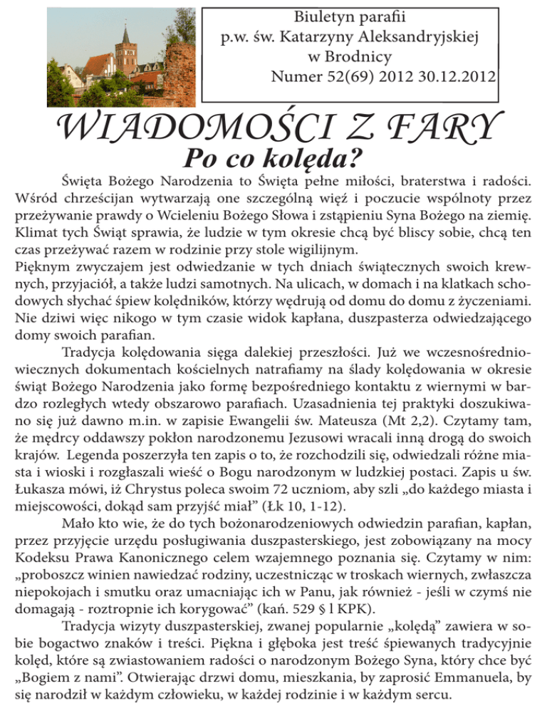 Biuletyn parafii p.w. św. Katarzyny Aleksandryjskiej w Brodnicy Numer 52(69) 2012 30.12.2012 WIADOMOŚCI Z FARY Po co kolęda? Święta Bożego Narodzenia to Święta pełne miłości, braterstwa i radości. Wśród chrześcijan wytwarzają one szczególną więź i poczucie wspólnoty przez przeżywanie prawdy o Wcieleniu Bożego Słowa i zstąpieniu Syna Bożego na ziemię. Klimat tych Świąt sprawia, że ludzie w tym okresie chcą być bliscy sobie, chcą ten czas przeżywać razem w rodzinie przy stole wigilijnym. Pięknym zwyczajem jest odwiedzanie w tych dniach świątecznych swoich krewnych, przyjaciół, a także ludzi samotnych. Na ulicach, w domach i na klatkach schodowych słychać śpiew kolędników, którzy wędrują od domu do domu z życzeniami. Nie dziwi więc nikogo w tym czasie widok kapłana, duszpasterza odwiedzającego domy swoich parafian. Tradycja kolędowania sięga dalekiej przeszłości. Już we wczesnośredniowiecznych dokumentach kościelnych natrafiamy na ślady kolędowania w okresie świąt Bożego Narodzenia jako formę bezpośredniego kontaktu z wiernymi w bardzo rozległych wtedy obszarowo parafiach. Uzasadnienia tej praktyki doszukiwano się już dawno m.in. w zapisie Ewangelii św. Mateusza (Mt 2,2). Czytamy tam, że mędrcy oddawszy pokłon narodzonemu Jezusowi wracali inną drogą do swoich krajów. Legenda poszerzyła ten zapis o to, że rozchodzili się, odwiedzali różne miasta i wioski i rozgłaszali wieść o Bogu narodzonym w ludzkiej postaci. Zapis u św. Łukasza mówi, iż Chrystus poleca swoim 72 uczniom, aby szli „do każdego miasta i miejscowości, dokąd sam przyjść miał” (Łk 10, 1-12). Mało kto wie, że do tych bożonarodzeniowych odwiedzin parafian, kapłan, przez przyjęcie urzędu posługiwania duszpasterskiego, jest zobowiązany na mocy Kodeksu Prawa Kanonicznego celem wzajemnego poznania się. Czytamy w nim: „proboszcz winien nawiedzać rodziny, uczestnicząc w troskach wiernych, zwłaszcza niepokojach i smutku oraz umacniając ich w Panu, jak również - jeśli w czymś nie domagają - roztropnie ich korygować” (kań. 529 § l KPK). Tradycja wizyty duszpasterskiej, zwanej popularnie „kolędą” zawiera w sobie bogactwo znaków i treści. Piękna i głęboka jest treść śpiewanych tradycyjnie kolęd, które są zwiastowaniem radości o narodzonym Bożego Syna, który chce być „Bogiem z nami”. Otwierając drzwi domu, mieszkania, by zaprosić Emmanuela, by się narodził w każdym człowieku, w każdej rodzinie i w każdym sercu. Kulminacyjnym punktem odwiedzin kałana jest odczytanie w rodzinie fragmentu Pisma św. (jeżeli zostało wyłożone) o narodzeniu Pana Jezusa oraz modlitwy o błogosławieństwo dla mieszkańców, np: „Panie, pobłogosław nam, błogosław ten dom i jego mieszkańców, daj im anioła za stróża, aby strzegł, osłaniał i bronił przez Jezusa Chrystusa”. Po odmówieniu modlitwy Pańskiej, której nauczył nas Jezus Chrystus, preferuje się odmówienie modlitw wstawienniczych za rodzinę, za dzieci, za małżonków, za chorych i samotnych. Miło, kiedy podczas odwiedzin kolędowych bierze w nich udział cała rodzina. Tematem wizyty duszpasterskiej są przede wszystkim kwestie natury religijnej. Niekiedy ta krótka i raczej symboliczna wizyta staje się okazją do podjęcia bardzo ważnej i trudnej sprawy, która wymaga poświęcenia zdecydowanie większej ilości czasu. Dlatego jeśli zachodzi taka potrzeba i ktoś potrzebuje dłuższej rozmowy, właśnie na kolędzie ma możliwość umówienia się z duszpasterzem w dogodnym dla obu stron terminie. Na stole powinno leżeć Pismo św., krzyż, świece, woda święcona i kropidło. Zazwyczaj parafianie z radością oczekują na przybycie swojego duszpasterza, goszcząc go w progach swojego domu. Niestety zdarzają się, też i pewne trudności, z jakimi spotyka się kapłan podczas kolędy. Zamknięte drzwi, nie zawsze muszą oznaczać niechęć do księdza ze strony parafian. Najczęstszym dziś tego powodem jest po prostu praca domowników, która uniemożliwia wspólne spotkanie. Niejednokrotnie problemy z przyjęciem księdza w domu mają „wierzący” stojący z boku Kościoła, „wierzący-niepraktykujący”, żyjący w związkach niesakramentalnych, których styl życia wyklucza ich z możliwości aktywnego uczestnictwa w życiu sakramentalnym Kościoła. Każda parafia prowadzi kartoteki swoich parafian, gdzie odnotowuje się dane, przyjęte sakramenty, informacje o sytuacji rodziny, problemy. Warto dbać, aby ta kartoteka była uzupełniana przez kapłana na kolędzie. Jeśli ktoś jest nieobecny w domu (z różnych przyczyn), a ma życzenie wizyty duszpasterskiej, może zawsze skontaktować się osobiście lub telefonicznie z proboszczem parafii, aby umówić się na kolędę w innym dogodnym terminie. Warto odwiedziny kolędowe przeżywać w duchu radości bożonarodzeniowej, w duchu modlitwy, serdecznej rozmowy z duszpasterzami. Niech błogosławieństwo kolędowe chroni nasz dom, nasze rodziny i umacnia nas na drodze życia chrześcijańskiego. A oto plan wizyty duszpasterskiej na najbliższe dni w naszej parafii: 2.01.2013 – środa – od godz. 15.30 5.01.2013 – sobota – od godz. 14.00 1. Ogrodowa 1 – 43 1. Lidzbarska 1A do Polmo 2. Ogrodowa 2 2. Młyńska i Lidzbarska od 47-20 3. Ogrodowa 2a i 12 3. Lidzbarska 59 – 50 4. Ogrodowa 4 – 24 4. Żeromskiego i Lidzbarska 6 5. Grunwaldzka i Strzelecka 5. Krajobrazowa i Lidzbarska za torami 6.01.2013 – niedziela – od godz. 14.00 1. Waryńskiego (parzyste) 2. Waryńskiego (nieparzyste) 3. Kochanowskiego 4. Prosta 5. Jagiellońska 7.01.2013 – poniedziałek – od godz. 15.30 1. 18 Stycznia 3 – 29 2. 18 Stycznia 31 – 57A 3. 18 Stycznia 85 – 59 i Nad Stawem 4. 18 Stycznia 105 – 87a 5. 18 Stycznia 131 – 107 OGŁOSZENIA PARAFIALNE Niedziela Świętej Rodziny 30. grudnia 2012 1. Dzisiejsza niedziela, ostatnia w kończącym się roku 2012, jest 