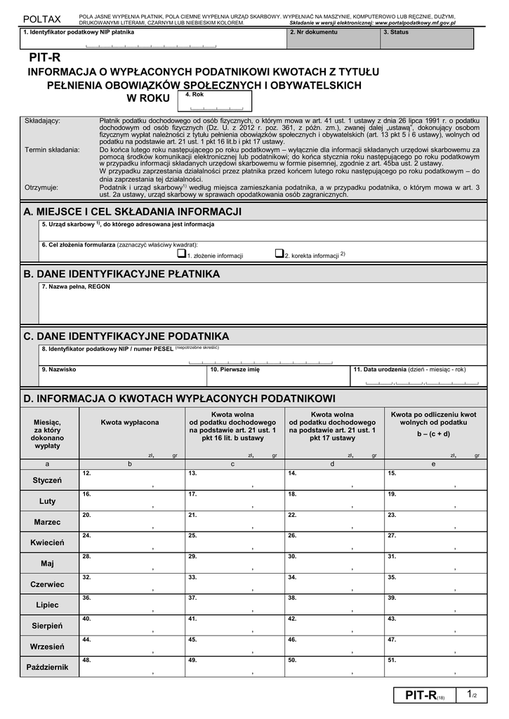 POLTAX POLA JASNE WYPEŁNIA PŁATNIK, POLA CIEMNE WYPEŁNIA URZĄD SKARBOWY. WYPEŁNIAĆ NA MASZYNIE, KOMPUTEROWO LUB RĘCZNIE, DUŻYMI, DRUKOWANYMI LITERAMI, CZARNYM LUB NIEBIESKIM KOLOREM. Składanie w wersji elektronicznej: www.portalpodatkowy.mf.gov.pl 2. Nr dokumentu 1. Identyfikator podatkowy NIP płatnika PIT-R 3. Status └────┴────┴────┴────┴────┴────┴────┴────┴────┴────┘ INFORMACJA O WYPŁACONYCH PODATNIKOWI KWOTACH Z TYTUŁU PEŁNIENIA OBOWIĄZKÓW SPOŁECZNYCH I OBYWATELSKICH 4. Rok W ROKU └────┴────┴────┴────┘ Składający: Płatnik podatku dochodowego od osób fizycznych, o którym mowa w art. 41 ust. 1 ustawy z dnia 26 lipca 1991 r. o podatku dochodowym od osób fizycznych (Dz. U. z 2012 r. poz. 361, z późn. zm.), zwanej dalej „ustawą”, dokonujący osobom fizycznym wypłat należności z tytułu pełnienia obowiązków społecznych i obywatelskich (art. 13 pkt 5 i 6 ustawy), wolnych od podatku na podstawie art. 21 ust. 1 pkt 16 lit.b i pkt 17 ustawy. Do końca lutego roku następującego po roku podatkowym – wyłącznie dla informacji składanych urzędowi skarbowemu za pomocą środków komunikacji elektronicznej lub podatnikowi; do końca stycznia roku następującego po roku podatkowym w przypadku informacji składanych urzędowi skarbowemu w formie pisemnej, zgodnie z art. 45ba ust. 2 ustawy. W przypadku zaprzestania działalności przez płatnika przed końcem lutego roku następującego po roku podatkowym – do dnia zaprzestania tej działalności. Podatnik i urząd skarbowy1) według miejsca zamieszkania podatnika, a w przypadku podatnika, o którym mowa w art. 3 ust. 2a ustawy, urząd skarbowy w sprawach opodatkowania osób zagranicznych. Termin składania: Otrzymuje: A. MIEJSCE I CEL SKŁADANIA INFORMACJI 5. Urząd skarbowy 1), do którego adresowana jest informacja 6. Cel złożenia formularza (zaznaczyć właściwy kwadrat): 1. złożenie informacji 2. korekta informacji 2) B. DANE IDENTYFIKACYJNE PŁATNIKA 7. Nazwa pełna, REGON C. DANE IDENTYFIKACYJNE PODATNIKA 8. Identyfikator podatkowy NIP / numer PESEL (niepotrzebne skreślić) └────┴────┴────┴────┴────┴────┴────┴────┴────┴────┴────┘ 10. Pierwsze imię 9. Nazwisko 11. Data urodzenia (dzień - miesiąc - rok) └────┴────┘-└────┴────┘-└────┴────┴────┴────┘ D. INFORMACJA O KWOTACH WYPŁACONYCH PODATNIKOWI Miesiąc, za który dokonano wypłaty Kwota wypłacona a b Styczeń Luty Marzec Kwiecień Maj Czerwiec Lipiec Sierpień Wrzesień Październik zł, 12. Kwota wolna od podatku dochodowego na podstawie art. 21 ust. 1 pkt 16 lit. b ustawy gr c zł, 13. , 16. , , , , 47. , 50. , , 43. 46. 49. , , , , , 39. 42. 45. 48. , , , 44. , 35. 38. 41. , 31. , , , 40. , , 34. 37. , 27. 30. , , 36. , , , gr 23. 26. 33. e , , , 32. zł, gr 19. 22. 29. b – (c + d) 15. 18. 25. , zł, Kwota po odliczeniu kwot wolnych od podatku , , , 28. d 14. 21. 24. gr , 17. 20. Kwota wolna od podatku dochodowego na podstawie art. 21 ust. 1 pkt 17 ustawy , 51. , , PIT-R (18) 1/2 POLTAX POLA JASNE WYPEŁNIA PŁATNIK, POLA CIEMNE WYPEŁNIA URZĄD SKARBOWY. WYPEŁNIAĆ NA MASZYNIE, KOMPUTEROWO LUB RĘCZNIE, DUŻYMI, DRUKOWANYMI LITERAMI, CZARNYM LUB NIEBIESKIM KOLOREM. Składanie w wersji elektronicznej: www.portalpodatkowy.mf.gov.pl 52. Listopad 53. , 56. Grudzień 54. 55. , 57. , , 58. , 59. , , , 60. Razem , E. PODPIS PŁATNIKA LUB OSOBY ODPOWIEDZIALNEJ ZA OBLICZENIE I POBRANIE PODATKU / PEŁNOMOCNIKA PŁATNIKA 61. Imię 62. Nazwisko 63. Podpis i pieczątka 1) Ilekroć w informacji jest mowa o urzędzie skarbowym, w tym urzędzie skarbowym, do którego adresowana jest informacja – oznacza to urząd skarbowy, przy pomocy którego właściwy dla podatnika naczelnik urzędu skarbowego wykonuje swoje zadania. 2) Zgodnie z art. 81 ustawy z dnia 29 sierpnia 1997 r. – Ordynacja podatkowa (Dz. U. z 2015 r. poz. 613, z późn. zm.). Objaśnienia 1. W części D: 1) w kolumnie b – płatnik wykazuje ogólną kwotę wypłat należności dokonanych w danym miesiącu, z uwzględnieniem kwot wolnych od podatku dochodowego na podstawie art. 21 ust. 1 pkt 16 lit. b i pkt 17 ustawy, 2) w kolumnie c – płatnik wykazuje kwoty diet i innych należności, wypłacone osobom pełniącym obowiązki społeczne i obywatelskie, wolne od podatku dochodowego na podstawie art. 21 ust. 1 pkt 16 lit. b ustawy, 3) 4) w kolumnie d – płatnik wykazuje kwoty diet oraz kwoty stanowiące zwrot kosztów, wypłacone osobom pełniącym obowiązki społeczne i obywatelskie, wolne od podatku dochodowego na podstawie art. 21 ust. 1 pkt 17 ustawy, w kolumnie e – płatnik wykazuje nadwyżkę między kwotą wypłaconych należności a sumą kwot wolnych od podatku dochodowego, która podlega opodatkowaniu podatkiem dochodowym. 2. Sumę kwot wykazanych w kolumnie e płatnik wykazuje w wierszu 7 części E informacji PIT-11 oraz w rocznym obliczeniu podatku PIT-40. 3. W sytuacji gdy płatnik wypłaca osobie fizycznej jedynie należności z tytułu pełnienia obowiązków społecznych i obywatelskich i należności te nie przekraczają kwot wolnych od podatku dochodowego, płatnik nie ma obowiązku sporządzania informacji PIT-11, a jedynie informację PIT-R. Jeden egzemplarz informacji płatnik przesyła do urzędu skarbowego według miejsca zamieszkania podatnika, drugi egzemplarz przekazuje podatnikowi. Pouczenie Za uchybienie obowiązkom płatnika grozi odpowiedzialność przewidziana w Kodeksie karnym skarbowym. PIT-R (18) 2/2