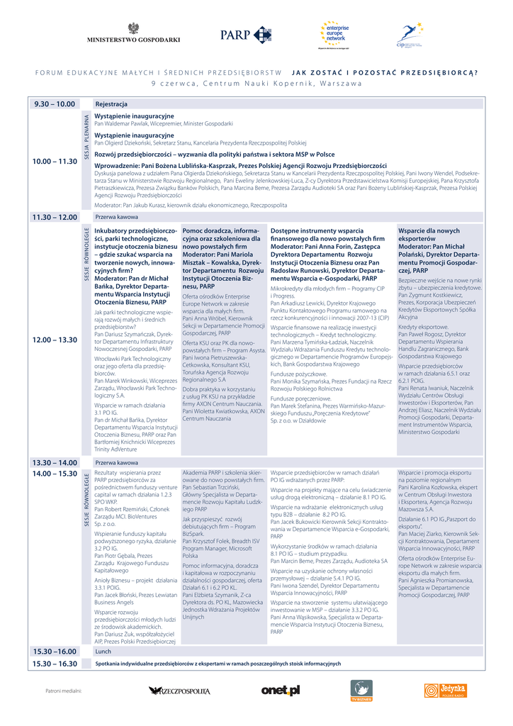 F O R U M E D U K A C YJ N E M A ŁYC H I Ś R E D N I C H P R Z E D S I Ę B I O R S T W JA K ZOS TAĆ I P OZOS TAĆ PR Z E DS I Ę B I O R C Ą? 9 czerwca, Centrum Nauki Kopernik, Warszawa 9.30 – 10.00 SESJA PLENARNA 10.00 – 11.30 Rejestracja Wystąpienie inauguracyjne Pan Waldemar Pawlak, Wicepremier, Minister Gospodarki Wystąpienie inauguracyjne Pan Olgierd Dziekoński, Sekretarz Stanu, Kancelaria Prezydenta Rzeczpospolitej Polskiej Rozwój przedsiębiorczości – wyzwania dla polityki państwa i sektora MSP w Polsce Wprowadzenie: Pani Bożena Lublińska-Kasprzak, Prezes Polskiej Agencji Rozwoju Przedsiębiorczości Dyskusja panelowa z udziałem Pana Olgierda Dziekońskiego, Sekretarza Stanu w Kancelarii Prezydenta Rzeczpospolitej Polskiej, Pani Iwony Wendel, Podsekretarza Stanu w Ministerstwie Rozwoju Regionalnego, Pani Eweliny Jelenkowskiej-Luca, Z-cy Dyrektora Przedstawicielstwa Komisji Europejskiej, Pana Krzysztofa Pietraszkiewicza, Prezesa Związku Banków Polskich, Pana Marcina Beme, Prezesa Zarządu Audioteki SA oraz Pani Bożeny Lublińskiej-Kasprzak, Prezesa Polskiej Agencji Rozwoju Przedsiębiorczości Moderator: Pan Jakub Kurasz, kierownik działu ekonomicznego, Rzeczpospolita 11.30 – 12.00 SESJE RÓWNOLEGŁE Przerwa kawowa Jak parki technologiczne wspierają rozwój małych i średnich przedsiębiorstw? Pan Dariusz Szymańczak, Dyrektor Departamentu Infrastruktury Nowoczesnej Gospodarki, PARP Pomoc doradcza, informacyjna oraz szkoleniowa dla nowo powstałych firm Moderator: Pani Mariola Misztak – Kowalska, Dyrektor Departamentu Rozwoju Instytucji Otoczenia Biznesu, PARP Oferta ośrodków Enterprise Europe Network w zakresie wsparcia dla małych firm. Pani Anna Wróbel, Kierownik Sekcji w Departamencie Promocji Gospodarczej, PARP Dostępne instrumenty wsparcia finansowego dla nowo powstałych firm Moderator: Pani Anna Forin, Zastępca Dyrektora Departamentu Rozwoju Instytucji Otoczenia Biznesu oraz Pan Radosław Runowski, Dyrektor Departamentu Wsparcia e-Gospodarki, PARP Mikrokredyty dla młodych firm – Programy CIP i Progress. Pan Arkadiusz Lewicki, Dyrektor Krajowego Punktu Kontaktowego Programu ramowego na rzecz konkurencyjności i innowacji 2007-13 (CIP) Wsparcie finansowe na realizację inwestycji technologicznych – Kredyt technologiczny. Pani Marzena Tymińska-Ładziak, Naczelnik Oferta KSU oraz PK dla nowopowstałych firm – Program Asysta. Wydziału Wdrażania Funduszu Kredytu technologicznego w Departamencie Programów EuropejsPani Iwona PietruszewskaWrocławki Park Technologiczny kich, Bank Gospodarstwa Krajowego Cetkowska, Konsultant KSU, oraz jego oferta dla przedsięToruńska Agencja Rozwoju biorców. Fundusze pożyczkowe. Pan Marek Winkowski, Wiceprezes Regionalnego S.A Pani Monika Szymańska, Prezes Fundacji na Rzecz Zarządu, Wrocławski Park Techno- Dobra praktyka w korzystaniu Rozwoju Polskiego Rolnictwa logiczny S.A. z usług PK KSU na przykładzie Fundusze poręczeniowe. firmy AXON Centrum Nauczania. Pan Marek Stefanina, Prezes Warmińsko-MazurWsparcie w ramach działania Pani Wioletta Kwiatkowska, AXON skiego Funduszu „Poręczenia Kredytowe” 3.1 PO IG. Centrum Nauczania Pan dr Michał Bańka, Dyrektor Sp. z o.o. w Działdowie Departamentu Wsparcia Instytucji Otoczenia Biznesu, PARP oraz Pan Bartłomiej Knichnicki Wiceprezes Trinity AdVenture 12.00 – 13.30 Rezultaty wspierania przez PARP przedsiębiorców za pośrednictwem funduszy venture capital w ramach działania 1.2.3 SPO WKP. Pan Robert Rzemiński, Członek Zarządu MCI. BioVentures Sp. z o.o. Wspieranie funduszy kapitału podwyższonego ryzyka, działanie 3.2 PO IG. Pan Piotr Gębala, Prezes Zarządu Krajowego Funduszu Kapitałowego Akademia PARP i szkolenia skierowane do nowo powstałych firm. Pan Sebastian Trzciński, Główny Specjalista w Departamencie Rozwoju Kapitału Ludzkiego PARP Jak przyspieszyć rozwój debiutujących firm – Program BizSpark. Pan Krzysztof Folek, Breadth ISV Program Manager, Microsoft Polska Pomoc informacyjna, doradcza i kapitałowa w rozpoczynaniu Anioły Biznesu – projekt działania działalności gospodarczej, oferta Działań 6.1 i 6.2 PO KL. 3.3.1 POIG. Pan Jacek Błoński, Prezes Lewiatan Pani Elżbieta Szymanik, Z-ca Dyrektora ds. PO KL, Mazowiecka Business Angels Jednostka Wdrażania Projektów Wsparcie rozwoju przedsiębiorczości młodych ludzi Unijnych ze środowisk akademickich. Pan Dariusz Żuk, współzałożyciel AIP, Prezes Polski Przedsiębiorczej Wsparcie przedsiębiorców w ramach działań PO IG wdrażanych przez PARP: Wsparcie na projekty mające na celu świadczenie usług drogą elektroniczną – działanie 8.1 PO IG. Wsparcie na wdrażanie elektronicznych usług typu B2B – działanie 8.2 PO IG. Pan Jacek Bukowicki Kierownik Sekcji Kontraktowania w Departamencie Wsparcia e-Gospodarki, PARP Wykorzystanie środków w ramach działania 8.1 PO IG – studium przypadku. Pan Marcin Beme, Prezes Zarządu, Audioteka SA Wsparcie na uzyskanie ochrony własności przemysłowej – działanie 5.4.1 PO IG. Pani Iwona Szendel, Dyrektor Departamentu Wsparcia Innowacyjności, PARP Wsparcie na stworzenie systemu ułatwiającego inwestowanie w MSP – działanie 3.3.2 PO IG. Pani Anna Wąsikowska, Specjalista w Departamencie Wsparcia Instytucji Otoczenia Biznesu, PARP 15.30 –16.00 Lunch 15.30 – 16.30 Spotkania indywidualne przedsiębiorców z ekspertami w ramach poszczególnych stoisk informacyjnych Patroni medialni: Wsparcie dla nowych eksporterów Moderator: Pan Michał Polański, Dyrektor Departamentu Promocji Gospodarczej, PARP Bezpieczne wejście na nowe rynki zbytu – ubezpieczenia kredytowe. Pan Zygmunt Kostkiewicz, Prezes, Korporacja Ubezpieczeń Kredytów Eksportowych Spółka Akcyjna Kredyty eksportowe. Pan Paweł Rogosz, Dyrektor Departamentu Wspierania Handlu Zagranicznego, Bank Gospodarstwa Krajowego Wsparcie przedsiębiorców w ramach działania 6.5.1 oraz 6.2.1 POIG. Pani Renata Iwaniuk, Naczelnik Wydziału Centrów