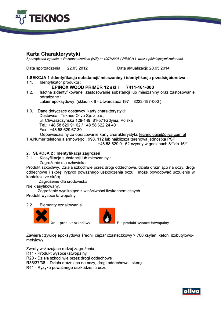 Karta Charakterystyki Sporządzona zgodnie z Rozporządzeniem (WE) nr 1907/2006 ( REACH ) wraz z późniejszymi zmianami. Data sporządzenia : 22.03.2012 Data aktualizacji: 20.05.2014 1.SEKCJA 1 :Identyfikacja substancji/ mieszaniny i identyfikacja przedsiębiorstwa : 1.1. Identyfikator produktu : EPINOX WOOD PRIMER 12 skł.I 1.2. 7411-161-000 Istotne zidentyfikowane zastosowanie substancji lub mieszaniny oraz zastosowanie odradzane : Lakier epoksydowy (składnik II - Utwardzacz 197 8222-197-000 ) 1.3. Dane dotyczące dostawcy karty charakterystyki: Dostawca : Teknos-Oliva Sp. z o.o., ul. Chwaszczyńska 129-149, 81-571Gdynia, Polska Tel.: +48 58 629 91 62 / +48 58 622 24 40 Fax.: +48 58 629 67 30 Odpowiedzialny za opracowanie karty charakterystyki: [email protected] 1.4.Numer telefonu alarmowego : 998, 112 lub najbliższa terenowa jednostka PSP +48 58 629 91 62 czynny w godzinach 8oo do 16oo 2. SEKCJA 2 : Identyfikacja zagrożeń 2.1. Klasyfikacja substancji lub mieszaniny : Zagrożenie dla człowieka Produkt szkodliwy. Działa szkodliwie przez drogi oddechowe, działa drażniąco na oczy, drogi oddechowe i skórę, ryzyko poważnego uszkodzenia oczu, może powodować uczulenie w kontakcie ze skórą . Zagrożenie dla środowiska Nie klasyfikowany. Zagrożenie wynikające z właściwości fizykochemicznych. Produkt wysoce łatwopalny. 2.2. Elementy oznakowania Xn – produkt szkodliwy F – produkt wysoce łatwopalny Zawiera : żywicę epoksydową średni ciężar cząsteczkowy > 700,ksylen, keton izobutylowometylowy Zwroty wskazujące rodzaj zagrożenia : R11 - Produkt wysoce łatwopalny R20 - Działa szkodliwie przez drogi oddechowe R36/37/38 – Działa drażniąco na oczy, drogi oddechowe i skórę R41 - Ryzyko poważnego uszkodzenia oczu 1/8 R43 - Może powodować uczulenie w kontakcie ze skórą Zwroty określające warunki bezpiecznego stosowania : S2 - Chronić przed dziećmi S23 - Nie wdychać rozpylonej cieczy S24 - Unikać zanieczyszczenia skóry S26 – Zanieczyszczone oczy przemyć natychmiast dużą ilością wody i zasięgnąć porady lekarza S37/39 - Nosić odpowiednie rękawice ochronne i okulary lub ochronę twarzy S46 – W razie połknięcia niezwłocznie zasięgnij porady lekarza – pokaż opakowanie lub etykietę 2.3. Inne zagrożenia Zawarte w produkcie substancje nie spełniają kryteriów PBT lub vPvB zgodnie z załącznikiem XIII rozporządzenia REACH. 3. SEKCJA 3 :Skład / informacja o składnikach 3.1.Substancje 3.2.Mieszaniny Nazwa składnika Nr CAS Nr WE Indeks - Zawartość [%] wagowa 35-43 Xi; R36/3843 Eye Irrit. 2 Skin Irrit. 2 Skin Sens. 1 H319 H315 H317 Ksylen 1330-20-7 215-535-7 601-022-00-9 8-12 Xn; Xi; R1020/21-38 Etylobenzen 100-41-4 202-849-4 601-023-00-4 108-10-1 203-550-1 606-004-00-4 1-4 Xn, F; R1120 Flam. Liq. 3 Acute Tox. 4 Acute Tox. 4 Skin Irrit. 2 Asp. Tox. 1 Eye Irrit. 2 STOT SE STOT RE Flam. Liq. 2 Acute Tox. 4 H226 H332 H312 H315 H304 H319 H335 H373 H225 H332 21-25 F; Xn; Xi; R11-2036/37-66 17-21 Xn, Xi; R1022-37/38-4167 4-8 -; R10-67 Flam. Liq. 2 Acute Tox. 4 Eye Irrit. 2 STOT SE 3 Flam. Liq. 3 Acute Tox. 4 STOT SE 3 Skin Irrit. 2 Eye Dam. 1 STOT SE 3 Flam. Liq. 3 STOT SE 3 H225 H332 H319 H335 H226 H302 H335 H315 H318 H336 H226 H336 Żywica epoksydowa śr. ciężar cząst.> 700 Keton izobutylowometylowy Butan-1-ol 71-36-3 200-751-6 603-004-00-6 1-Etoksy 2-propanol 1569-02-4 216-374-5 603-177-00-8 67/548/EWG Klasyfikacja 1272/2008 CLP Pełne brzmienie Symboli ryzyka R i H w sekcji 16. 4. SEKCJA 4 : Środki pierwszej pomocy: 4.1.Opis środków pierwszej pomocy : Drogi oddechowe Przenieść poszkodowanego na świeże powietrze. Jeżeli nie jest przytomny i nie oddycha, zastosować sztuczne oddychanie lub tlen. Wezwać pomoc lekarską. Jeżeli oddycha, umieścić go w cieple i zabezpieczyć przed zimnem. Kontakt ze skórą Usunąć natychmiast zanieczyszczoną odzież, a skórę przemyć wodą z mydłem i nałożyć krem. Duże ilości farby można w razie konieczności zmyć wcześniej szmatką nawilżoną rozcieńczalnikiem. Małe zachlapania można zmyć środkiem myjącym lub olejem jadalnym. Kontakt z oczami 7411-161-000 20.05.2014 2(8) Przemywać wodą przynajmniej 15 minut. Ryzyko poważnego uszkodzenia oczu . W razie konieczności wezwać lekarza. Przewód pokarmowy Nie podawać niczego osobie nieprzytomnej. Pić wodę. Nie prowokować wymiotów. W razie konieczności wezwać lekarza. Inne zalecenia 4.2.Najważniejsze ostre i opóźnione objawy oraz skutki narażenia – Wdychanie: podrażnienie śluzówki Kontakt ze skórą: wysuszenie, podrażnienie, może powodować uczulenie w kontakcie ze skórą Kontakt z oczami: ryzyko poważnego uszkodzenia oczu ,zaczerwienienie, ból, zaburzenia widzenia. Spożycie: biegunka, ból głowy, skurcze brzuszne, senność, wymioty 4.3.Wskazania dotyczące wszelkiej natychmiastowej pomocy lekarskiej i szczególnego postępowania z poszkodowanym : do decyzji lekarza. 5. SEKCJA 5 : Postępowanie w przypadku pożaru 5.1.Środki gaśnicze Przy gaszeniu stosować pianę, dwutlenek węgla lub proszki gaśnicze. 5.2.Szczególne zagrożenia związane z substancją lub mieszaniną Nigdy nie stosować strumienia wody, bo może rozprzestrzeniać ogień. Ogień powoduje wydzielenie toksycznych gazów 5.3.Informacje dla straży pożarnej Ogień powoduje wydzielenie toksycznych gazów. Stosować rękawice ochronne, odzież ochronną, okulary lub ochronę twarzy. Zapobiegać rozprzestrzenianiu stosując zapory, bariery, nie dopuścić do przedostania się preparatu do wód powierzchniowych. Pozostałości po pożarze i zanieczyszczona woda użyta do gaszenia ognia muszą być usunięte zgodnie z przepisami. 6. SEKCJA 6 :Postępowanie w przypadku niezamierzonego uwolnienia do środowiska 6.1.Indywidualne środki ostrożności ,wyposażenie ochronne i procedury w sytuacjach awaryjnych Usunąć występujące źródła zapłonu, zapewnić dobrą wentylację. Unikać wdychania oparów. Patrz poz. 7 i 8 w zakresie ob