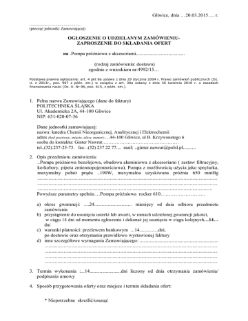 Gliwice, dnia …20.03.2015…. r. ................................................. (pieczęć jednostki Zamawiającej) OGŁOSZENIE O UDZIELANYM ZAMÓWIENIUZAPROSZENIE DO SKŁADANIA OFERT na .Pompa próżniowa z akcesoriami....................................... (rodzaj zamówienia: dostawa) zgodnie z wnioskiem nr:4992/15… Podstawa prawna ogłoszenia: art. 4 pkt 8a ustawy z dnia 29 stycznia 2004 r. Prawo zamówień publicznych (Dz. U. z 2013r., poz. 907 z późn. zm.) w związku z art. 30a ustawy z dnia 30 kwietnia 2010 r. o zasadach finansowania nauki (Dz. U. Nr 96, poz. 615, z późn. zm.). 1. Pełna nazwa Zamawiającego (dane do faktury) POLITECHNIKA ŚLĄSKA Ul. Akademicka 2A, 44-100 Gliwice NIP: 631-020-07-36 Dane jednostki zamawiającej: nazwa: katedra Chemii Nieorganicznej, Analitycznej i Elektrochemii adres (kod pocztowy, miasto, ulica, numer):…44-100 Gliwice, ul B. Krzywoustego 6 osoba do kontaktu: Ginter Nawrat………………………………………… tel..(32).237-25-73. fax: .(32) 237 22 77.... mail: [email protected].......... 2. Opis przedmiotu zamówienia: ..Pompa próżniowa bezolejowa, obudowa aluminiowa z akcesoriami ( zestaw filtracyjny, korkobory, pipeta zmiennopojemnościowa). Pompa z możliwością użycia jako sprężarka, maxymalny pobór prądu ..190W, maxymalna uzyskiwana próżnia 650 mmHg ................................................................................................................................................ ................................................................................................................................................ ............................................................................................................................................ Powyższe parametry spełnia:…Pompa próżniowa rocker 610……………………… a) okres gwarancji: ....24.............................. miesięcy od dnia odbioru przedmiotu zamówienia b) przystąpienie do usunięcia usterki lub awarii, w ramach udzielonej gwarancji jakości, w ciągu 14 dni od momentu zgłoszenia i dokonać jej usunięcia w ciągu kolejnych…14… dni c) warunki płatności: przelewem bankowym ...14...............dni, po dostawie oraz otrzymaniu prawidłowo wystawionej faktury d) inne szczegółowe wymagania Zamawiającego: ............................................................... .......................................................................................................................................... .......................................................................................................................................... .......................................................................................................................................... .......................................................................................................................................... 3. Termin wykonania :...14.........................dni liczony od dnia otrzymania zamówienia/ podpisania umowy 4. Sposób przygotowania oferty oraz miejsce i termin składania ofert: * Niepotrzebne skreślić/usunąć Ofertę należy złożyć (należy wybrać proponowane sposoby komunikacji*): a) osobiście w: ...................................................................................................................... b) przesłać na adres: ............................................................................................................. ........................................................................................................................................... a) przesłać faxem na numer: ................................................................................................. b) w wersji elektronicznej na e-mail: [email protected]......................................... w nieprzekraczalnym terminie: do dnia .....26.03.2015.............................................. c) całkowita oferowana cena musi obejmować kompleksową realizację zamówienia i uwzględniać wszystkie składniki cenotwórcze, w tym koszty transportu, ubezpieczenia, wszelkie ewentualne cła, podatki, składki na ubezpieczenia społeczne i zdrowotne, itp. 5. Oferty otrzymane po terminie składania ofert nie będą rozpatrywane. 6. Do oferty muszą być dołączone następujące dokumenty: a) wypełniony (i podpisany- jeżeli jest to wymagane) formularz oferty, b) inne dokumenty …………………………………………….............. 7. Kryteria oceny ofert*: a) Najniższa cena b) Cena oraz inne kryteria (podać jakie i opisać sposób przyznawania punktów tj. wagę, maksymalną liczba punktów możliwą do uzyskania dla danego kryterium): …………………………………………………………………………………………. Zaproszenie do składania ofert sporządził/sporządziła: …20.03.2015…. data ……Ginter Nawrat……………………………………….. (imię , nazwisko i podpis pracownika prowadzącego sprawę) Zaproszenie do składania ofert ze strony Zamawiającego zostało zaaprobowane dnia ................... 20... r. ...................................................................................................... (podpis z imienną pieczątką osoby z jednostki/komórki zamawiającej) Uwagi dla jednostki lub komórki zamawiającej: - w przypadku załączenia przez Wykonawcę do oferty projektu umowy, projekt ten musi być zatwierdzony przez radcę prawnego Politechniki Śląskiej, - w uzasadnionych przypadkach najniższa cena nie musi być jedynym kryterium wyboru najkorzystniejszej oferty. W takich przypadkach jednostka lub komórka zamawiająca zobowiązana jest określić w pkt. 7niniejszego „Zaproszenia do składania ofert” dodatkowe kryteria oceny ofert (dotyczące np. terminu realizacji zamówienia, okresu gwarancji, kosztów eksploatacji lub innych rozwiązań) oraz wykazać w protokole, że rozpatry