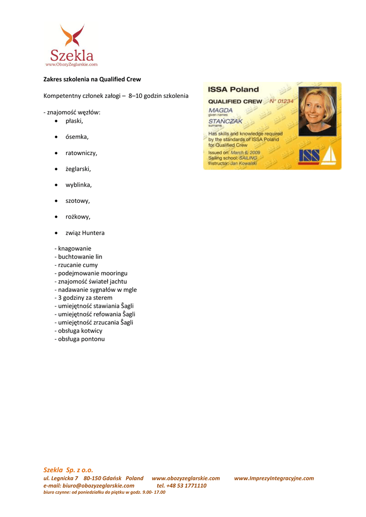 Zakres szkolenia na Qualified Crew Kompetentny członek załogi – 8–10 godzin szkolenia - znajomość węzłów: płaski, ósemka, ratowniczy, żeglarski, wyblinka, szotowy, rożkowy, związ Huntera - knagowanie - buchtowanie lin - rzucanie cumy - podejmowanie mooringu - znajomość świateł jachtu - nadawanie sygnałów w mgle - 3 godziny za sterem - umiejętność stawiania Ŝagli - umiejętność refowania Ŝagli - umiejętność zrzucania Ŝagli - obsługa kotwicy - obsługa pontonu Szekla Sp. z o.o. ul. Legnicka 7 80-150 Gdańsk Poland e-mail: [email protected] www.obozyzeglarskie.com tel. +48 53 1771110 biuro czynne: od poniedziałku do piątku w godz. 9.00- 17.00 www.ImprezyIntegracyjne.com