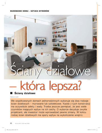BUDOWANIE DOMU – SZTUKA WYBORÓW ¥ciany dziaïowe fot. Bose – która lepsza? ¥ciany dziaïowe Tadeusz Lipski We wspóïczesnych domach jednorodzinnych wykonuje siÚ dwa rodzaje Ăcian dziaïowych – murowane lub szkieletowe. Kaĝda z tych konstrukcji ma oczywiĂcie zalety i wady. Trzeba jeszcze pamiÚtaÊ, ĝe jest wiele czynników majÈcych wpïyw na ich cechy. O wyborze decyduje zwykle projektant, ale inwestor moĝe wprowadzaÊ pewne zmiany. W koñcu rodzaj Ăcian dziaïowych ma spory wpïyw na wykoñczenie wnÚtrz. 60 BUDUJEMY DOM BD4_sciany_dzialowe.indd 60 4/2009 2009-03-15 21:57:43 fot. Dekoral ¥ciany dziaïowe fot. Vitrosilicon fot. A. Rezler Z lekkich Ăcian g-k najïatwiej wykonaÊ efektowne przegrody wewnÚtrzne ¥ciana dziaïowa z pustaków szklanych zapewnia dostÚp Ăwiatïa do pomieszczeñ bez okien ¥ciany dziaïowe to przegrody, które dzielÈ przestrzeñ budynku na mniejsze pomieszczenia. MuszÈ zatem speïniaÊ pewne ogólne wymagania. Najwaĝniejsza jest ich duĝa sztywnoĂÊ i wytrzymaïoĂÊ na obciÈĝenia poziome. Nie powinny bowiem ulegaÊ uszkodzeniu np. pod naporem przewracajÈcego siÚ czïowieka czy rzuconego przedmiotu. Poza tym Ăciany dziaïowe zwykle wykorzystuje siÚ do wieszania róĝnych elementów wyposaĝenia wnÚtrz, jak szafki kuchenne, póïki z ksiÈĝkami lub instalacje, czyli rury wodociÈgowe, armatura ïazienkowa itp. Z kolei o komforcie uĝytkowania pomieszczeñ bardzo czÚsto decyduje ich izolacyjnoĂÊ akustyczna. Trudno bowiem wypoczywaÊ czy pracowaÊ, gdy przez ĂcianÚ przenikajÈ haïasy spowodowane np. gïoĂno sïuchanÈ muzykÈ albo piskliwymi gïosikami rozbawionych dzieci. Przegrody te po- WewnÚtrzne Ăciany ceglane nie muszÈ byÊ otynkowane, aby dobrze wyglÈdaïy winny równieĝ umoĝliwiaÊ zrealizowanie wymarzonego przez inwestorów wystroju wnÚtrza. MogÈ przecieĝ byÊ przezroczyste, aĝurowe, malowane lub ukazujÈce naturalnÈ fakturÚ materiaïów konstrukcyjnych. Wskazane jest jeszcze, aby byïy tanie i ïatwe do zbudowania. Powyĝsze wymagania speïniane sÈ w róĝnym stopniu w zaleĝnoĂci od zamoĝnoĂci inwestorów, dostÚpnych materiaïów i regionów Ăwiata. MogÈ to byÊ przecieĝ Ăciany dziaïowe z papieru w tradycyjnym domu japoñskim, drewniane w góralskiej chacie czy kamienne w Ăredniowiecznym zamku. Jednak we wspóïczesnych domach jednorodzinnych najczÚĂciej wykonuje siÚ przegrody murowane z róĝnego rodzaju cegieï lub pustaków oraz szkieletowe – przede wszystkim gipsowo-kartonowe na stelaĝu metalowym, ewentualnie drewnianym. Murowane Ăciany dziaïowe Niemal wszystkie przegrody murowane doskonale sprawdzajÈ siÚ jako Ăciany wewnÚtrzne. Przy najczÚĂciej stosowanej gruboĂci 12 cm sÈ wystarczajÈco sztywne i wytrzymaïe, a jednoczeĂnie tanie. Moĝna z nich wykonaÊ zwykïe Ăciany proste lub ïukowe, gïadkie, aĝurowe czy z wnÚkÈ. Sposobów wykoñczenia jest wiele i ïatwo uzyskaÊ zaplanowany efekt. Tym bardziej ĝe zarówno wznoszenie, jak i wykañczanie Ăcian murowanych jest powszechnie znane i niezbyt trudne. Poza tym charakteryzujÈ siÚ bardzo dobrÈ izolacyjnoĂciÈ akustycznÈ. Stosunkowo duĝa masa przegród jest w tym przypadku zaletÈ. To idealne rozwiÈzanie w domach parterowych, w których obciÈĝenia sÈ przenoszone bezpoĂrednio na grunt. Nieco inaczej jest w budynkach piÚtrowych. Wtedy duĝa masa Ăcian obciÈĝajÈcych stropy jest mankamentem. Konieczne jest bowiem BUDUJEMY DOM BD4_sciany_dzialowe.indd 61 4/2009 61 2009-03-15 21:58:00 BUDOWANIE DOMU – SZTUKA WYBORÓW taĂma brzegowa z pianki polietylenowej Ăciana murowana z cegieï peïnych, pustaków ceramicznych lub wapienno-piaskowych najlepiej gruboĂci 12 cm obustronny tynk cementowowapienny, ewentualnie gipsowy gruboĂci przynajmniej 1,5 cm taĂma rozdzielcza z folii lub papieru profil poziomy UW pïyty okïadzinowe gipsowo-kartonowe lub gipsowo-wïóknowe wypeïnienie z póïtwardej weïny mineralnej lub szklanej gruboĂci min. 4 cm z pozostawieniem pustki powietrznej o szerokoĂci co najmniej 1 cm sïupek z profilu CW podïoga pïywajÈca kotwa mocujÈca ĂcianÚ dziaïowÈ do przegrody noĂnej taĂma brzegowa z pianki polietylenowej gruboĂci 1–2 cm izolacja akustyczna stropu taĂma brzegowa z pianki polietylenowej gruboĂci 1–2 cm podïoga pïywajÈca profil poziomy UW izolacja akustyczna stropu Budowa Ăciany murowanej z cegïy lub pustaków wzmacnianie konstrukcji np. przez podwajanie belek noĂnych. Do najlepszych murowanych Ăcian dziaïowych zalicza siÚ przegrody z cegieï peïnych ceramicznych i bloków wapienno-piaskowych gruboĂci 12 cm. Dobre sÈ równieĝ Ăciany wznoszone z pustaków Porotherm gruboĂci 8 i 11,5 cm. Po prostu dziÚki wïaĂciwemu (korzystnemu) ukïadowi szczelin uzyskano zadowalajÈce parametry akustyczne i jednoczeĂnie znacznie obniĝono masÚ przegród. ¥ciany dziaïowe z cegieï dziurawek, kratówek, pustaków PD oraz z betonu komórkowego sÈ wystarczajÈce dla mniej wymagajÈcych inwestorów. Ich wïaĂciwoĂci akustyczne, mechaniczne, wytrzymaïoĂciowe wzrastajÈ, gdy wykoñczy siÚ je tradycyjnym tynkiem cementowym, a nie cementowo-wapiennym czy gipsowym. Warto jeszcze pamiÚtaÊ, ĝe obïoĝenie Ăcian pïytami gipsowo-kartonowymi (metodÈ na placki) zwykle pogarsza wïaĂciwoĂci akustyczne przegród. Konieczne jest przyklejanie pïyt caïÈ powierzchniÈ. 62 BUDUJEMY DOM BD4_sciany_dzialowe.indd 62 Schemat Ăciany gipsowo-kartonowej Szkieletowe Ăciany dziaïowe WszÚdzie tam, gdzie spory ciÚĝar Ăcian murowanych stwarza problemy (np. konstrukcyjne), powinno siÚ stosowaÊ przegrody gipsowo-kartonowe. Zalecenie to jest oczywiste w drewnianych domach szkieletowych zarówno piÚtrowych, jak i parterowych – nikt przecieĝ nie zechce wprowadzaÊ dodatkowych rozwiÈzañ technologicznych. Dotyczy równieĝ nowych budynków murowanych, a takĝe modernizowanych. Po porostu nad piwnicÈ, parterem lub piÚtrem lekkie Ăciany gipsowo-kartonowe moĝna usta