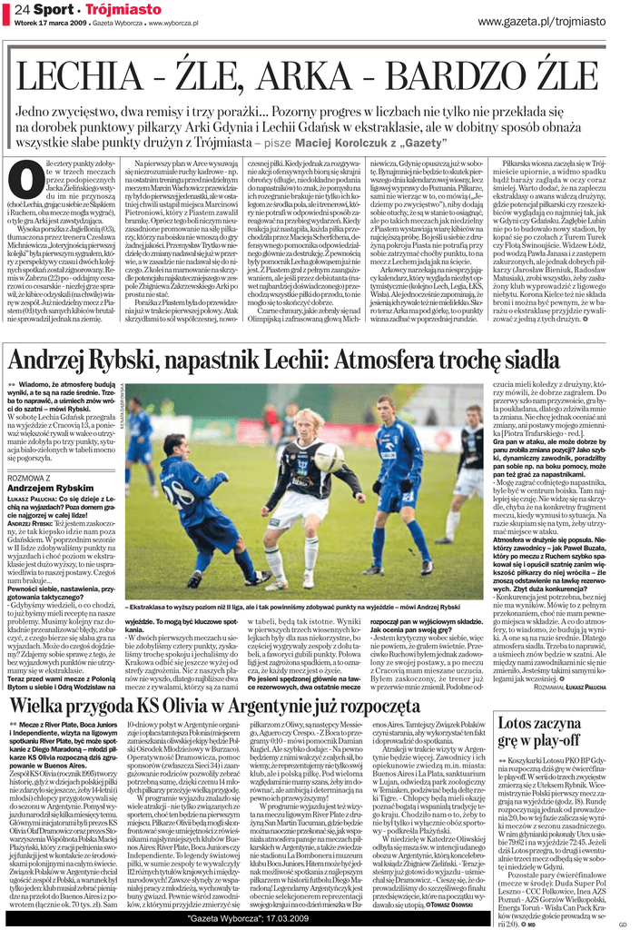 24 Sport 1 Trójmiasto www.gazeta.pl/trojmiasto Wtorek 17 marca 2009 1 Gazeta Wyborcza 1 www.wyborcza.pl LECHIA – ŹLE, ARKA – BARDZO ŹLE Jedno zwycięstwo, dwa remisy i trzy porażki... Pozorny progres w liczbach nie tylko nie przekłada się na dorobek punktowy piłkarzy Arki Gdynia i Lechii Gdańsk w ekstraklasie, ale w dobitny sposób obnaża wszystkie słabe punkty drużyn z Trójmiasta – pisze Maciej Korolczuk z „Gazety” O Na pierwszy plan wArce wysuwają się niezrozumiałe ruchy kadrowe – np. na ostatnim treningu przed niedzielnym meczem Marcin Wachowicz przewidziany był do pierwszej jedenastki, ale wostatniej chwili ustąpił miejsca Marcinowi Pietroniowi, który z Piastem zawalił bramkę. Oprócz tego boli niczym nieuzasadnione promowanie na siłę piłkarzy, którzy na boisku nie wnoszą do gry żadnej jakości. Przemysław Trytko wniedzielę do zmiany nadawał się już wprzerwie, a w zasadzie nie nadawał się do niczego. Zkolei na marnowanie na skrzydle potencjału najskuteczniejszego wzespole Zbigniewa Zakrzewskiego Arki po prostu nie stać. Porażka zPiastem była do przewidzenia już wtrakcie pierwszej połowy. Atak skrzydłami to sól współczesnej, nowo- ile cztery punkty zdobyte w trzech meczach przez podopiecznych Jacka Zielińskiego wstydu im nie przynoszą (choć Lechia, grając usiebie ze Śląskiem i Ruchem, oba mecze mogła wygrać), otyle gra Arki jest zawstydzająca. Wysoka porażka zJagiellonią (0:3), tłumaczona przez trenera Czesława Michniewicza „loteryjnością pierwszej kolejki” była pierwszym sygnałem, który zperspektywy czasu idwóch kolejnych spotkań został zignorowany. Remis wZabrzu (2:2) po – oddajmy cesarzowi co cesarskie – niezłej grze sprawił, że kibice odzyskali (na chwilę) wiarę wzespół. Już niedzielny mecz zPiastem (0:1) tych samych kibiców brutalnie sprowadził jednak na ziemię. czesnej piłki. Kiedy jednak za rozgrywanie akcji ofensywnych biorą się skrajni obrońcy (długie, niedokładne podania do napastników) to znak, że pomysłu na ich rozegranie brakuje nie tylko ich kolegom ze środka pola, ale itrenerowi, który nie potrafi w odpowiedni sposób zareagować na przebieg wydarzeń. Kiedy reakcja już nastąpiła, każda piłka przechodziła przez Macieja Scherfchena, defensywnego pomocnika odpowiedzialnego głównie za destrukcję. Zpewnością były pomocnik Lecha gołowąsem już nie jest. ZPiastem grał zpełnym zaangażowaniem, ale jeśli przez debiutanta (nawet najbardziej doświadczonego) przechodzą wszystkie piłki do przodu, to nie mogło się to skończyć dobrze. Czarne chmury, jakie zebrały się nad Olimpijską i zafrasowaną głową Mich- niewicza, Gdynię opuszczą już wsobotę. Bynajmniej nie będzie to skutek pierwszego dnia kalendarzowej wiosny, lecz ligowej wyprawy do Poznania. Piłkarze, sami nie wierząc w to, co mówią („Jedziemy po zwycięstwo”), niby dodają sobie otuchy, że są wstanie to osiągnąć, ale po takich meczach jak niedzielny zPiastem wystawiają wiarę kibiców na najcięższą próbę. Bo jeśli usiebie zdrużyną pokroju Piasta nie potrafią przy sobie zatrzymać choćby punktu, to na mecz z Lechem jadą jak na ścięcie. Arkowcy narzekają na niesprzyjający kalendarz, który wygląda niezbyt optymistycznie (kolejno Lech, Legia, ŁKS, Wisła). Ale jednocześnie zapominają, że jesienią ich rywale też nie mieli lekko. Skoro teraz Arka ma pod górkę, to opunkty winna zadbać wpoprzedniej rundzie. Piłkarska wiosna zaczęła się w Trójmieście upiornie, a widmo spadku bądź ba ra ży za glą da w oczy co raz śmielej. Warto dodać, że na zapleczu ekstraklasy o awans walczą drużyny, gdzie potencjał piłkarski czy rzesze kibiców wyglądają co najmniej tak, jak w Gdyni czy Gdańsku. Zagłębie Lubin nie po to budowało nowy stadion, by kopać się po czołach z Turem Turek czy Flotą Świnoujście. Widzew Łódź, pod wodzą Pawła Janasa i z zastępem zakurzonych, ale jednak dobrych piłkarzy (Jarosław Bieniuk, Radosław Matusiak), zrobi wszystko, żeby zasłużony klub wyprowadzić z ligowego niebytu. Korona Kielce też nie składa broni i można być pewnym, że w barażu o ekstraklasę przyjdzie rywalizować z jedną z tych drużyn. 1 Andrzej Rybski, napastnik Lechii: Atmosfera trochę siadła W sobotę Lechia Gdańsk przegrała na wyjeździe z Cracovią 1:3, a ponieważ większość rywali wwalce outrzymanie zdobyła po trzy punkty, sytuacja biało-zielonych w tabeli mocno się pogorszyła. czucia mieli koledzy z drużyny, którzy mówili, że dobrze zagrałem. Do przerwy szło nam przyzwoicie, gra była poukładana, dlatego zdziwiła mnie ta zmiana. Nie chcę jednak oceniać ani zmiany, ani postawy mojego zmiennika [Piotra Trafarskiego – red.]. RENATA DĄBROWSKA Wiadomo, że atmosferę budują wyniki, a te są na razie średnie. Trzeba to naprawić, a uśmiech znów wróci do szatni – mówi Rybski. Gra pan w ataku, ale może dobrze by panu zrobiła zmiana pozycji? Jako szybki, dynamiczny zawodnik, poradziłby pan sobie np. na boku pomocy, może pan też grać za napastnikami. ROZMOWA Z - Mogę zagrać cofniętego napastnika, byle być w centrum boiska. Tam najlepiej się czuję. Nie widzę się na skrzydle, chyba że na konkretny fragment meczu, kiedy wymusi to sytuacja. Na razie skupiam się na tym, żeby utrzymać miejsce w ataku. Andrzejem Rybskim ŁUKASZ PAŁUCHA: Co się dzieje z Lechią na wyjazdach? Poza domem gracie najgorzej w całej lidze! ANDRZEJ RYBSKI: Też jestem zaskoczo- ny, że tak kiepsko idzie nam poza Gdańskiem. W poprzednim sezonie w II lidze zdobywaliśmy punkty na wyjazdach i choć poziom w ekstraklasie jest dużo wyższy, to nie usprawiedliwia to naszej postawy. Czegoś nam brakuje… Atmosfera w drużynie się popsuła. Niektórzy zawodnicy – jak Paweł Buzała, który po meczu z Ruchem szybko spakował się i opuścił szatnię zanim większość piłkarzy do niej wróciła – źle znoszą odstawieni
