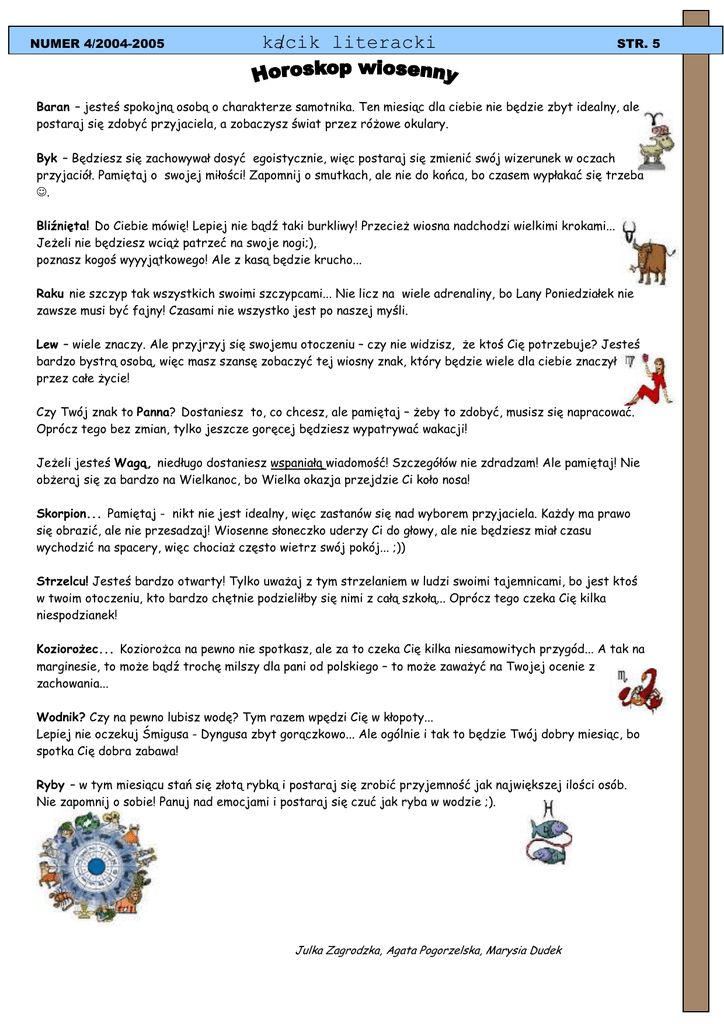 NUMER 4/2004-2005 kacik literacki STR. 5 Baran – jesteś spokojną osobą o charakterze samotnika. Ten miesiąc dla ciebie nie będzie zbyt idealny, ale postaraj się zdobyć przyjaciela, a zobaczysz świat przez różowe okulary. Byk – Będziesz się zachowywał dosyć egoistycznie, więc postaraj się zmienić swój wizerunek w oczach przyjaciół. Pamiętaj o swojej miłości! Zapomnij o smutkach, ale nie do końca, bo czasem wypłakać się trzeba ☺. Bliźnięta! Do Ciebie mówię! Lepiej nie bądź taki burkliwy! Przecież wiosna nadchodzi wielkimi krokami... Jeżeli nie będziesz wciąż patrzeć na swoje nogi;), poznasz kogoś wyyyjątkowego! Ale z kasą będzie krucho... Raku nie szczyp tak wszystkich swoimi szczypcami... Nie licz na wiele adrenaliny, bo Lany Poniedziałek nie zawsze musi być fajny! Czasami nie wszystko jest po naszej myśli. Lew – wiele znaczy. Ale przyjrzyj się swojemu otoczeniu – czy nie widzisz, że ktoś Cię potrzebuje? Jesteś bardzo bystrą osobą, więc masz szansę zobaczyć tej wiosny znak, który będzie wiele dla ciebie znaczył przez całe życie! Czy Twój znak to Panna? Dostaniesz to, co chcesz, ale pamiętaj – żeby to zdobyć, musisz się napracować. Oprócz tego bez zmian, tylko jeszcze goręcej będziesz wypatrywać wakacji! Jeżeli jesteś Wagą, niedługo dostaniesz wspaniałą wiadomość! Szczegółów nie zdradzam! Ale pamiętaj! Nie obżeraj się za bardzo na Wielkanoc, bo Wielka okazja przejdzie Ci koło nosa! Skorpion... Pamiętaj - nikt nie jest idealny, więc zastanów się nad wyborem przyjaciela. Każdy ma prawo się obrazić, ale nie przesadzaj! Wiosenne słoneczko uderzy Ci do głowy, ale nie będziesz miał czasu wychodzić na spacery, więc chociaż często wietrz swój pokój... ;)) Strzelcu! Jesteś bardzo otwarty! Tylko uważaj z tym strzelaniem w ludzi swoimi tajemnicami, bo jest ktoś w twoim otoczeniu, kto bardzo chętnie podzieliłby się nimi z całą szkołą... Oprócz tego czeka Cię kilka niespodzianek! Koziorożec... Koziorożca na pewno nie spotkasz, ale za to czeka Cię kilka niesamowitych przygód... A tak na marginesie, to może bądź trochę milszy dla pani od polskiego – to może zaważyć na Twojej ocenie z zachowania... Wodnik? Czy na pewno lubisz wodę? Tym razem wpędzi Cię w kłopoty... Lepiej nie oczekuj Śmigusa - Dyngusa zbyt gorączkowo... Ale ogólnie i tak to będzie Twój dobry miesiąc, bo spotka Cię dobra zabawa! Ryby – w tym miesiącu stań się złotą rybką i postaraj się zrobić przyjemność jak największej ilości osób. Nie zapomnij o sobie! Panuj nad emocjami i postaraj się czuć jak ryba w wodzie ;). Julka Zagrodzka, Agata Pogorzelska, Marysia Dudek