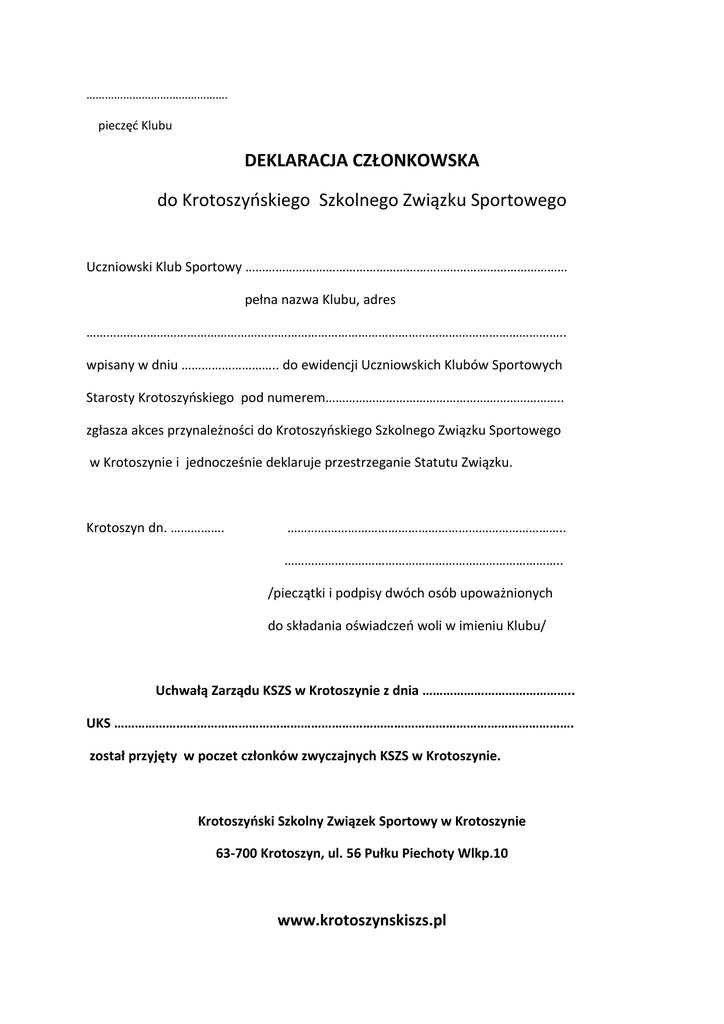 ………………………………………. pieczęć Klubu DEKLARACJA CZŁONKOWSKA do Krotoszyńskiego Szkolnego Związku Sportowego Uczniowski Klub Sportowy …………………………………………………………………………………… pełna nazwa Klubu, adres …………………………………………………………………………………………………………………………….. wpisany w dniu ……………………….. do ewidencji Uczniowskich Klubów Sportowych Starosty Krotoszyńskiego pod numerem…………………………………………………………….. zgłasza akces przynależności do Krotoszyńskiego Szkolnego Związku Sportowego w Krotoszynie i jednocześnie deklaruje przestrzeganie Statutu Związku. Krotoszyn dn. ……………. ……………………………………………………………………….. ……………………………………………………………………….. /pieczątki i podpisy dwóch osób upoważnionych do składania oświadczeń woli w imieniu Klubu/ Uchwałą Zarządu KSZS w Krotoszynie z dnia …………………………………….. UKS ……………………………………………………………………………………………………………………. został przyjęty w poczet członków zwyczajnych KSZS w Krotoszynie. Krotoszyński Szkolny Związek Sportowy w Krotoszynie 63-700 Krotoszyn, ul. 56 Pułku Piechoty Wlkp.10 www.krotoszynskiszs.pl
