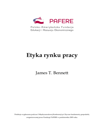 Etyka rynku pracy James T. Bennett Prelekcja wygłoszona podczas I Międzynarodowej Konferencji pt. Etyczne fundamenty gospodarki, zorganizowanej przez Fundację PAFERE w październiku 2003 roku. Program Polsko-Amerykańskiej Fundacji Edukacji i Rozwoju Ekonomicznego (PolishAmerican Foundation for Economic Research and Education) rozpoczyna się od fascynującej i bardzo głębokiej myśli załoŜyciela organizacji oraz jej przewodniczącego, Jana Michała Małka, który pisze: Nakaz „Nie kradnij!” w najszerszym jego znaczeniu stanowi fundamentalny i najwaŜniejszy imperatyw ekonomiczny. Stosowanie się do niego przez rządy i rządzonych to główny warunek postępu gospodarczego i pomyślności. PowyŜsze stwierdzenie zawiera waŜne idee dotyczące tego, co konstytuuje etyczny rynek pracy. JednakŜe etyka w moim rozumieniu idzie duŜo dalej, niŜ nakaz „nie kradnij”. OtóŜ wedle mojego rozumienia tego słowa etyka zajmuje się zbiorem zasad i wartości moralnych. W przypadku pracy oraz rynku usług pracowniczych mamy do czynienia z ludźmi oraz ich rolą jako zatrudnionych i pracowników w społeczeństwie. Tak zatem etyczny rynek pracy wymaga, by zatrudnieni i pracownicy najemni byli traktowani w sposób „moralny”, czyli zgodnie ze standardem „słusznego” postępowania. Jest rzeczą ciekawą a zarazem istotną, Ŝe wszystkie główne religie świata wyraŜają wielkie zatroskanie o biednych i potrzebujących – tych, którzy znajdują się na dole drabiny gospodarczej. Nieszczęśliwi spotykają się z wyrazami sympatii i pokrzepienia. I odwrotnie – większość religii patrzy na bogatych podejrzliwie. Wydaje się, Ŝe zamoŜni doskonale dadzą sobie radę w Ŝyciu, natomiast ubodzy potrzebują pomocy i zasługują na współczucie oraz stworzenie im moŜliwości poprawy swoich warunków. Przy takim podejściu do etyki rynku pracy musimy w pierwszym rzędzie zająć się tym, w jaki 2 sposób struktury instytucjonalne rynku pracy pomagają lub utrudniają Ŝycie biednym i nieszczęśliwym. Kiedy mówimy o strukturach instytucjonalnych, uwaga nasza kieruje się w stronę rządu, który ustanawia i wprowadza reguły gry gospodarczej na rynku pracy jak i teŜ na innych rynkach. Widać wyraźnie, Ŝe Jan Małek z podejrzliwością podchodzi do samego rządu, gdyŜ jego stwierdzenie, przytoczone powyŜej, wyraźnie sugeruje, iŜ rządy kradną, a okradanie biednych i nieszczęśliwych jest postępowaniem prawdziwie nagannym i pozbawionym skrupułów. Ponadto na całym świecie rządy demokratyczne, i nie tylko, ciągle podkreślają, Ŝe są przyjaciółmi biednych i nieszczęśliwych – ostatecznie biednych jest o wiele więcej niŜ zamoŜnych, stąd głoszenie czego innego oznaczałoby przyznanie się, iŜ znakomita większość ludności jest wykorzystywana przez tych stosunkowo nielicznych, którzy juŜ są bogaci. Rządy zawsze teŜ uwaŜają się za instytucje etyczne i moralne, szukające największego dobra dla największej ilości ludzi. Wszelako – jak sugeruje stwierdzenie Jana Małka – naleŜałoby dokładniej przyjrzeć się owym aspiracjom państwowym. Wiadomo Ŝe analiza prostych pojęć i badanie ich implikacji to bogate źródło wiedzy. Przypatrzmy się tedy, w jaki sposób rząd często funkcjonuje na rynku pracy. Po pierwsze, rząd często twierdzi, Ŝe „tworzy” miejsca pracy. Jest to działanie pozytywne i oczekiwane, które oferuje moŜliwości zatrudnienia. JednakŜe jak rząd moŜe czegoś podobnego dokonać? Miejsce pracy daje dochód i moŜliwości rozwoju, tj. 3 jest czymś, co posiada WARTOŚĆ. Miejsce pracy jest więc rzeczą WARTOŚCIOWĄ i stanowi pewien KAPITAŁ. Spójrzmy na to w następujący sposób: gdybym był bezrobotny i biedny, czy zgodziłbym się płacić co roku 10.000 dolarów za miejsce pracy, które dawałoby mi 50.000 dolarów rocznego dochodu? Oczywiście, Ŝe tak, poniewaŜ stawałbym się bogatszy o 40.000 dolarów. Zatem rząd będący w stanie TWORZYĆ miejsca pracy mógłby zwiększać swoje dochody poprzez SPRZEDAWANIE MIEJSC PRACY tym, którzy potrzebują zatrudnienia. Faktycznie, gdyby rząd potrafił stwarzać, poprzez uchwalanie ustaw i tworzenie regulacji, rzeczy posiadające WARTOŚĆ, odpadłaby potrzeba płacenia podatków. Dochody rządowe pochodziłyby ze sprzedaŜy kapitału tworzonego za pomocą ustaw i regulacji. Wszelako jeszcze Ŝadnemu rządowi nie przyniosła dochodów sprzedaŜ kapitału utworzonego przez ustawy i regulacje i to z bardzo prostego powodu: RZĄD NIE JEST W STANIE STWARZAĆ BOGACTWA. Doprawdy Ŝylibyśmy w cudownym świecie, gdyby tylko rząd umiał tworzyć bogactwo przez uchwalanie ustaw, które by następnie to bogactwo stworzyły. Nie byłoby biedy na świecie, wszyscy bylibyśmy bogaci, jako Ŝe nasi oświeceni politycy głosowaliby za tym, by stwarzać kapitał i nam go przekazywać! Rzecz jasna, rząd nie potrafi stwarzać bogactwa, miejsc pracy czy moŜliwości zatrudnienia dla swoich obywateli z niczego. Jedyne co najlepszy rząd potrafi, to 4 przemieszczać bogactwo lub miejsca pracy z jednej grupy społecznej do innej. Wynika stąd pierwsza krytyczna uwaga: rządy istnieją po to, by ZABIERAĆ jednej grupie społeczeństwa a DAWAĆ innym grupom. Niektóre jednostki na tym wygrywają – te, które miejsca pracy i dochody otrzymują, gdy rząd działa w kierunku „stwarzania” zatrudnienia, lecz inni na tym tracą – ci, którzy ponoszą cięŜar opłat, gdy zabiera im się ich kapitał, a daje komu innemu. Kolejną sprawą, którą musimy tu rozwaŜyć, jest kwestia tego, KTO ZYSKUJE A KTO TRACI, gdy państwo przekazuje bogactwo jednej grupy ludzi innej grupie. Rząd mówi nam, Ŝe naszą podstawową troską są biedni i zagubieni w społeczeństwie: bezrobotni, głodni, chorzy, bezdomni, nieszczęśliwi. Czy to jest jednak prawda? Dla przykładu, w Stanach Zjednoczonych, jak teŜ i w innych krajach, przez dziesiątki lat wydawano ogromne sumy na realizowanie naj