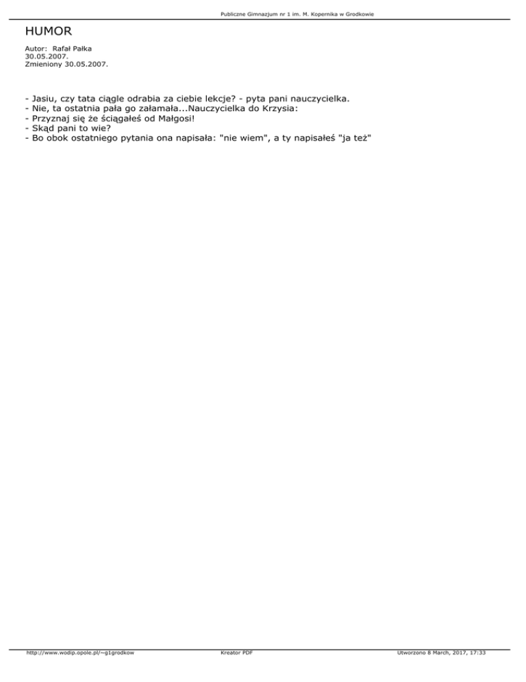 Publiczne Gimnazjum nr 1 im. M. Kopernika w Grodkowie HUMOR Autor: Rafał Pałka 30.05.2007. Zmieniony 30.05.2007. - Jasiu, czy tata ciągle odrabia za ciebie lekcje? - pyta pani nauczycielka. Nie, ta ostatnia pała go załamała...Nauczycielka do Krzysia: Przyznaj się że ściągałeś od Małgosi! Skąd pani to wie? Bo obok ostatniego pytania ona napisała: "nie wiem", a ty napisałeś "ja też" http://www.wodip.opole.pl/~g1grodkow Kreator PDF Utworzono 8 March, 2017, 17:33