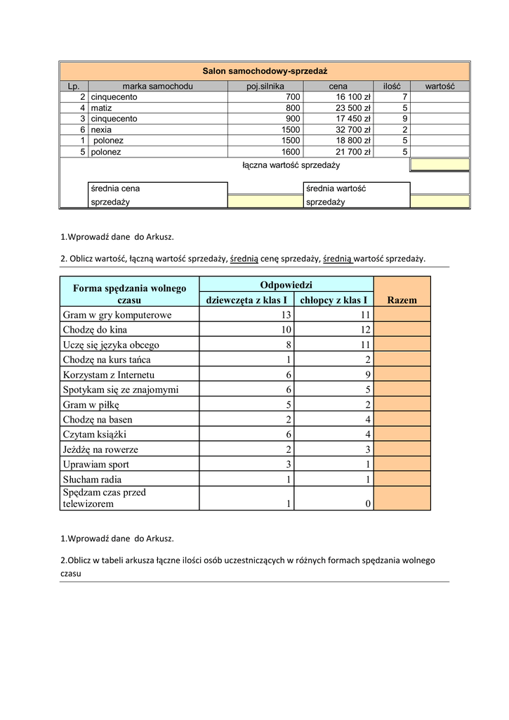 Salon samochodowy-sprzedaż Lp. 2 4 3 6 1 5 marka samochodu cinquecento matiz cinquecento nexia polonez polonez poj.silnika 700 800 900 1500 1500 1600 cena 16 100 zł 23 500 zł 17 450 zł 32 700 zł 18 800 zł 21 700 zł ilość wartość 7 5 9 2 5 5 łączna wartość sprzedaży średnia cena średnia wartość sprzedaży sprzedaży 1.Wprowadź dane do Arkusz. 2. Oblicz wartość, łączną wartość sprzedaży, średnią cenę sprzedaży, średnią wartość sprzedaży. Forma spędzania wolnego czasu Gram w gry komputerowe Chodzę do kina Uczę się języka obcego Chodzę na kurs tańca Korzystam z Internetu Spotykam się ze znajomymi Gram w piłkę Chodzę na basen Czytam książki Jeżdżę na rowerze Uprawiam sport Słucham radia Spędzam czas przed telewizorem Odpowiedzi dziewczęta z klas I chłopcy z klas I 13 11 10 12 8 11 1 2 6 9 6 5 5 2 2 4 6 4 2 3 3 1 1 1 1 Razem 0 1.Wprowadź dane do Arkusz. 2.Oblicz w tabeli arkusza łączne ilości osób uczestniczących w różnych formach spędzania wolnego czasu WYKAJ: 1. Poszerz kolumny 2. Dla tytułu wykonaj scalanie kilku komórek oraz wyśrodkowanie 3. Dla obu tabel wykonaj obramowanie i cieniowanie Zajęcia pozalekcyjne Godziny zajęć 00 14 00 15 00 16 1700 1630 30 17 00 17 1800 1900 2000 Rodzaj zajęć Język angielski Chór szkolny Basen Tenis Poniedzi Czwar Piąte ałek Wtorek Środa tek k chór szkolny język angielski tenis basen base n Kl. I a Kl. I b Kl. I c Raze m 12 5 6 23 5 11 3 7 4 8 12 26 2 3 1 6 1. Oblicz wartość y dla podanych wartości x y =x2 y = 0,5x y=x3 -5 -4 -3 -2 -1 0 1 2 3 4 5 Wynagrodzenie pracowników Magazynu wyrobów skórzanych w miesiącu marcu Ilość: Dziewc ząt Chopc ów Razem Ia Ib Ic Id 1 5 1 2 1 3 1 6 1 6 1 2 1 3 1 6 II a 1 5 1 5 II b 1 8 1 6 II c 1 2 1 4 II III III III III d a b c d 1 1 1 1 1 3 6 6 4 7 1 1 1 1 1 7 6 5 3 2 Łączna ilość uczniów w szkole 1.Wprowadź dane do Arkusza 2. Oblicz łączne ilości dziewcząt i chłopców w klasach oraz łączną ilość osób w szkole. Nazwiska Ilość Wartość Stawka za i imiona przepracowan pracy godzinę pracownik ych godzin w miesięczn pracy ów miesiącu ej Adamski 16,00 zł 160 Jan Barański 16,00 zł 220 Jerzy Czerkaws 12,00 zł 160 ki Damian Dudek 15,00 zł 120 Mateusz Figurska 16,00 zł 80 Lidia Gruszka 15,00 zł 79 Jerzy Jarewski 14,00 zł 90 Kamil Koremba 18,00 zł 110 Henryk Ludwicki 18,00 zł 190 Cezary Porecka 14,00 zł 230 Danuta Rafalski 17,00 zł 249 Lech Żumowski 12,00 zł 120 Artur Razem 1.Wprowadź dane do Arkusza 2.Oblicz wynagrodzenia miesięczne dla poszczególnych pracowników oraz łączną wartość wszystkich wynagrodzeń