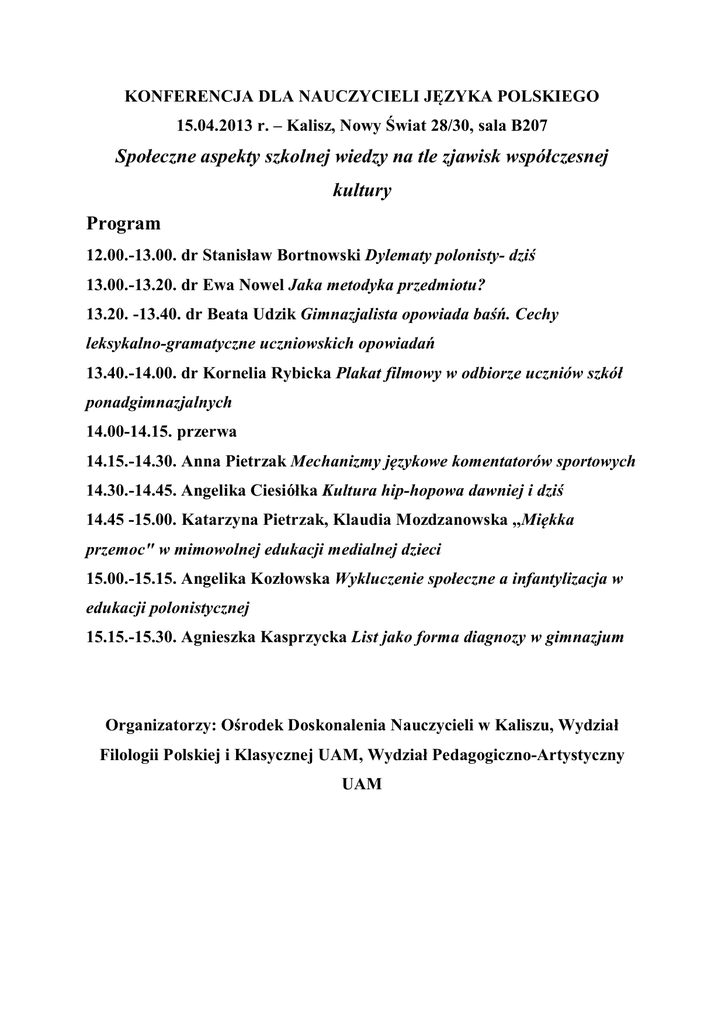 KONFERENCJA DLA NAUCZYCIELI J ZYKA POLSKIEGO 15.04.2013 r. – Kalisz, Nowy wiat 28/30, sala B207 Spo eczne aspekty szkolnej wiedzy na tle zjawisk wspó czesnej kultury Program 12.00.-13.00. dr Stanis aw Bortnowski Dylematy polonisty- dzi 13.00.-13.20. dr Ewa Nowel Jaka metodyka przedmiotu? 13.20. -13.40. dr Beata Udzik Gimnazjalista opowiada ba . Cechy leksykalno-gramatyczne uczniowskich opowiada 13.40.-14.00. dr Kornelia Rybicka Plakat filmowy w odbiorze uczniów szkó ponadgimnazjalnych 14.00-14.15. przerwa 14.15.-14.30. Anna Pietrzak Mechanizmy j zykowe komentatorów sportowych 14.30.-14.45. Angelika Ciesió ka Kultura hip-hopowa dawniej i dzi 14.45 -15.00. Katarzyna Pietrzak, Klaudia Mozdzanowska ,,Mi kka przemoc" w mimowolnej edukacji medialnej dzieci 15.00.-15.15. Angelika Koz owska Wykluczenie spo eczne a infantylizacja w edukacji polonistycznej 15.15.-15.30. Agnieszka Kasprzycka List jako forma diagnozy w gimnazjum Organizatorzy: O rodek Doskonalenia Nauczycieli w Kaliszu, Wydzia Filologii Polskiej i Klasycznej UAM, Wydzia Pedagogiczno-Artystyczny UAM