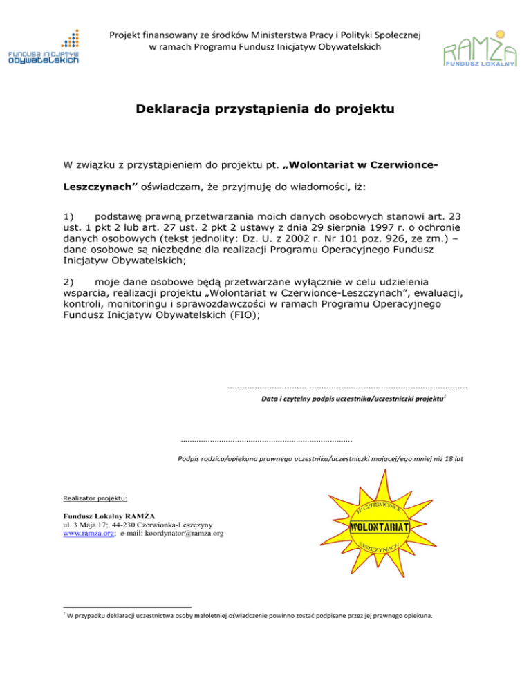 Projekt finansowany ze środków Ministerstwa Pracy i Polityki Społecznej w ramach Programu Fundusz Inicjatyw Obywatelskich Deklaracja przystąpienia do projektu W związku z przystąpieniem do projektu pt. „Wolontariat w CzerwionceLeszczynach” oświadczam, że przyjmuję do wiadomości, iż: 1) podstawę prawną przetwarzania moich danych osobowych stanowi art. 23 ust. 1 pkt 2 lub art. 27 ust. 2 pkt 2 ustawy z dnia 29 sierpnia 1997 r. o ochronie danych osobowych (tekst jednolity: Dz. U. z 2002 r. Nr 101 poz. 926, ze zm.) – dane osobowe są niezbędne dla realizacji Programu Operacyjnego Fundusz Inicjatyw Obywatelskich; 2) moje dane osobowe będą przetwarzane wyłącznie w celu udzielenia wsparcia, realizacji projektu „Wolontariat w Czerwionce-Leszczynach”, ewaluacji, kontroli, monitoringu i sprawozdawczości w ramach Programu Operacyjnego Fundusz Inicjatyw Obywatelskich (FIO); ................................................................................................. 1 Data i czytelny podpis uczestnika/uczestniczki projektu …………………………………………………………………. Podpis rodzica/opiekuna prawnego uczestnika/uczestniczki mającej/ego mniej niż 18 lat Realizator projektu: Fundusz Lokalny RAMŻA ul. 3 Maja 17; 44-230 Czerwionka-Leszczyny www.ramza.org; e-mail: [email protected] 1 W przypadku deklaracji uczestnictwa osoby małoletniej oświadczenie powinno zostać podpisane przez jej prawnego opiekuna.