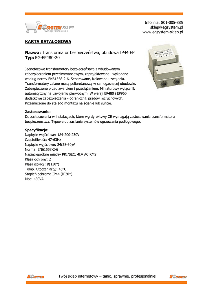 Infolinia: 801-005-885 [email protected] www.egsystem-sklep.pl KARTA KATALOGOWA Nazwa: Transformator bezpieczeństwa, obudowa IP44 EP Typ: EG-EP480-20 Jednofazowe transformatory bezpieczeństwa z wbudowanym zabezpieczeniem przeciwzwarciowym, zaprojektowane i wykonane według normy EN61558-2-6. Separowane, izolowane uzwojenia. Transformatory zalane masą poliuretanową w samogasnącej obudowie. Zabezpieczone przed zwarciem i przeciążeniem. Miniaturowy wyłącznik automatyczny na uzwojeniu pierwotnym. W wersji EP480 i EP960 dodatkowe zabezpieczenia - ogranicznik prądów rozruchowych. Przeznaczone do stałego montażu na ścianie lub suficie. Zastosowanie: Do zastosowania w instalacjach, które wg dyrektywy CE wymagają zastosowania transformatora bezpieczeństwa. Typowe do zasilania systemów ogrzewania podłogowego. Specyfikacja: Napięcie wejściowe: 184-200-230V Częstotliwość: 47-63Hz Napięcie wyjściowe: 24(28-30)V Norma: EN61558-2-6 Napięciepróbne między PRI/SEC: 4kV AC RMS Klasa ochrony: 2 Klasa izolacji: B(130°) Temp. Otoczenia(ta): 45°C Stopień ochrony: IP44 (IP20*) Moc: 480VA Twój sklep internetowy – tanio, sprawnie, profesjonalnie! Infolinia: 801-005-885 [email protected] www.egsystem-sklep.pl Wymiary/waga: A = 130mm B = 202mm C = 115mm Waga = 7,9kg Układ połączeń: Program standardowy: Napięcie SEC: 24(28-30)V Prąd SEC 20A Moc: 480VA Twój sklep internetowy – tanio, sprawnie, profesjonalnie!