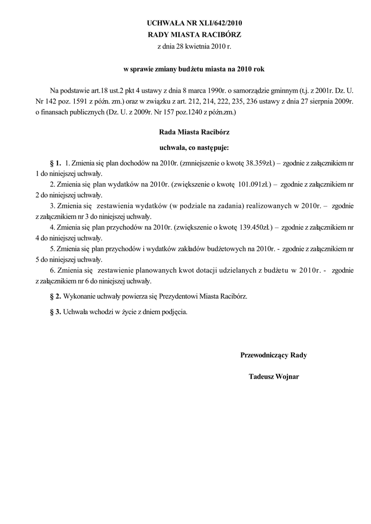UCHWAŁA NR XLI/642/2010 RADY MIASTA RACIBÓRZ z dnia 28 kwietnia 2010 r. w sprawie zmiany budżetu miasta na 2010 rok Na podstawie art.18 ust.2 pkt 4 ustawy z dnia 8 marca 1990r. o samorządzie gminnym (t.j. z 2001r. Dz. U. Nr 142 poz. 1591 z późn. zm.) oraz w związku z art. 212, 214, 222, 235, 236 ustawy z dnia 27 sierpnia 2009r. o finansach publicznych (Dz. U. z 2009r. Nr 157 poz.1240 z późn.zm.) Rada Miasta Racibórz uchwala, co następuje: § 1. 1. Zmienia się plan dochodów na 2010r. (zmniejszenie o kwotę 38.359zł.) – zgodnie z załącznikiem nr 1 do niniejszej uchwały. 2. Zmienia się plan wydatków na 2010r. (zwiększenie o kwotę 101.091zł.) – zgodnie z załącznikiem nr 2 do niniejszej uchwały. 3. Zmienia się zestawienia wydatków (w podziale na zadania) realizowanych w 2010r. – zgodnie z załącznikiem nr 3 do niniejszej uchwały. 4. Zmienia się plan przychodów na 2010r. (zwiększenie o kwotę 139.450zł.) – zgodnie z załącznikiem nr 4 do niniejszej uchwały. 5. Zmienia się plan przychodów i wydatków zakładów budżetowych na 2010r. - zgodnie z załącznikiem nr 5 do niniejszej uchwały. 6. Zmienia się zestawienie planowanych kwot dotacji udzielanych z budżetu w 2010r. - zgodnie z załącznikiem nr 6 do niniejszej uchwały. § 2. Wykonanie uchwały powierza się Prezydentowi Miasta Racibórz. § 3. Uchwała wchodzi w życie z dniem podjęcia. Przewodniczący Rady Tadeusz Wojnar UZASADNIENIE 1. Zmiany planu dochodów dokonuje się w związku z: 1) w dziale 801 – otrzymaniem przez Szkołę Podstawową Nr 1 grantu na realizację projektu "Jestem Eko jestem trendy"; 2) w dziale 853 - otrzymaniem informacji z Powiatu o zmniejszeniu wysokości dofinansowania działalności Warsztatów Terapii Zajęciowej; 3) w dziale 900 – realizacją dochodów w Arboretum Bramy Morawskiej – z tytułu najmu i dzierżawy oraz sprzedaży drewna na opał; 4) pozostałe zmiany wynikają ze zmiany Rozporządzenia Ministra Finansów w sprawie szczegółowej klasyfikacji dochodów, wydatków, przychodów i rozchodów oraz środków pochodzących ze źródeł UZASADNIENIE 1. Zmiany planu dochodów dokonuje się w związku z: 1) w dziale 801 – otrzymaniem przez Szkołę Podstawową Nr 1 grantu na realizację projektu "Jestem Eko jestem trendy"; 2) w dziale 853 - otrzymaniem informacji z Powiatu o zmniejszeniu wysokości dofinansowania działalności Warsztatów Terapii Zajęciowej; 3) w dziale 900 – realizacją dochodów w Arboretum Bramy Morawskiej – z tytułu najmu i dzierżawy oraz sprzedaży drewna na opał; 4) pozostałe zmiany wynikają ze zmiany Rozporządzenia Ministra Finansów w sprawie szczegółowej klasyfikacji dochodów, wydatków, przychodów i rozchodów oraz środków pochodzących ze źródeł zagranicznych. Zmiany dotyczą klasyfikacji dofinansowania otrzymanego ze środków Unii Europejskiej oraz dochodów z tytułu zwrotu wypłaconych zaliczek alimentacyjnych. 2. Zmiany planu wydatków oraz zestawienia wydatków (w podziale na zadania) na 2010r. dokonuje się w celu zabezpieczenia środków na: 1) w dziale 700: a) dotację dla Miejskiego Zarządu Budynków na „Remont budynku przy ul. Solnej 17” oraz „Wydatki poniesione na akcję zima”. Zabezpieczenia środków na realizację tych zadań dokonuje się poprzez przesunięcie środków z zadań „Remont budynku – kotwienie ścian ul. Solna 23” oraz „Koszty utrzymania terenów przydomowych”, b) uzupełnienie środków na opłaty geodezyjne i koszty postępowań sądowych; 2) w dziale 801 - realizację przez Szkołę Podstawową Nr 1 projektu "Jestem Eko - jestem trendy"; 3) w dziale 900 - zakup usług (cięcia sanitarne drzew) w Arboretum Bramy Morawskiej; 4) w dziale 921 - pozostałe wydatki z zakresu kultury i ochrony dziedzictwa narodowego, w tym na: I Raciborski Meeting Muzyczny, otwarcie Raciborskiego Centrum Kultury, obchody 20 - lecia Samorządu; 5) w dziale 926 - pozostałe wydatki z zakresu kultury fizycznej i sportu, w tym: 13.000zł. - na nagrody dla sportowców z tytułu osiągnięcia wysokich wyników (przesunięcie środków z działu 750) oraz 50.000zł. na współorganizację 53 Memoriału Władysława Pytlasińskiego w zapasach w stylu klasycznym. 3. Zmniejszenia w dziale 853 dokonuje się po otrzymaniu informacji z Powiatu o zmniejszeniu wysokości dofinansowania działalności Warsztatów Terapii Zajęciowej. 4. Zmiany planu po stronie przychodów dokonuje się w związku z wyższą od planowanej wysokością wolnych środków z lat poprzednich. 5. Zmiany załącznika dotyczącego planu przychodów i wydatków zakładów budżetowych dokonuje się w związku z wcześniej dokonanymi zmianami w planie wydatków oraz w związku ze zmianą kalkulacji dotacji przedmiotowych. 6. Zmiany zestawienia planowanych kwot dotacji udzielanych z budżetu w 2010r. dokonuje się w związku z wcześniej dokonanymi zmianami w planie wydatków - zwiększenie dotacji dla Raciborskiego Centrum Kultury na otwarcie wyremontowanego budynku RCK oraz na obchody 20 - lecia Samorządu. Załączniki binarne Załącznik nr 1 do Uchwały z dnia 28 kwietnia 2010 r. Zmiana planu dochodów na 2010r. Zalacznik1.xls Załącznik nr 2 do Uchwały z dnia 28 kwietnia 2010 r. Zmiana planu wydatków na 2010r. Zalacznik2.xls Załącznik nr 3 do Uchwały z dnia 28 kwietnia 2010 r. Zmiana zestawienia wydatków (w podziale na zadania) realizowanych w 2010r. Zalacznik3.xls Załącznik nr 4 do Uchwały z dnia 28 kwietnia 2010 r. Zmiana planu przychodów na 2010r. Zalacznik4.xls Załącznik nr 5 do Uchwały z dnia 28 kwietnia 2010 r. Plany przychodów i wydatków zakładów budżetowych na 2010r. Zalacznik5.xls Załącznik nr 6 do Uchwały z dnia 28 kwietnia 2010 r. Zmiana zestawienia planowanych kwot dotacji udzielanych z budżetu w 2010r. Zalacznik6.xls