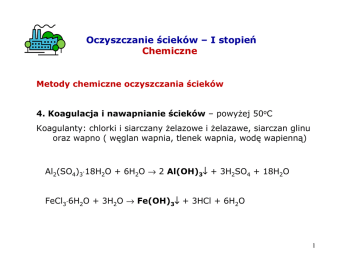 Oczyszczanie ścieków – I stopień Chemiczne Metody chemiczne oczyszczania ścieków 4. Koagulacja i nawapnianie ścieków – powyŜej 50oC Koagulanty: chlorki i siarczany Ŝelazowe i Ŝelazawe, siarczan glinu oraz wapno ( węglan wapnia, tlenek wapnia, wodę wapienną) Al2(SO4)3⋅18H2O + 6H2O → 2 Al(OH)3↓ + 3H2SO4 + 18H2O FeCl3⋅6H2O + 3H2O → Fe(OH)3↓ + 3HCl + 6H2O 1 Oczyszczanie ścieków – I stopień Chemiczne 5. Usuwanie fosforanów. Fosfor moŜna usuwać w róŜnych miejscach ciągu technologicznego oczyszczalni ścieków: wstępne w osadniku, równoczesne – z biologicznym oczyszczaniem, wtórne – po biologicznym oczyszczaniu. Sole glinu, Ŝelaza i wapnia powodują tworzenie i wytrącanie praktycznie nierozpuszczalnych fosforanów. 2 Oczyszczanie ścieków – I stopień Chemiczne Al2(SO4)3⋅18H2O + 2PO43- → 2 AlPO4↓ + 3SO42- + 18H2O FeCl3⋅6H2O +2PO43- → FePO4↓ + 3Cl- + 6H2O 2Ca(OH)2 +HPO42- → Ca2HPO4(OH)2 ↓ + 2OH- 3 Oczyszczanie ścieków – I stopień Chemiczne 7. Zobojętnianie ścieków ścieki kwaśne zobojętnia się: - mieszając z zasadowymi ściekami - neutralizując je chemikaliami - przepuszczając przez złoŜa zasadowe, filtry wypełnione np.CaCO3, MgO lub dolomitem - wpuszczając je do stawów aeracyjnych z moŜliwością kilkudniowego przetrzymania - rozcieńczając je wodą rzeczną o odczynie lekko zasadowym lub nawet obojętnym. ścieki o odczynie zasadowym: - przez przepuszczanie przez nie gazów spalinowych - przez neutralizację kwasami - przez przesączenie ich przez filtr gruntowy 4 Oczyszczanie ścieków – II i III stopień Biologiczne Biologiczne oczyszczanie ścieków w środowisku wodnym: We wszystkich metodach biologicznego oczyszczania ścieków zachodzą następujące procesy: 1. rozkład substancji organicznych do CO2, H2O i NH3 2. nitryfikacja, czyli utlenienie NH3 za pomocą mikroorganizmów ( bakterii) do azotynów, a następnie do azotanów, 3. denitryfikacja, czyli przemiana azotanów do postaci azotu cząsteczkowego N2 5 Oczyszczanie ścieków – II stopień Biologiczne 1.Rozkład substancji organicznych do CO2, H2O i NH3 Równanie bezpośredniego utleniania [CH2O] + O2 CO2 + H2O [CH2O] jest zastępczą formułą zanieczyszczeń organicznych [NH2CH2OH] + O2 CO2 + H2O + NH3 6 Oczyszczanie ścieków – II stopień Biologiczne Cd. 1 Równanie syntezy nowych komórek (asymilacji) 6[CH2O] + NH3 + O2 → C5H7O2N + CO2 + 4H2O gdzie (C5H7O2N) statystyczny ustalony, zastępczy wzór chemiczny dla mikroorganizmów Utlenianie syntezowanej substancji komórkowej: C5H7O2N + 5O2 → 5CO2 + 2H2O + NH3 7 Oczyszczanie ścieków – II stopień Biologiczne 2.Nitryfikacja, czyli utlenienie NH3 za pomocą bakterii Nitrosomonas do azotynów, a następnie za pomocą bakterii Nitrobacter do azotanów NH3 + 2O2 → HNO3 + H2O 8 Oczyszczanie ścieków – III stopień Biologiczne 3.Denitryfikacja - usuwanie azotanów ze ścieków za pomocą mikroorganizmów. Przykładowy przebieg denitryfikacji przedstawia w wielkim uproszczeniu następujące równanie: 4HNO3 + 5[CH2O] 2N2 + 5CO2 + 7H2O 9 Oczyszczanie ścieków – II i III stopień Biologiczne Układ oczyszczania ścieków z wydzieloną komorą denitryfikacji po komorze napowietrzania (komorze aeracji) 10 Oczyszczanie ścieków – II stopień Biologiczne Mikroorganizmy, stosowane w oczyszczaniu ścieków mogą występować jako skupisko w postaci błony biologicznej lub osadu czynnego. Biologiczne oczyszczanie ścieków zachodzi w: 1. komorach napowietrzania z osadem czynnym, 2. na złoŜach biologicznych, 3. w glebie 4. stawach biologicznych (stabilizacyjnych, napowietrzanych, rybnych). 11 Oczyszczanie ścieków – II stopień Biologiczne 1. Komory napowietrzania z osadem czynnym Schemat stopnia oczyszczania biologicznego w komorach napowietrzania z osadem czynnym. 12 Oczyszczanie ścieków – II stopień Biologiczne 2. Oczyszczanie ścieków na złoŜach biologicznych ZłoŜa biologiczne są zbiornikami wypełnionymi luźno ułoŜonym materiałem ziarnistym i porowatym. Rodzaje wypełnień: naturalne – materiał pobrany z dna rzek,kruszywa- ŜuŜel, koks, kamienie. Sztuczne: kształtki z polistyrenu, PCW, poliamidu itp.. NajwaŜniejszą warstwą w złoŜu jest błona biologiczna. 13 Oczyszczanie ścieków – II stopień Biologiczne 14 Oczyszczanie ścieków – II stopień Biologiczne 3. Oczyszczanie ścieków w glebie 15 Oczyszczanie ścieków – II stopień Biologiczne 4. Uszczelnione zbiorniki z roślinnością pływającą. Oczyszczalnie hydrobotaniczne Urządzenia techniczne, które wykorzystują rośliny bagienne i pływające do oczyszczania ścieków. 16 Oczyszczanie ścieków Dezynfekcja Dezynfekcja • Celem dezynfekcji jest zniszczenie Ŝywych i przetrwalnikowych form organizmów patogennych oraz zabezpieczenie wody przed wtórnym rozwojem organizmów Ŝywych, głównie bakterii. • Dezynfekcja jest najczęściej stosowana na końcu układu oczyszczania. Fizyczne metody dezynfekcji wody • Gotowanie i pasteryzacja wody • Promieniowanie ultrafioletowe • Ultradźwięki Chemiczne metody dezynfekcji wody • Chlorowanie (chlor, podchloryn sodowy, dwutlenek chloru, chloroaminy) • Ozonowanie • Dezynfekcja bromem lub jodem 17 Oczyszczanie ścieków – IV stopień Odnowa wody Zanieczyszczenia refrakcyjne są to zanieczyszczenia chemiczne, które nie podlegają bądź podlegają jedynie w minimalnym stopniu rozkładowi biologicznemu za pośrednictwem mikroorganizmów: •substancje mineralne takie jak metale cięŜkie •niektóre substancje powierzchniowo czynne – szczególnie kationowe •środki owadobójcze (insektycydy) głownie z grupy związków chloroorganicznych (np.: DDT) •pestycydy •wielopierścieniowe węglowodory aromatyczne (np.: benzopiren) •aminy aromatyczne (np.: aminonaftalen, aminostilben) •nitrozoaminy (np.:nitrozodimetyloamina - NDMA) •polichlorowane dwufenyle (PCB) •dioksyny •substancje promieniotwórcze 18 Oczyszczanie 