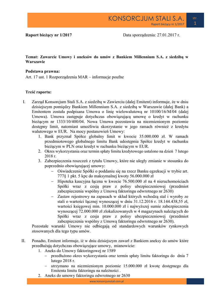 KONSORCJUM STALI S.A. Raport bieżący nr 1/2017 Raport bieżący nr 1/2017 Data sporządzenia: 27.01.2017 r. Temat: Zawarcie Umowy i aneksów do umów z Bankiem Millennium S.A. z siedzibą w Warszawie Podstawa prawna: Art. 17 ust. 1 Rozporządzenia MAR – informacje poufne Treść raportu: I. Zarząd Konsorcjum Stali S.A. z siedzibą w Zawierciu (dalej Emitent) informuje, że w dniu dzisiejszym pomiędzy Bankiem Millennium S.A. z siedzibą w Warszawie (dalej Bank) a Emitentem została podpisana Umowa o linię wielowalutową nr 10100/16/M/04 (dalej Umowa). Umowa zastępuje dotychczas obowiązującą umowę o kredyt w rachunku bieżącym nr 1333/10/400/04. Nowa Umowa pozostawia na niezmienionym poziomie dostępny limit, natomiast umożliwia skorzystanie w jego ramach również z kredytu walutowego w EUR. Na mocy postanowień Umowy: 1. Bank przyznał Spółce globalny limit w kwocie 35.000.000 zł. W ramach przedmiotowego globalnego limitu Bank udostępnia Spółce kredyt w rachunku bieżącym w PLN oraz kredyt w rachunku bieżącym w EUR. 2. Okres wykorzystania oraz termin spłaty limitu kredytowego ustalono na dzień 7 lutego 2018 r. 3. Zabezpieczenia roszczeń z tytułu Umowy, które nie uległy zmianie w stosunku do poprzednio obowiązującej umowy: Oświadczenie Spółki o poddaniu się na rzecz Banku egzekucji w trybie art. 777§ 1 pkt. 5 kpc do maksymalnej kwoty 56.000.000 zł Hipoteka kaucyjna łączna w kwocie 76.500.000 zł na 4 nieruchomościach Spółki wraz z cesją praw z polisy ubezpieczeniowej (przedmiot zabezpieczenia wspólny z Umową faktoringu odwrotnego nr 2630) Zastaw rejestrowy na zapasach w skład których wchodzą stal i wyroby ze stali o wartości łącznej wynoszącej w dniu 31.12.2016 r. 18.144.438,55 zł, wartości księgowej min. 10.000.000 zł i najwyższej sumie zabezpieczenia wynoszącej 72.000.000 zł zlokalizowanych w 4 magazynach należących do Spółki wraz z cesja praw z polisy ubezpieczeniowej (przedmiot zabezpieczenia wspólny z Umową faktoringu odwrotnego nr 2630). Pozostałe warunki Umowy nie odbiegają od standardowych warunków rynkowych stosowanych dla tego typu umów. II. Ponadto, Emitent informuje, iż w dniu dzisiejszym zawarł z Bankiem aneksy do umów które przedłużają dotychczas obowiązujące umowy, mianowicie: 1. Aneks do Umowy faktoringowej nr 1589 przedłużono okres wykorzystania oraz termin spłaty limitu faktoringu do dnia 7 lutego 2018 r. utrzymano na niezmienionym poziomie 15.000.000 zł kwotę dostępnego dla Emitenta limitu faktoringu na należności . 2. Aneks do umowy faktoringu odwrotnego nr 2630 www.konsorcjumstali.com.pl str. 1 KONSORCJUM STALI S.A. Raport bieżący nr 1/2017 przedłużono okres wykorzystania oraz termin spłaty limitu faktoringu odwrotnego do dnia 7 lutego 2018 r. utrzymano na niezmienionym poziomie 10.000.000 zł kwotę dostępnego dla Emitenta limitu faktoringu odwrotnego. 3. Aneks do Umowy ramowej w zakresie zawierania transakcji skarbowych w Banku wraz z umową przewłaszczenia kwot pieniężnych nr 5630/14/410/04 przedłużono okres wykorzystania oraz termin spłaty limitu na zawieranie transakcji skarbowych do dnia 7 lutego 2018 r. utrzymano na niezmienionym poziomie 5.000.000 zł kwotę dostępnego dla Emitenta limitu na zawieranie transakcji skarbowych Pozostałe warunki umów nie uległy istotnym zmianom i nie odbiegają od standardowych warunków rynkowych stosowanych dla tego typu umów. Emitent informował o ww. umowach i aneksach do umów w raportach bieżących nr 17/2010 z dnia 24.06.2010r., nr 31/2011 z dnia 17.06.2011r., nr 23/2012 z dnia 19.06.2012 r., nr 14/2013 z dnia 22.06.2013 r., nr 21/2013 z dnia 23.07.2013 r., nr 1/2014 z dnia 14.01.2014 r. , 1/2015 z dnia 16.01.2015 r. oraz 3/2016 z dnia 03.02.2016 r. III. Wyżej wymienione w pkt. I i II umowy z Bankiem stanowią jedno ze znaczących źródeł finansowania majątku obrotowego i bieżącej działalności Emitenta. www.konsorcjumstali.com.pl str. 2