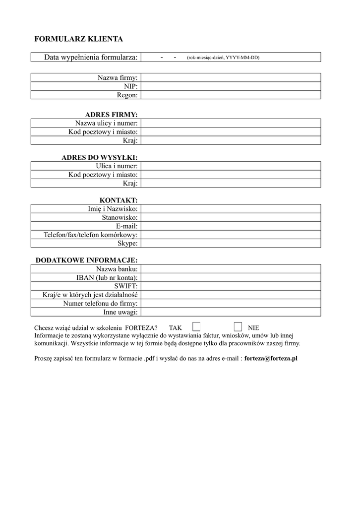 FORMULARZ KLIENTA Data wypełnienia formularza: - - (rok-miesiąc-dzień, YYYY-MM-DD) Nazwa firmy: NIP: Regon: ADRES FIRMY: Nazwa ulicy i numer: Kod pocztowy i miasto: Kraj: ADRES DO WYSYŁKI: Ulica i numer: Kod pocztowy i miasto: Kraj: KONTAKT: Imię i Nazwisko: Stanowisko: E-mail: Telefon/fax/telefon komórkowy: Skype: DODATKOWE INFORMACJE: Nazwa banku: IBAN (lub nr konta): SWIFT: Kraj/e w których jest działalność Numer telefonu do firmy: Inne uwagi: Chcesz wziąć udział w szkoleniu FORTEZA? TAK NIE Informacje te zostaną wykorzystane wyłącznie do wystawiania faktur, wniosków, umów lub innej komunikacji. Wszystkie informacje w tej formie będą dostępne tylko dla pracowników naszej firmy. Proszę zapisać ten formularz w formacie .pdf i wysłać do nas na adres e-mail : [email protected]